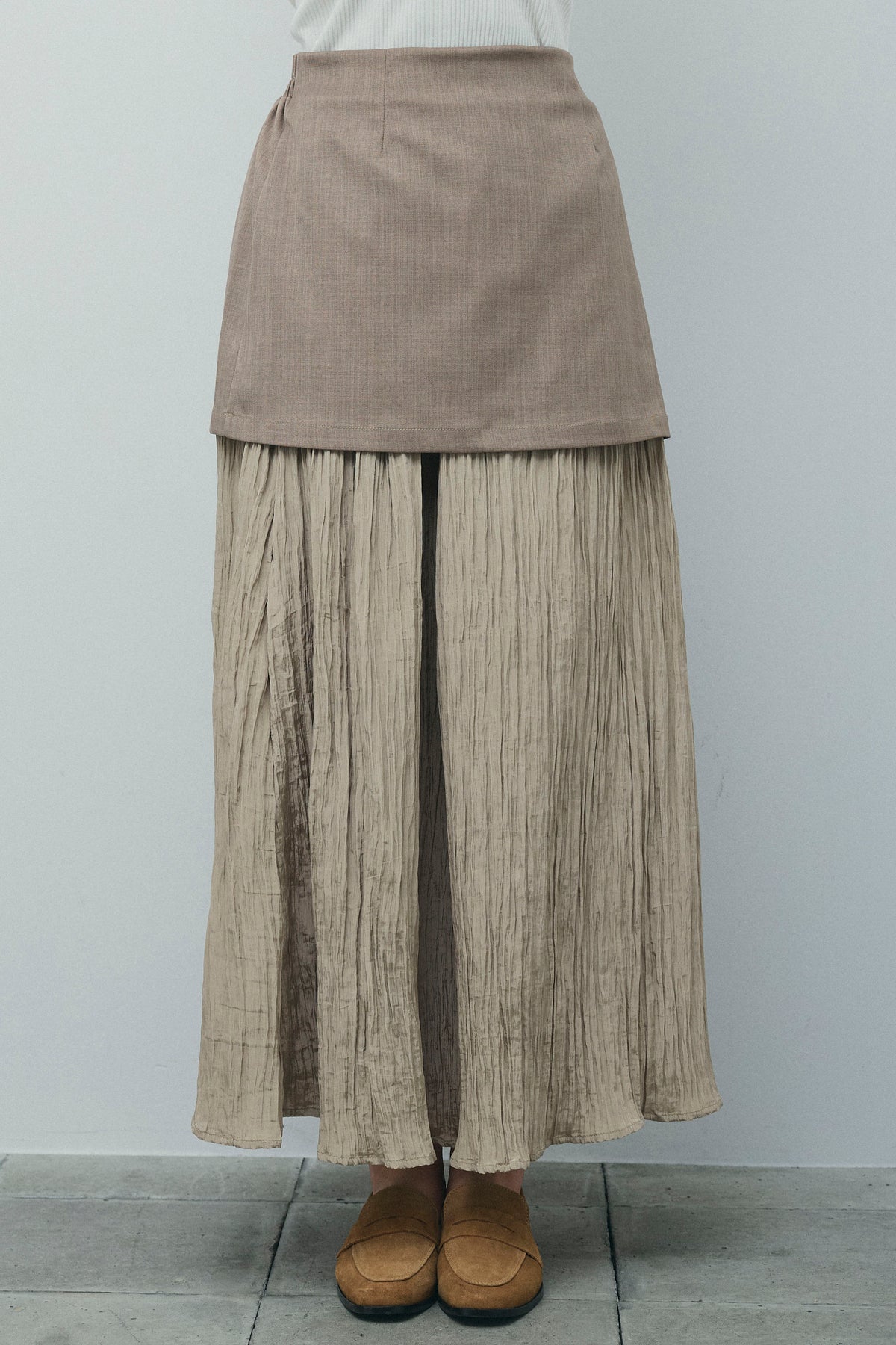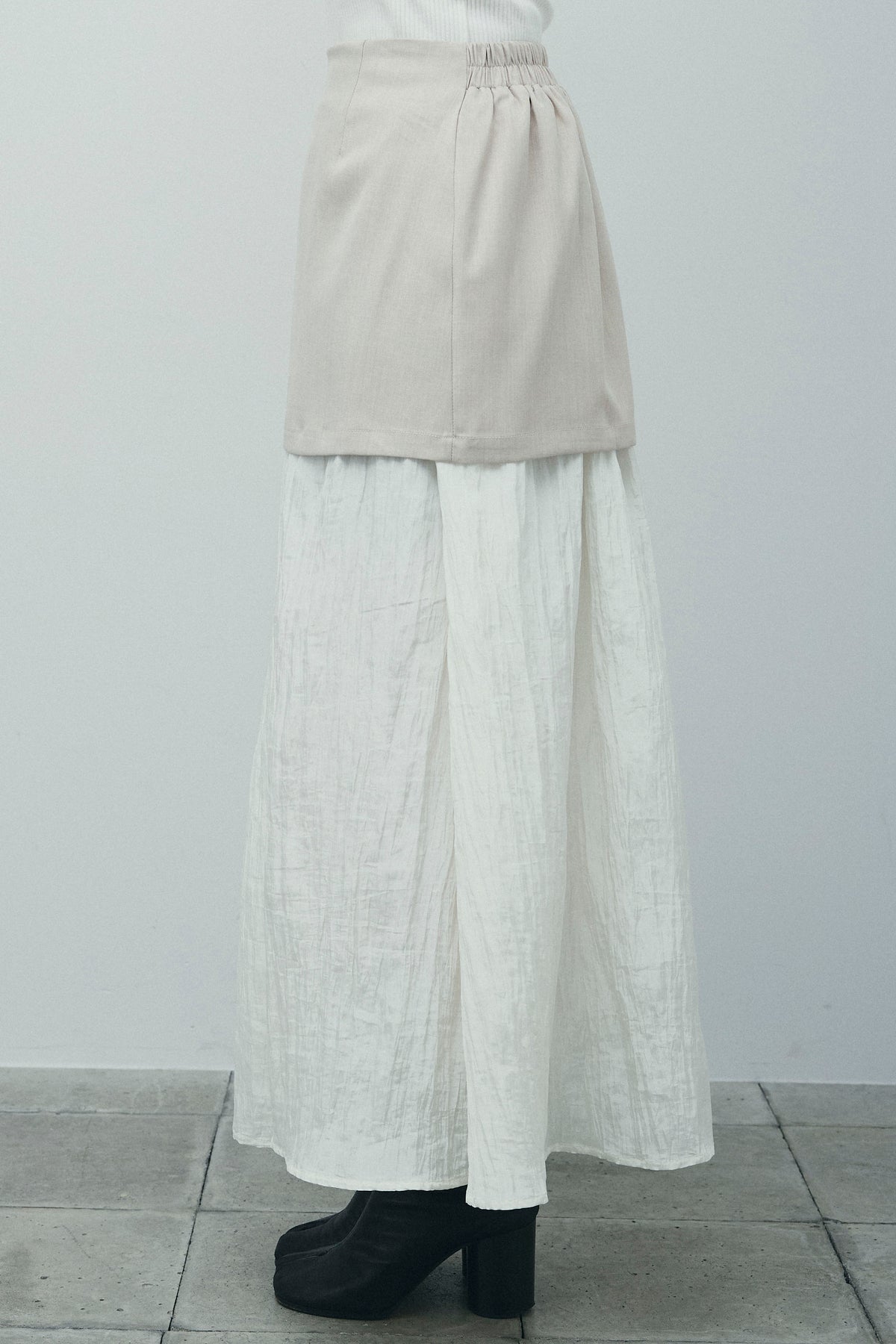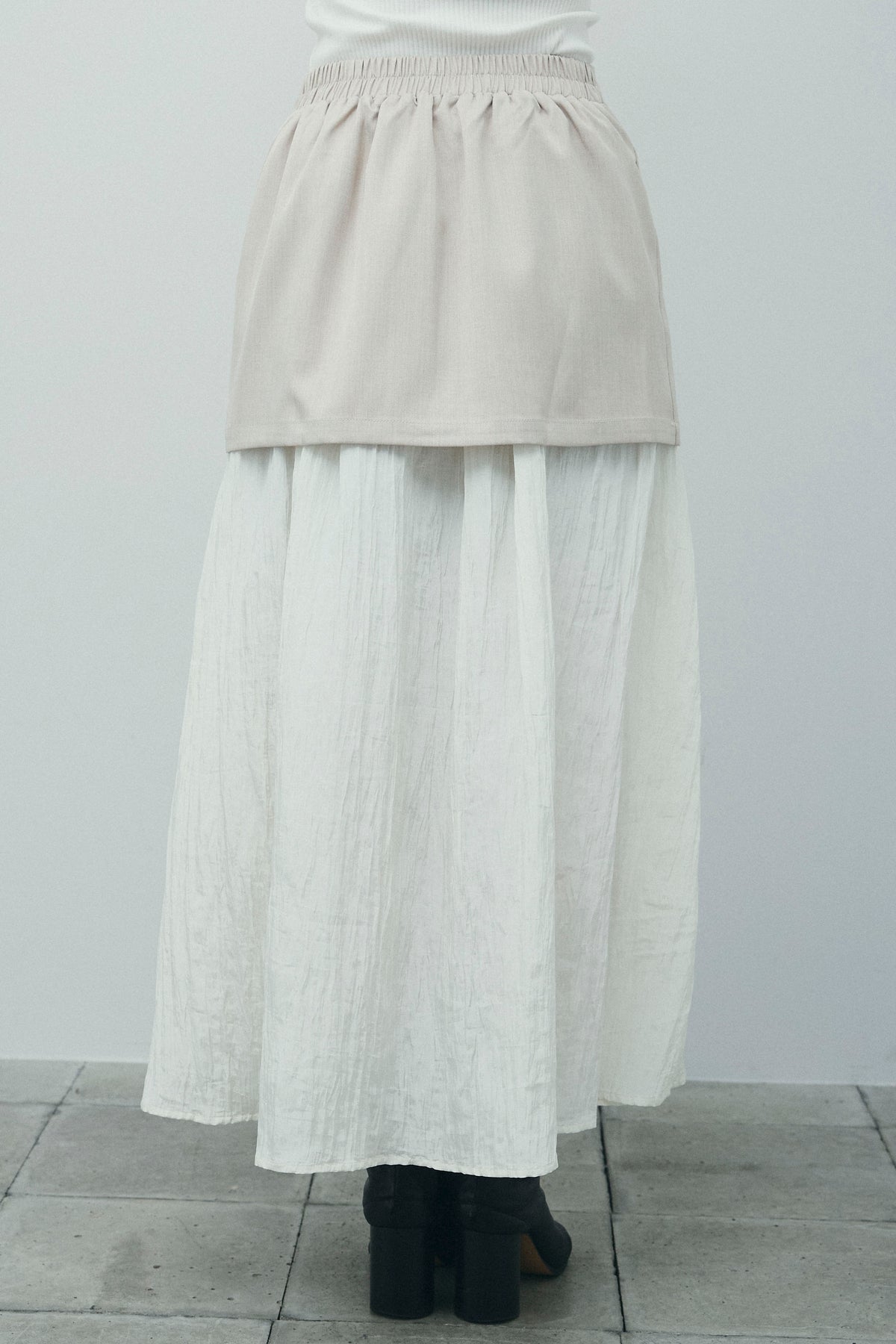 異素材のレイヤードデザインが魅力的なスカート。ウエスト部分はゴム仕様で、リラックスしたフィット感を提供します。シンプルながらもスタイリッシュで、タウンユースにぴったりなアイテムです。 下層のシアー素材が軽やかさを演出し、動きのあるデザインが特徴。シンプルなトップスと合わせるだけで、華やかさを加えることができます。着回し力も抜群で、季節を問わず活躍してくれるアイテムです。