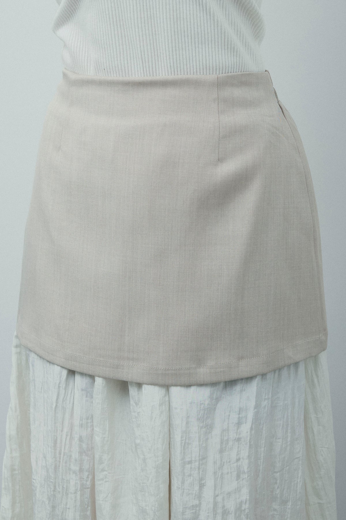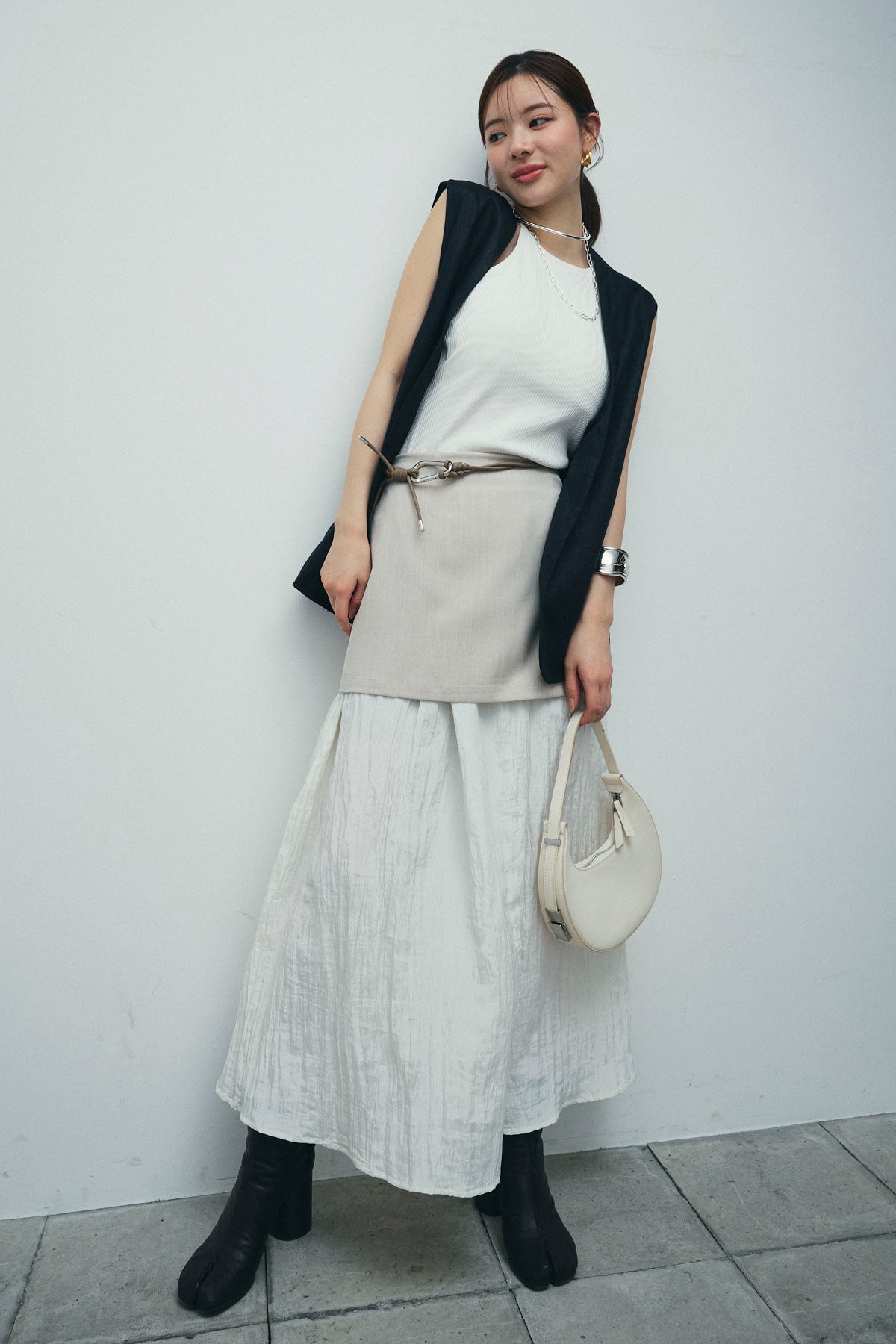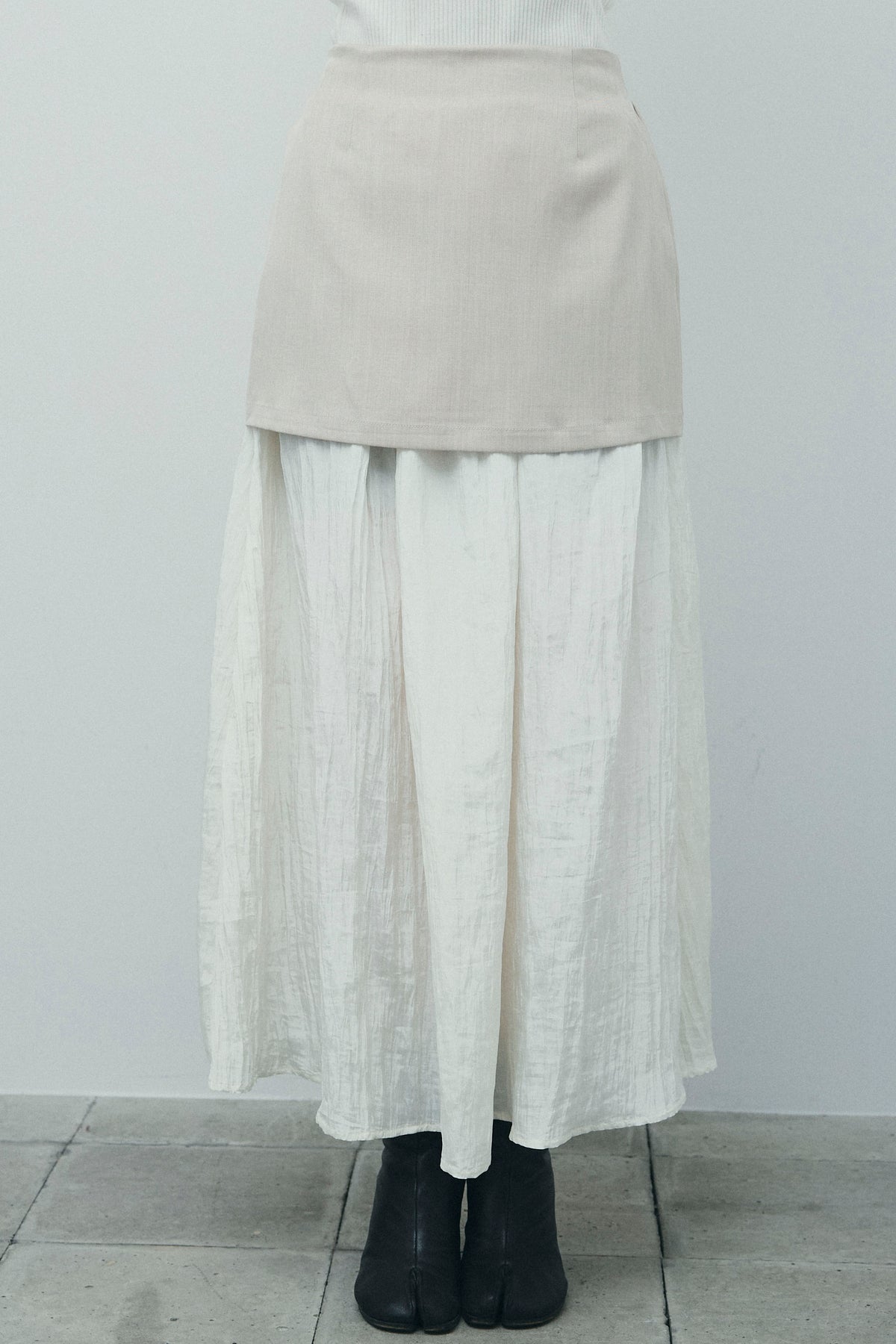 異素材のレイヤードデザインが魅力的なスカート。ウエスト部分はゴム仕様で、リラックスしたフィット感を提供します。シンプルながらもスタイリッシュで、タウンユースにぴったりなアイテムです。 下層のシアー素材が軽やかさを演出し、動きのあるデザインが特徴。シンプルなトップスと合わせるだけで、華やかさを加えることができます。着回し力も抜群で、季節を問わず活躍してくれるアイテムです。