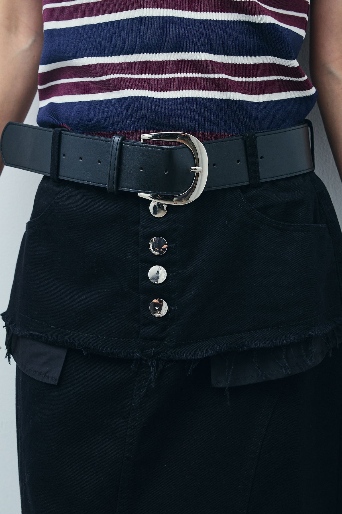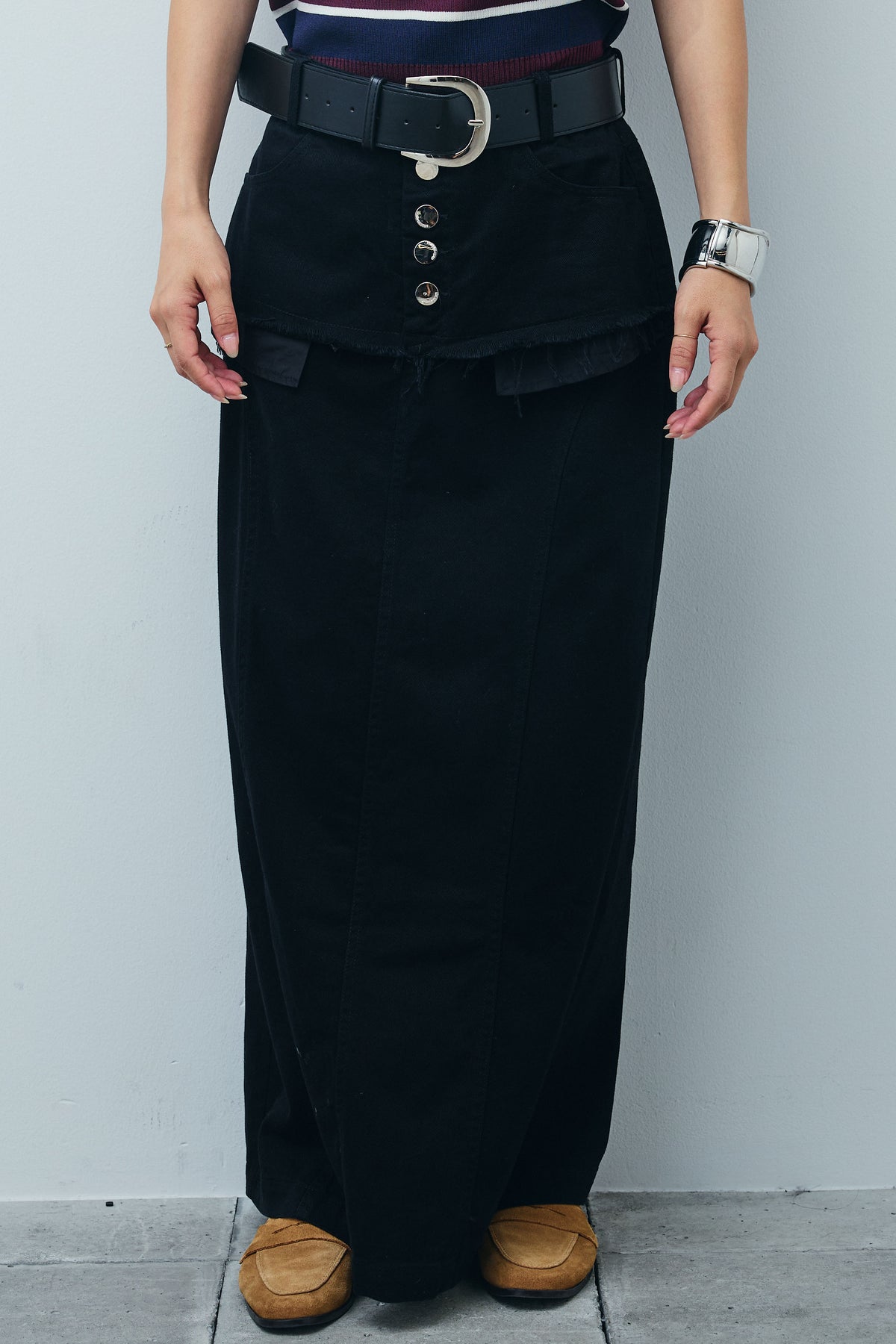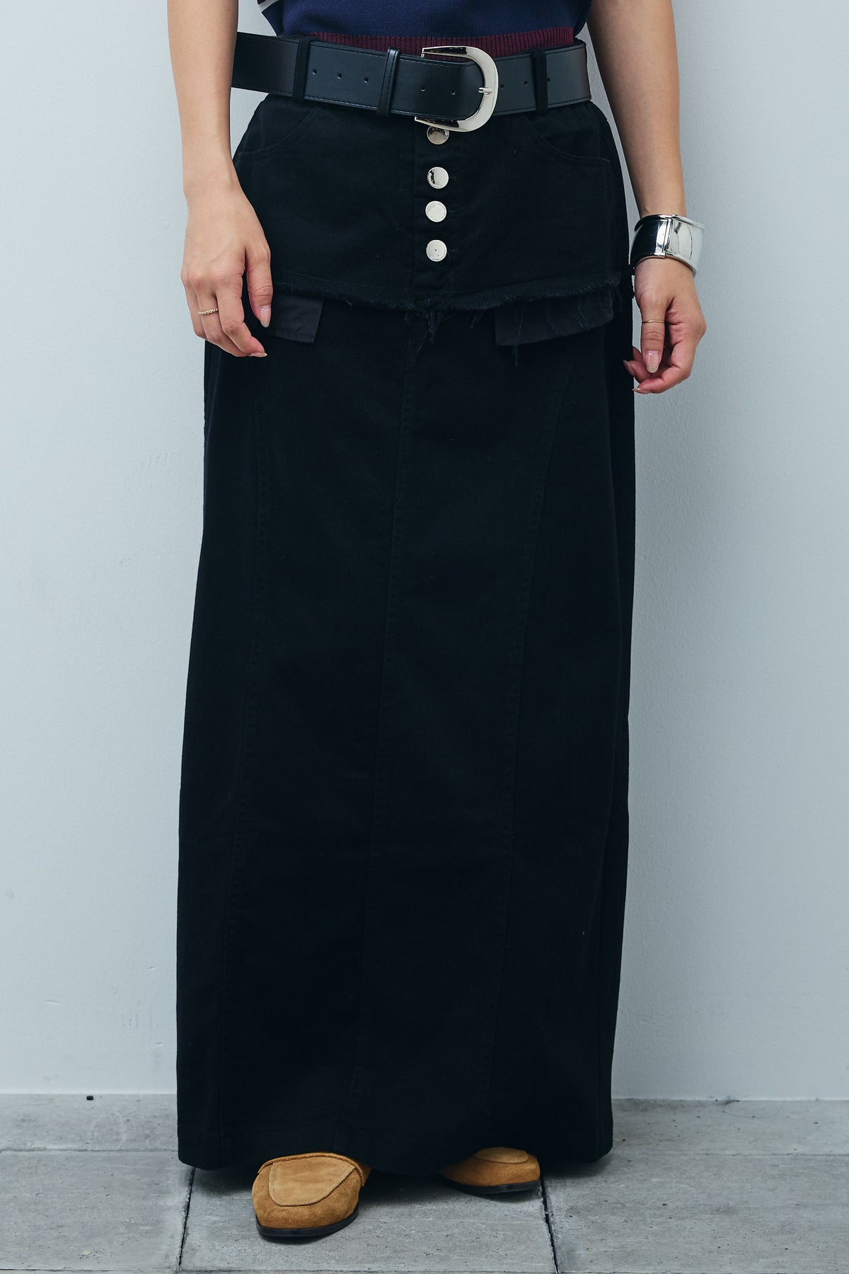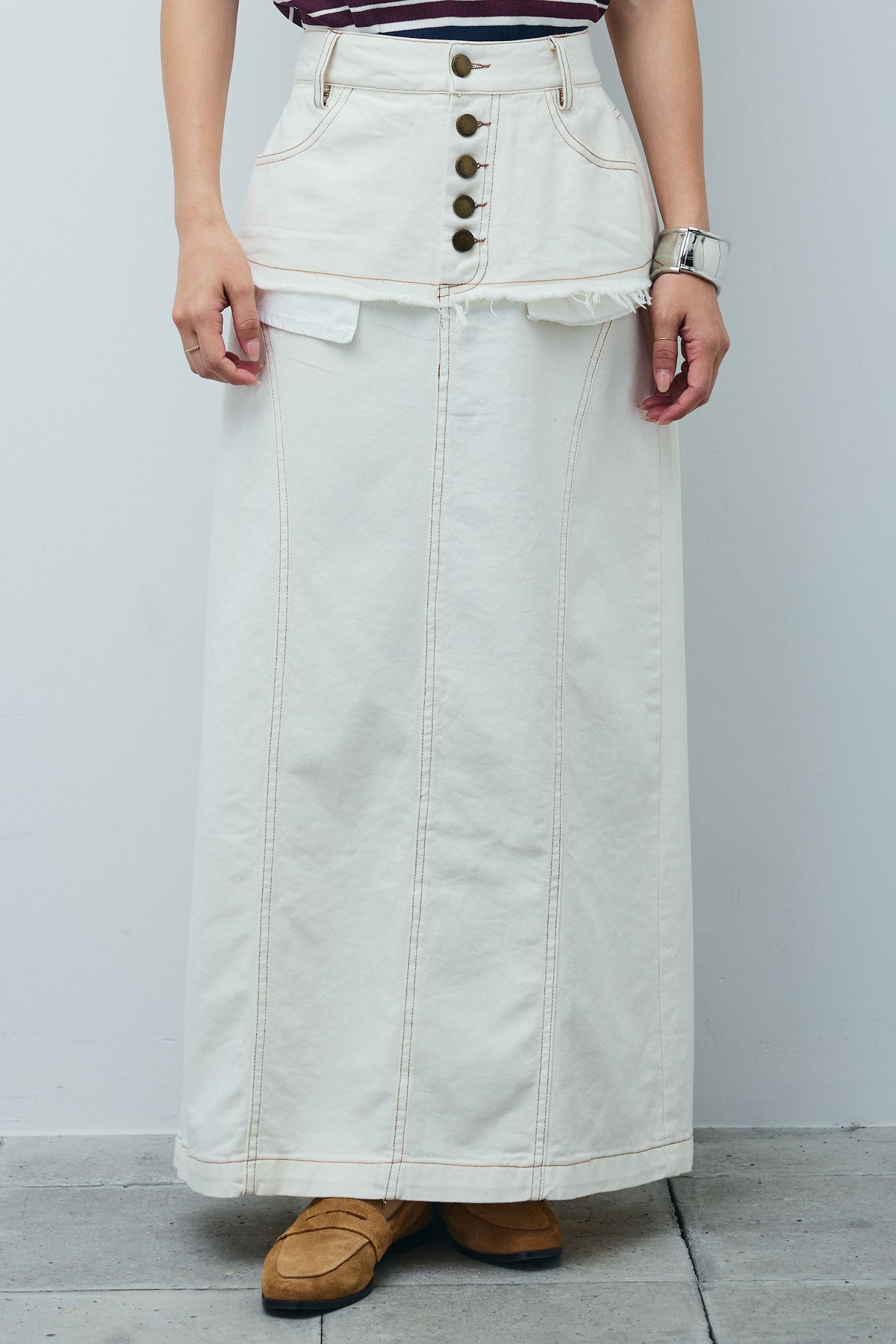 デニムパンツをレイヤードしたようなユニークなデザインが目を惹くワイドスカート。切りっぱなしのフリンジや存在感のあるフロントボタンがアクセントに。ロング丈とすとんとしたシルエットが大人のカジュアルスタイルにぴったりです。Tシャツやノースリーブトップスを合わせるだけでこなれ感のある着こなしに。