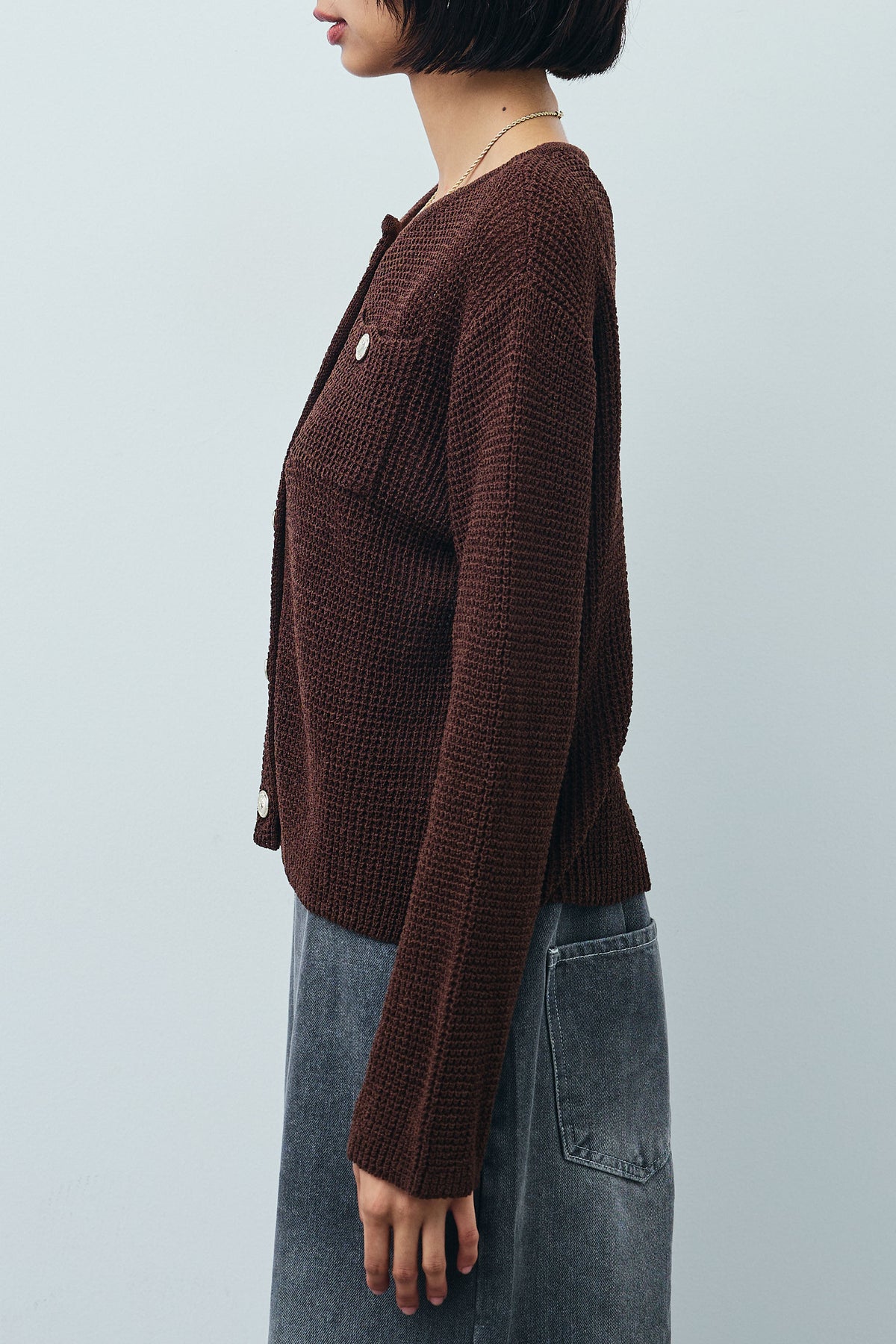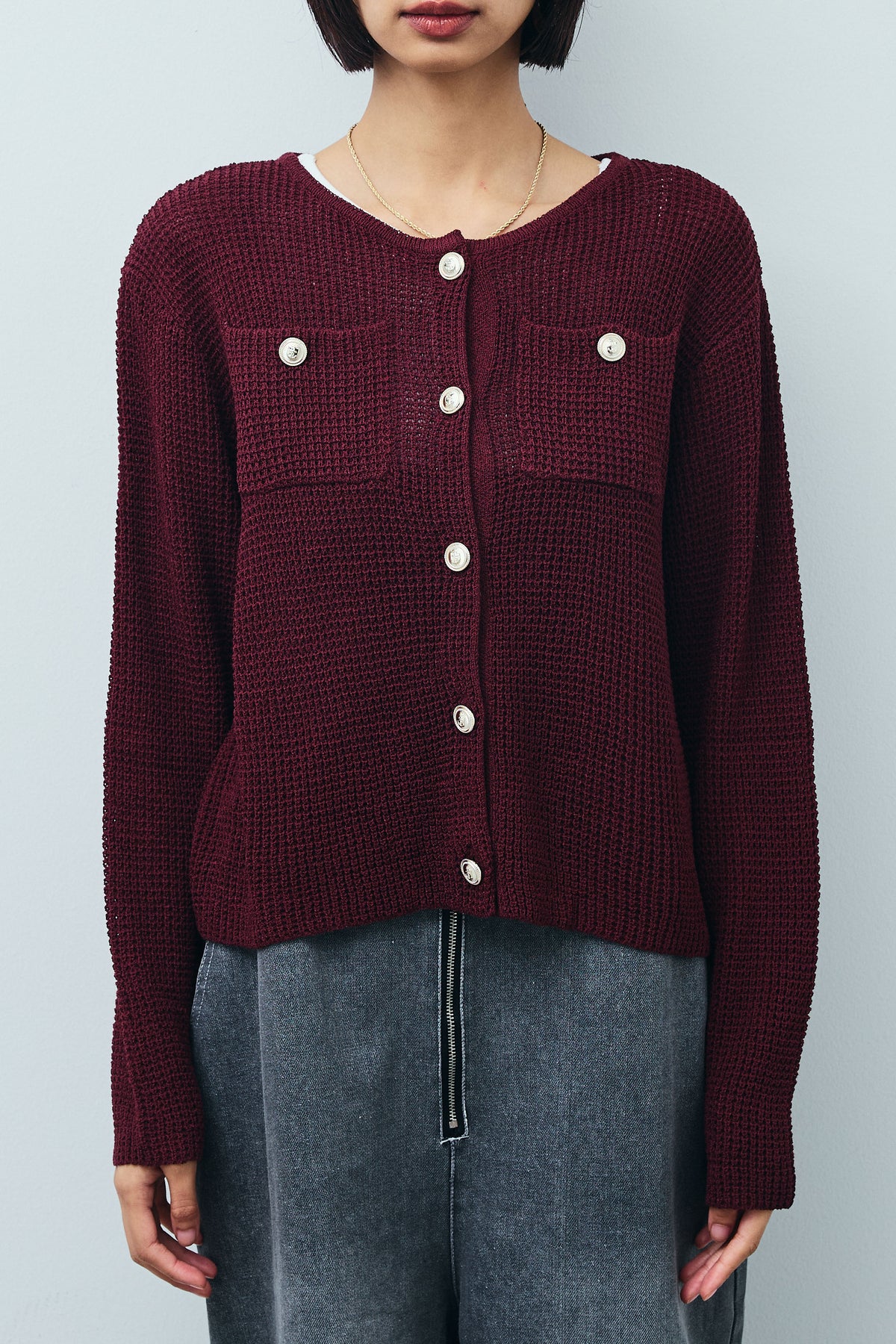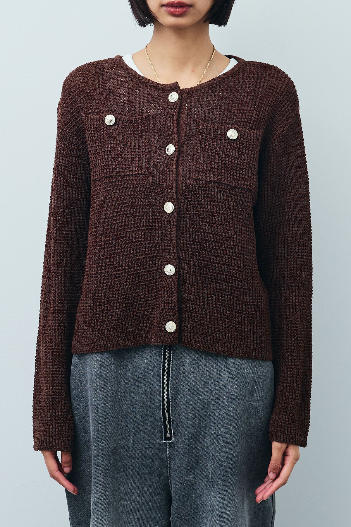 さらりとした肌触りが魅力のリネンタッチ素材を使用したカーディガン。程よい透け感と軽やかな編地が春夏シーズンにぴったりです。フロントには存在感のある金ボタンをあしらい、シンプルながらも華やかな印象に。胸元のポケットディテールがアクセントとなり、羽織りとしてはもちろん、ボタンを留めてトップス風にも着こなせます。パンツやスカート、ワンピースとのレイヤードにも合わせやすい一枚です。