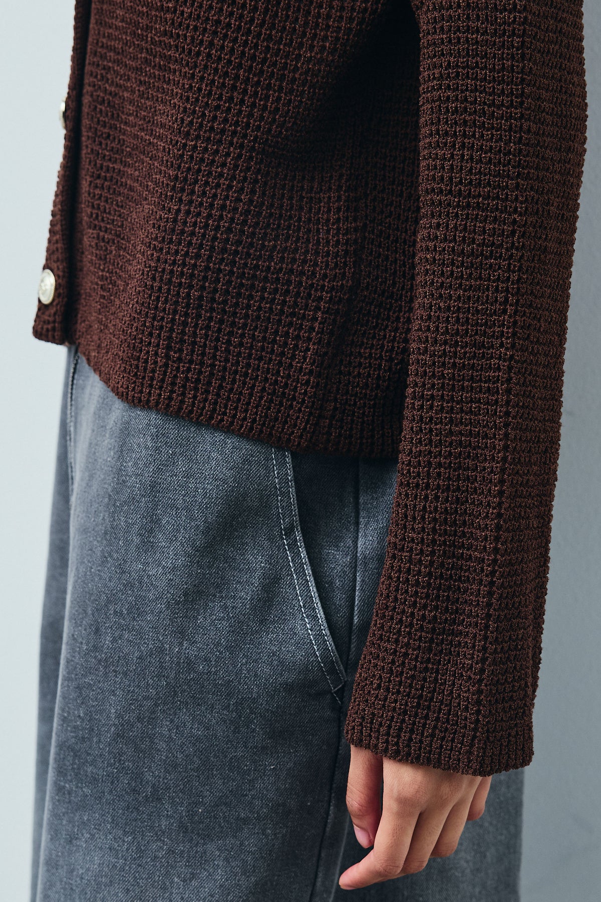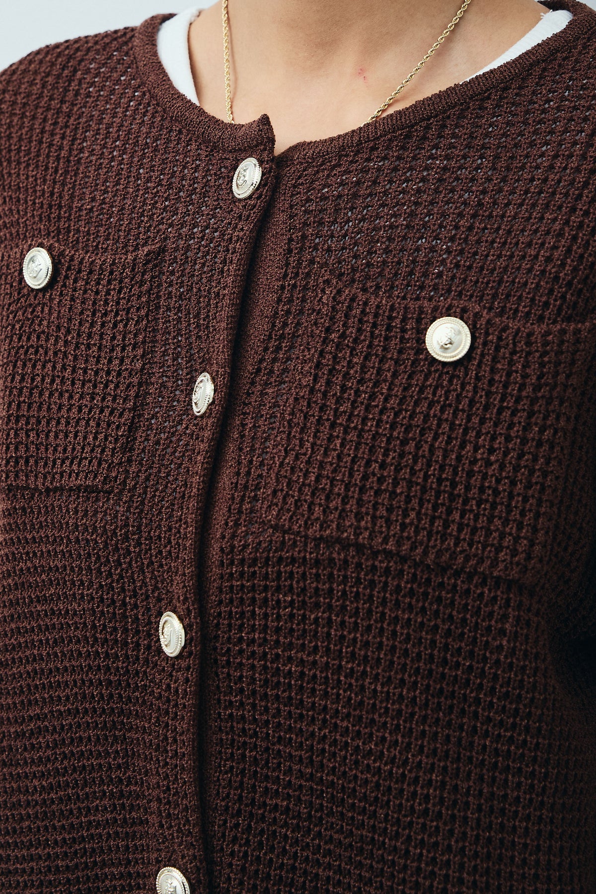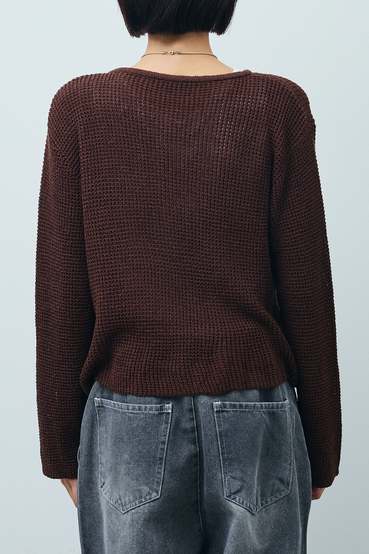さらりとした肌触りが魅力のリネンタッチ素材を使用したカーディガン。程よい透け感と軽やかな編地が春夏シーズンにぴったりです。フロントには存在感のある金ボタンをあしらい、シンプルながらも華やかな印象に。胸元のポケットディテールがアクセントとなり、羽織りとしてはもちろん、ボタンを留めてトップス風にも着こなせます。パンツやスカート、ワンピースとのレイヤードにも合わせやすい一枚です。