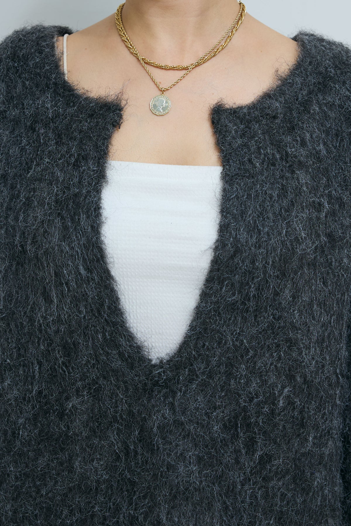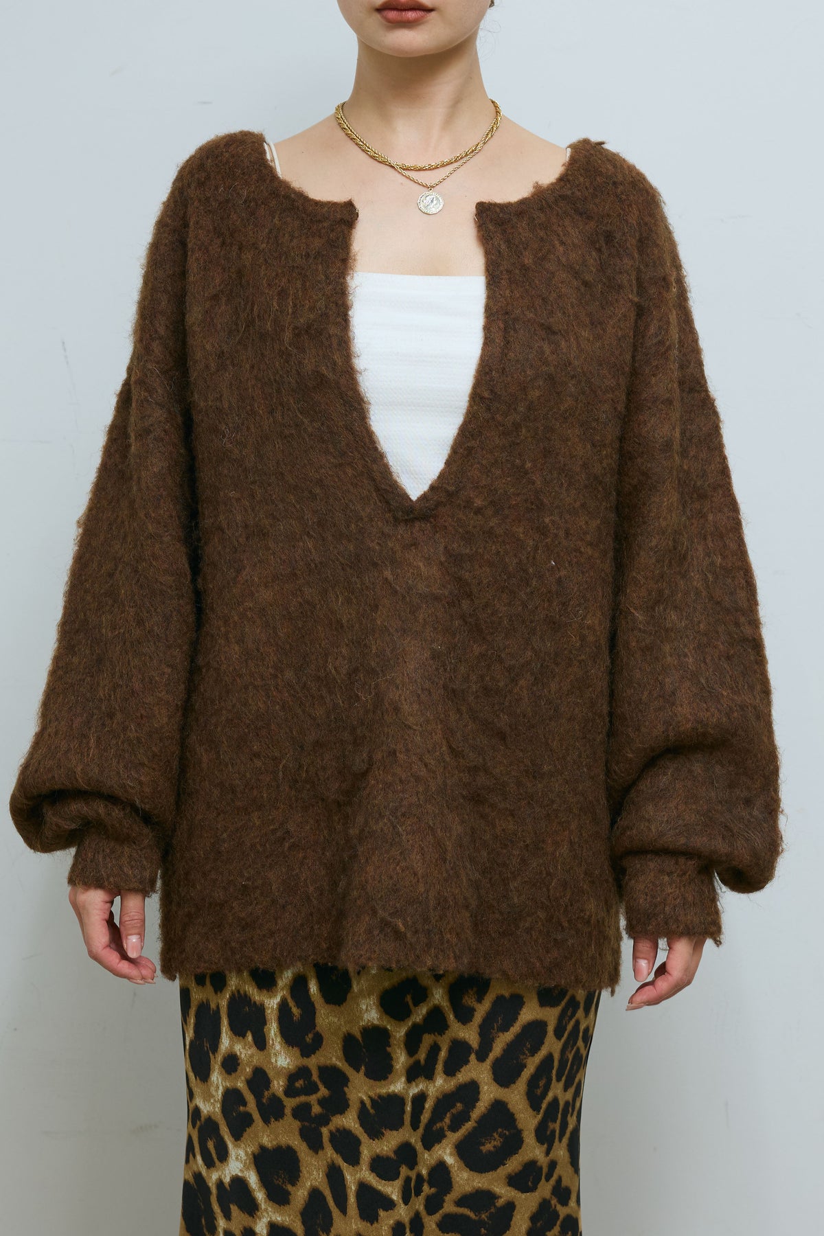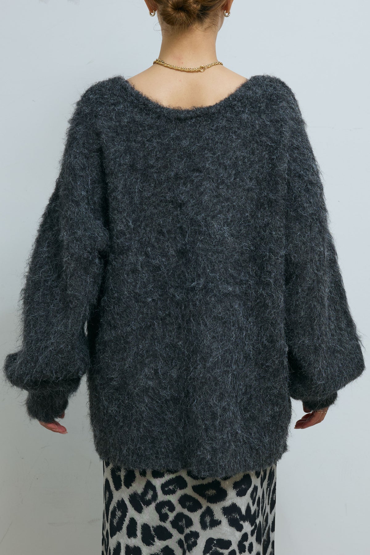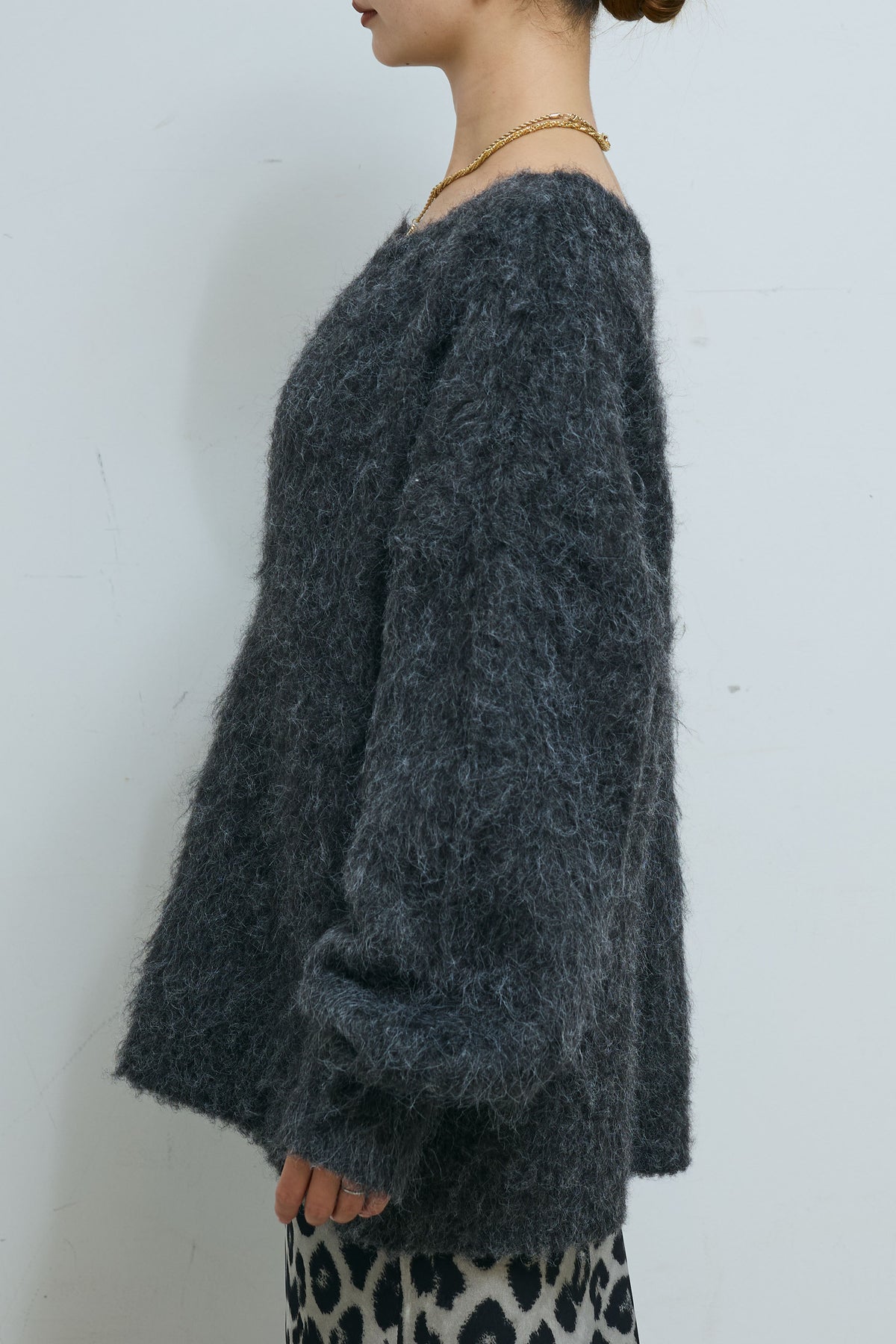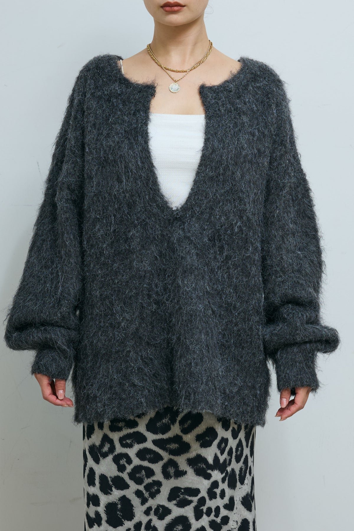 毛足の長いシャギー素材が目を惹く、深Vネックデザインのニット。ミックス感のある表情豊かな糸を使用し、シンプルながら存在感のある仕上がりに。抜け感のあるネックラインがデコルテを美しく見せ、1枚でこなれた印象に。ゆとりのあるサイジングでリラックス感がありながらも、ボトムを選ばず着回しやすい万能アイテムです。