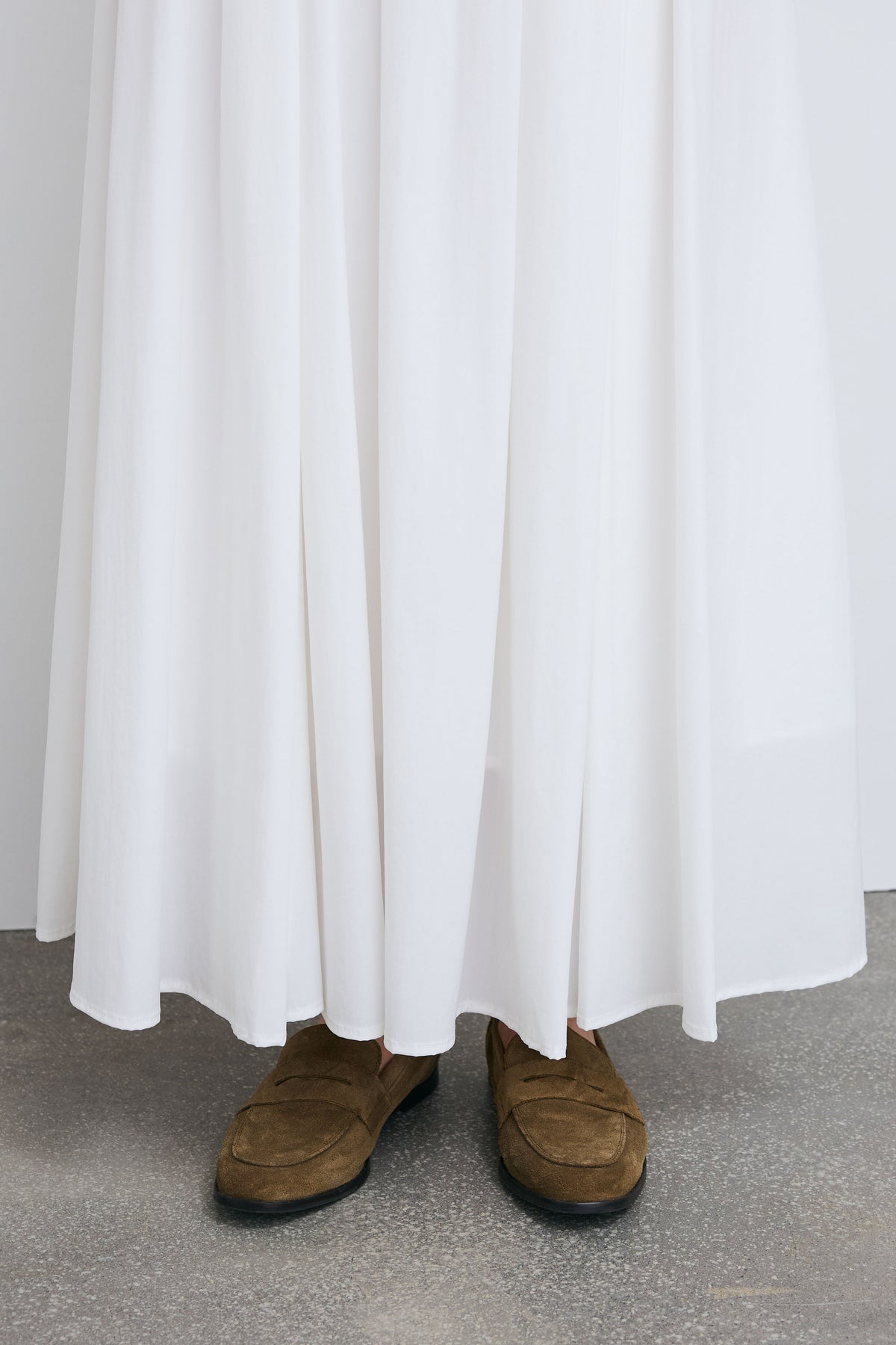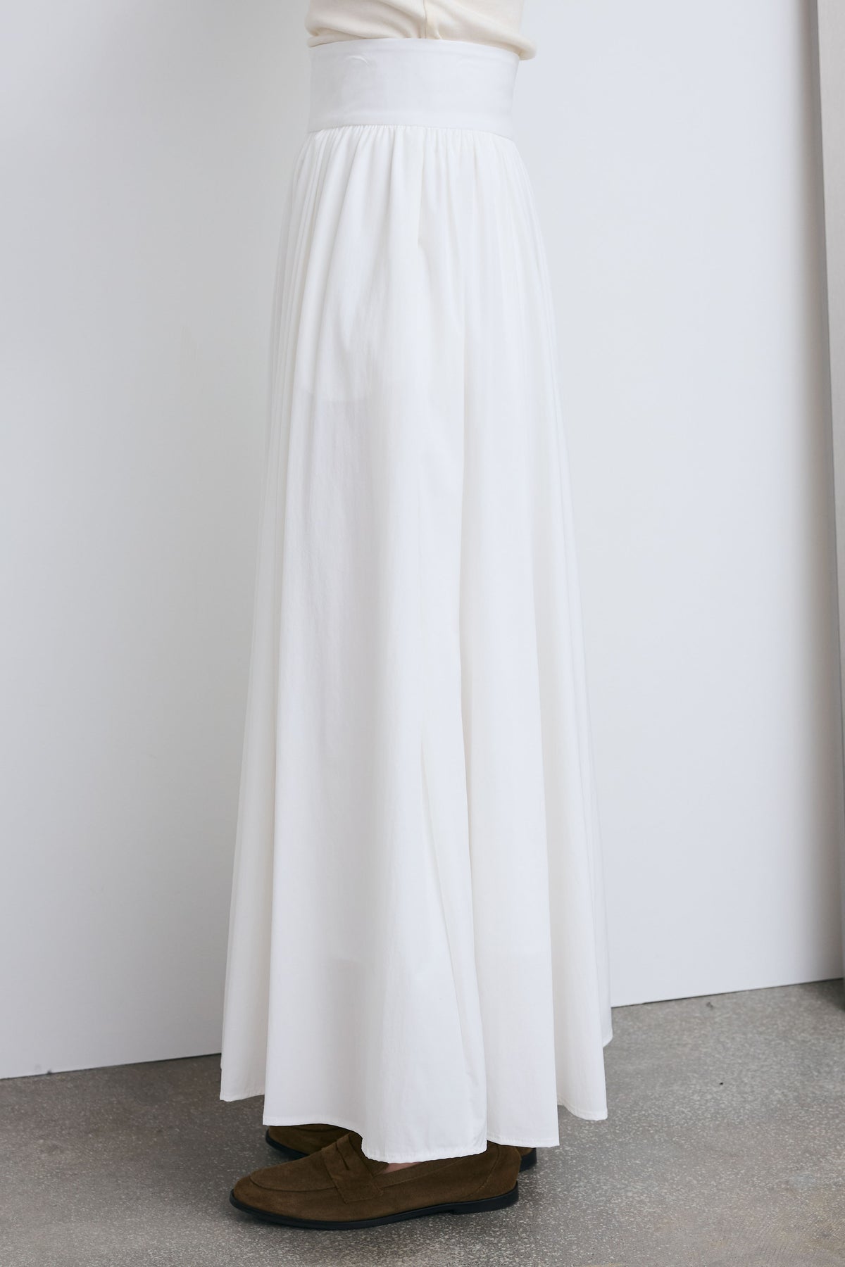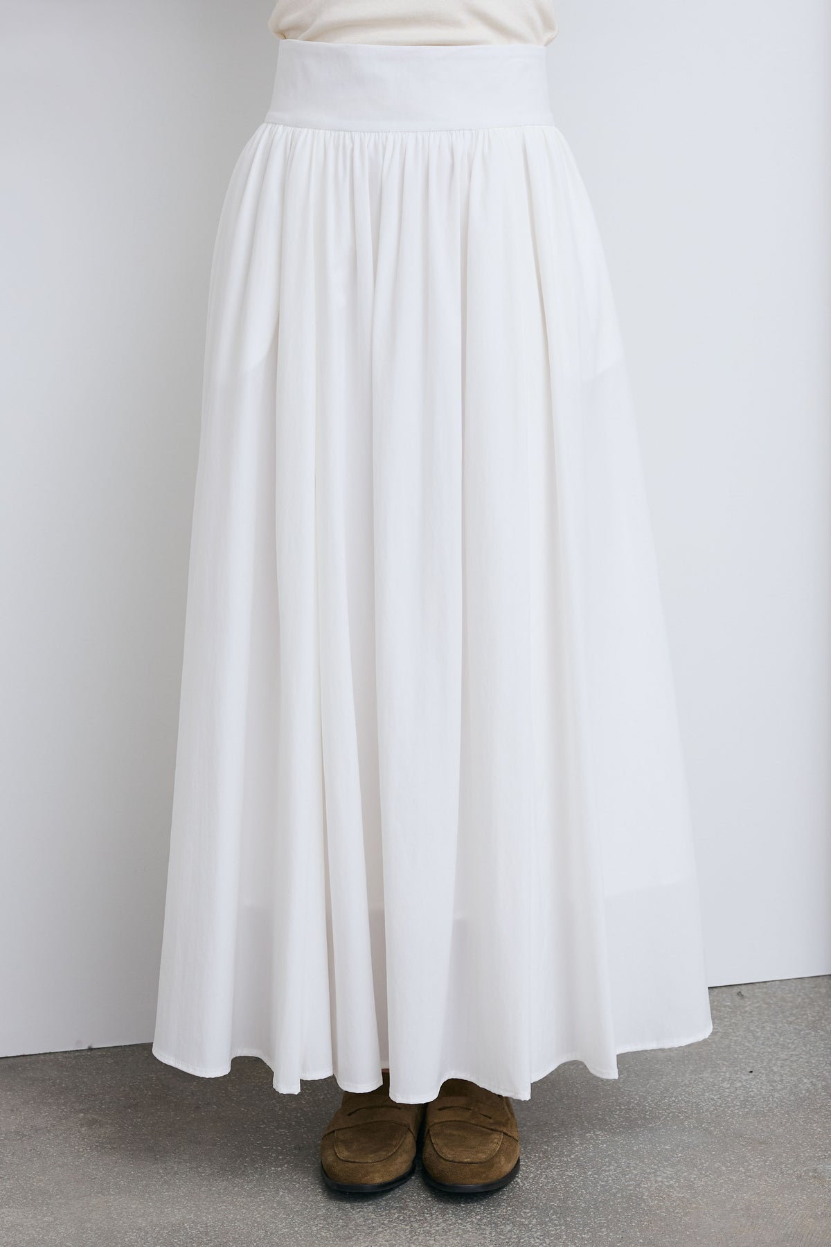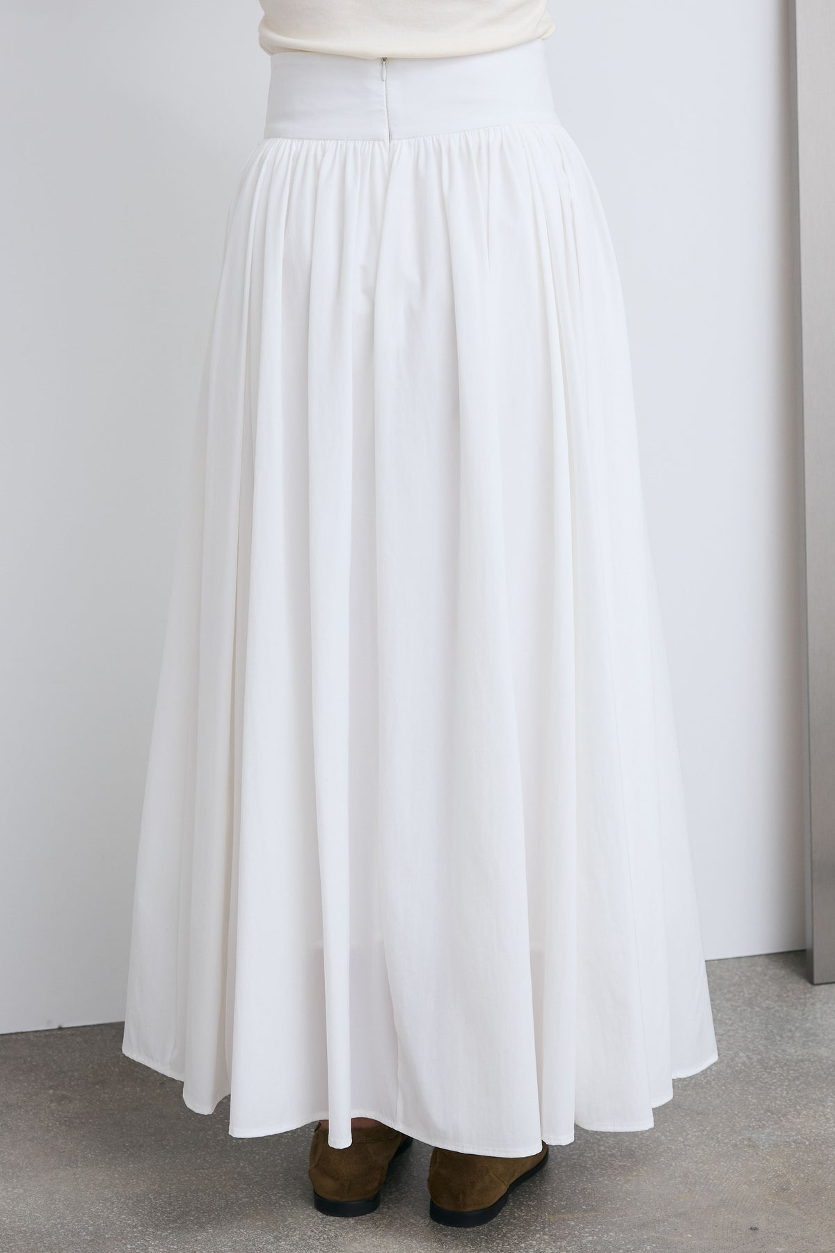 たっぷりと寄せたギャザーが生む立体感が魅力のマキシスカート。裾に向かって広がるシルエットが動きに表情を与え、軽やかな印象に仕上がります。シンプルなトップスと合わせるだけでバランスが整い、日常使いから幅広いシーンに馴染む一着です。