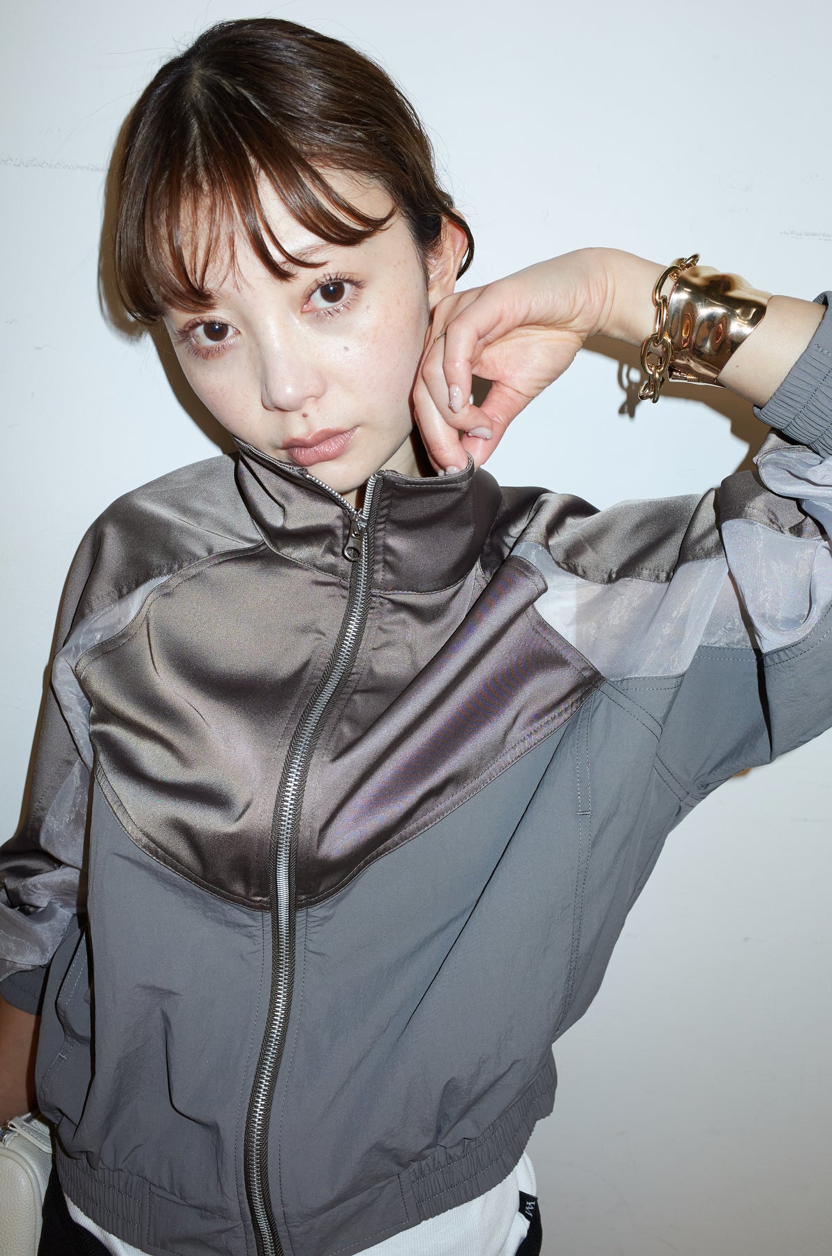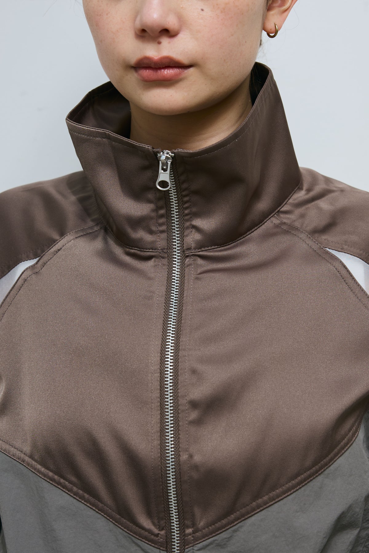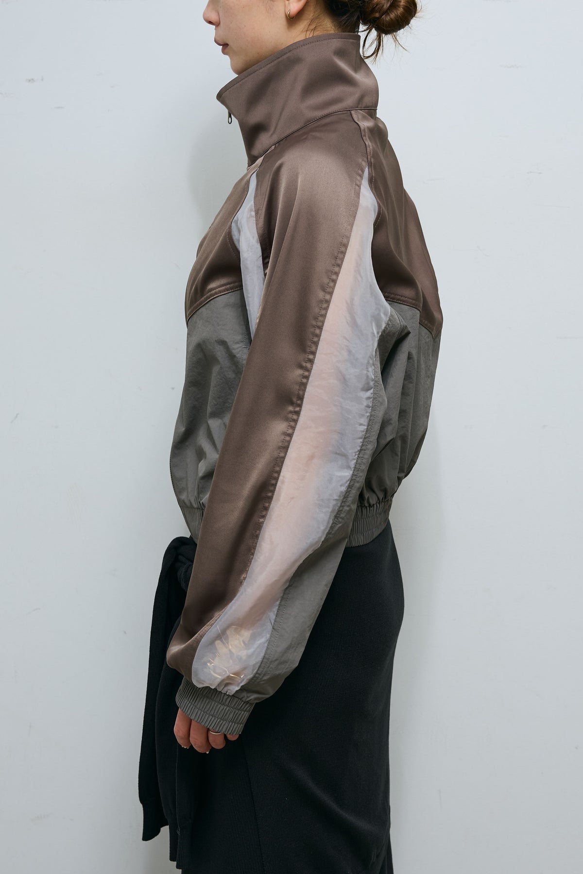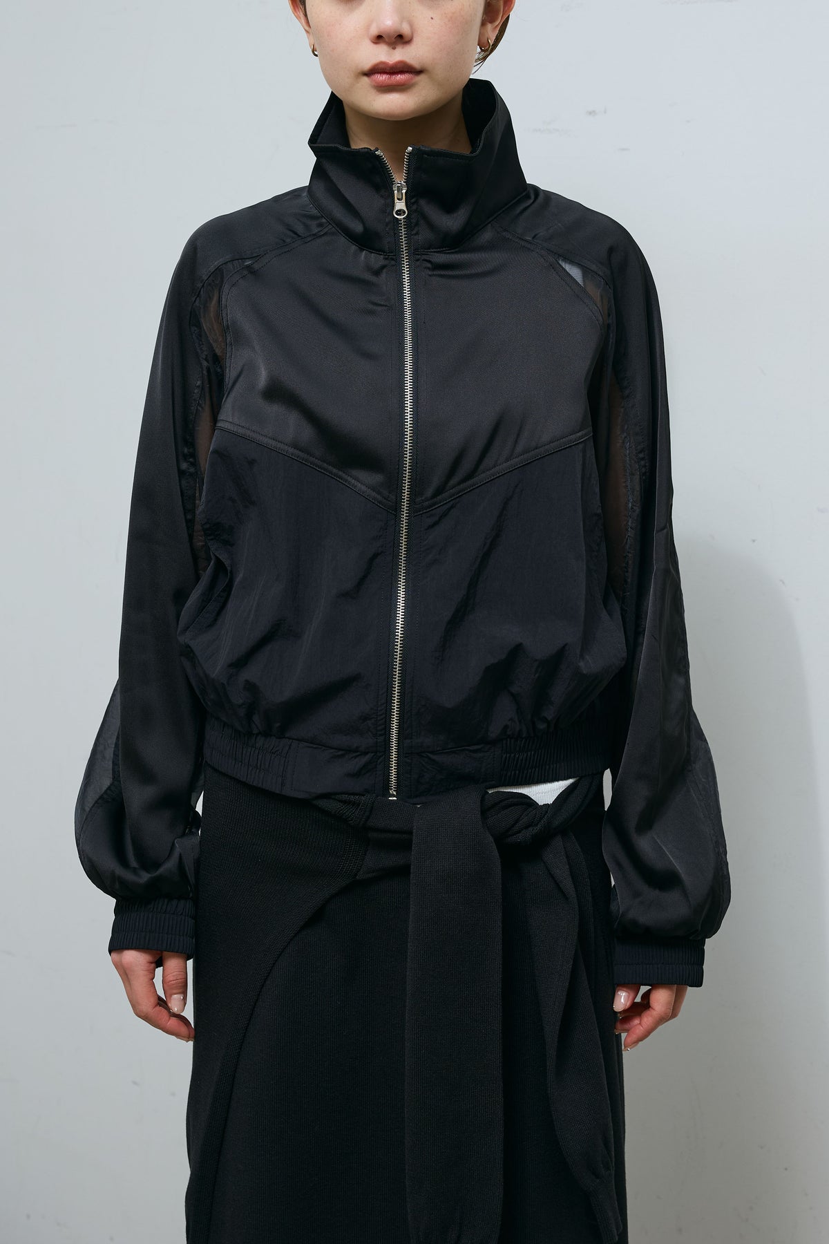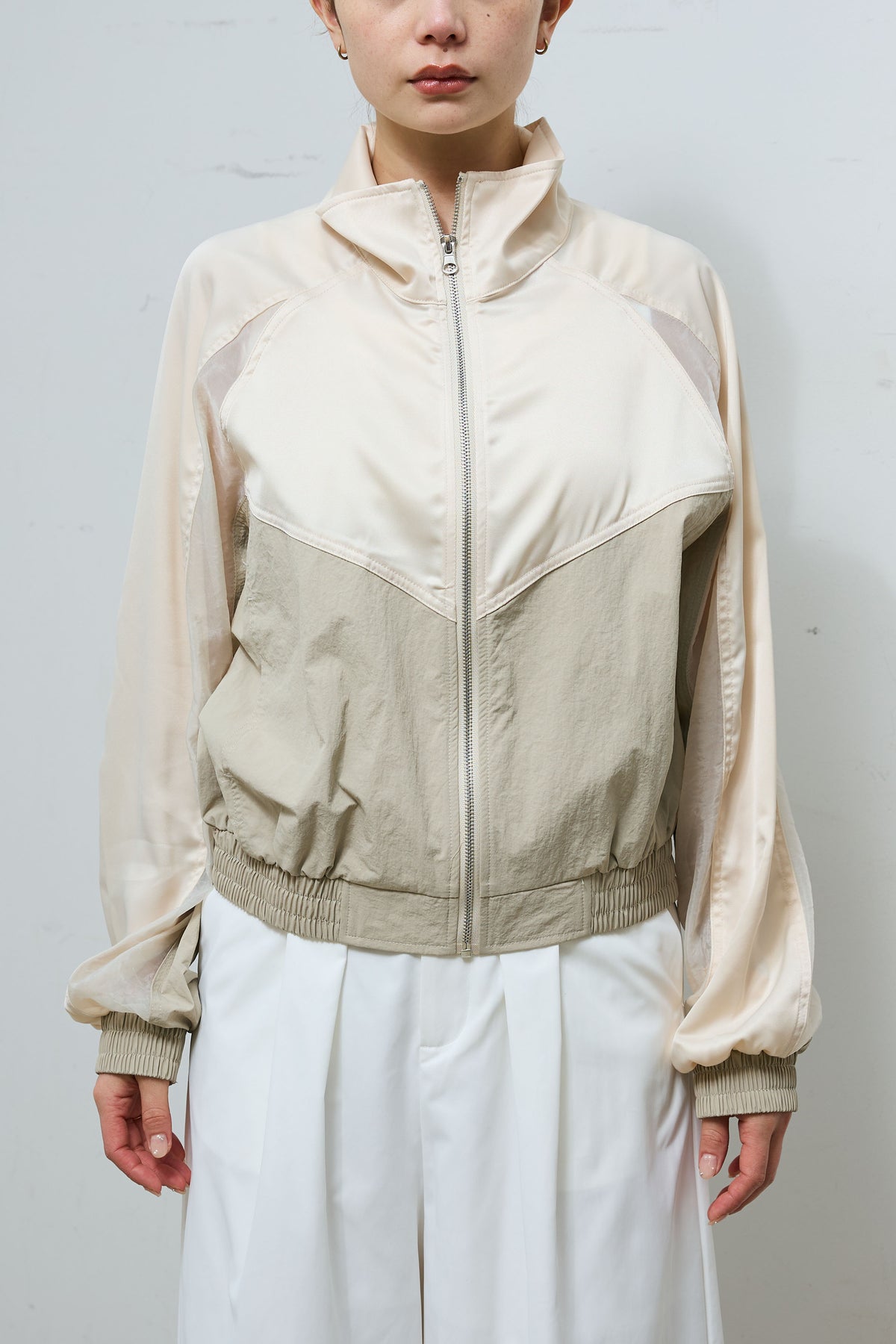 異素材の切り替えデザインが目を引くジップブルゾン。軽やかなシアー素材を部分的に組み合わせることで、スポーティーな雰囲気に程よい抜け感をプラスしました。コンパクトな丈感でバランスが取りやすく、ワイドパンツやスカートとも好相性。フロントジップでさっと羽織りやすく、季節の変わり目にも活躍する一着です。シンプルなスタイリングに取り入れるだけで、コーディネートにさりげないアクセントを添えてくれるアイテムです。