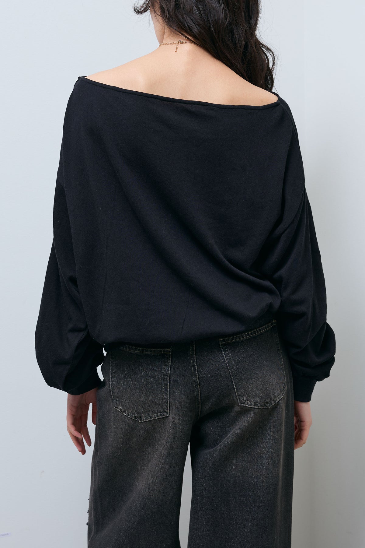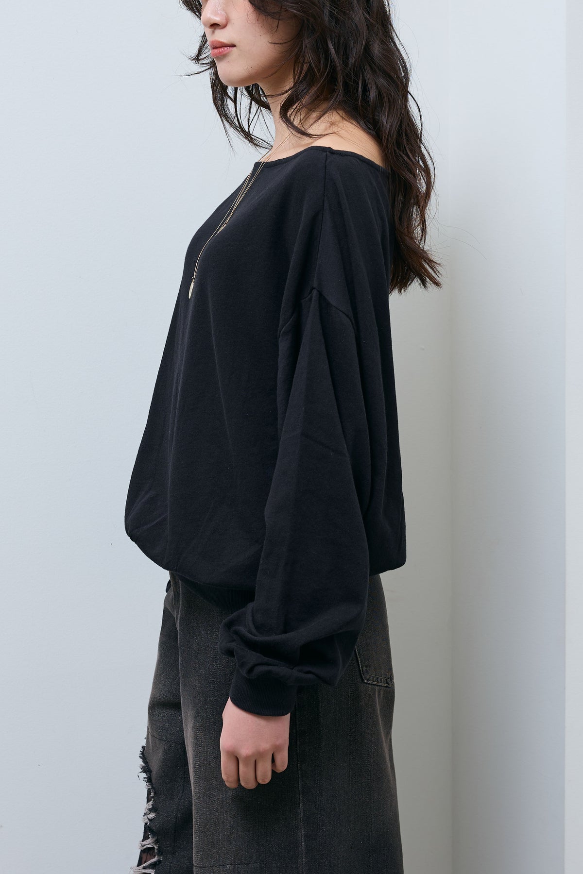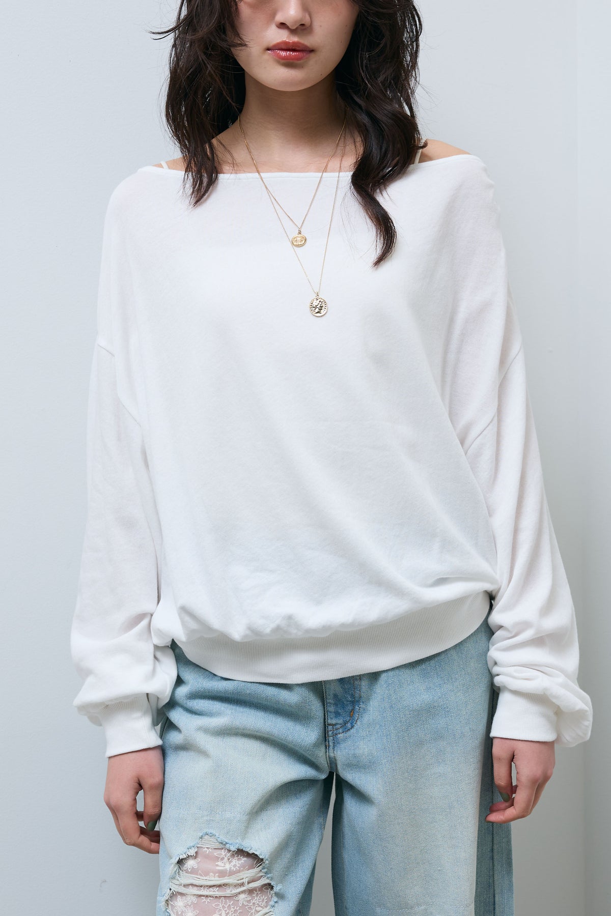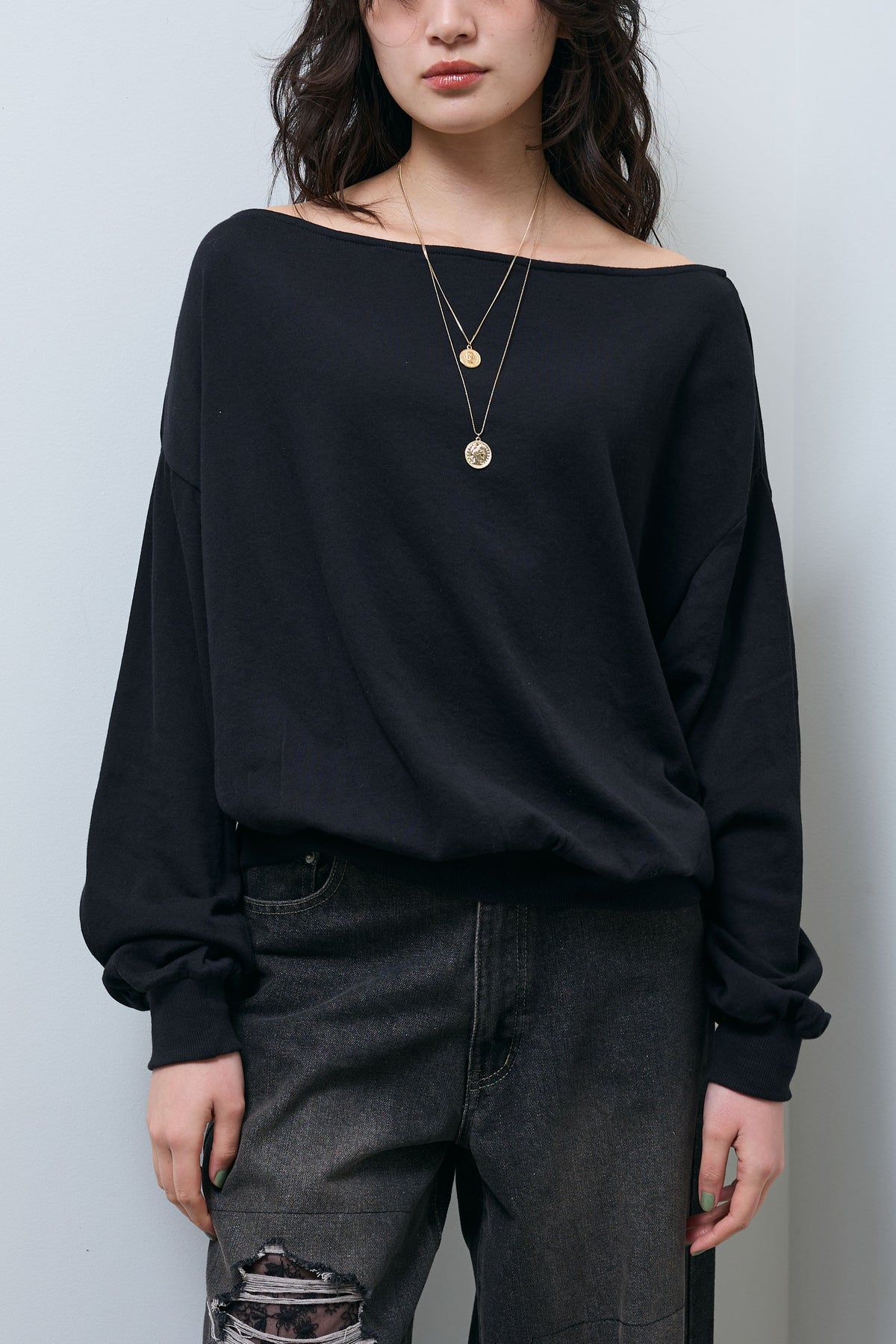 ほんのり透け感のある素材が軽やかな印象を与えるオフショルダープルオーバー。広めに開いたネックラインがデコルテをきれいに見せ、抜け感のあるバランスに仕上げました。ゆとりのあるシルエットとボリュームスリーブがリラックスした雰囲気を生み、ラフになりすぎない大人のスタイリングが完成します。裾と袖口のリブが全体を引き締め、タックインせずともバランスよく着こなせる一着。デニムやワイドパンツ、スカートまで幅広く合わせやすく、日常使いに取り入れやすいアイテムです。
