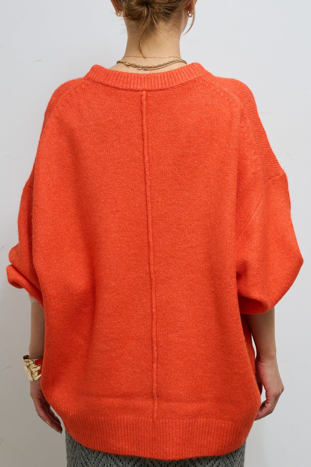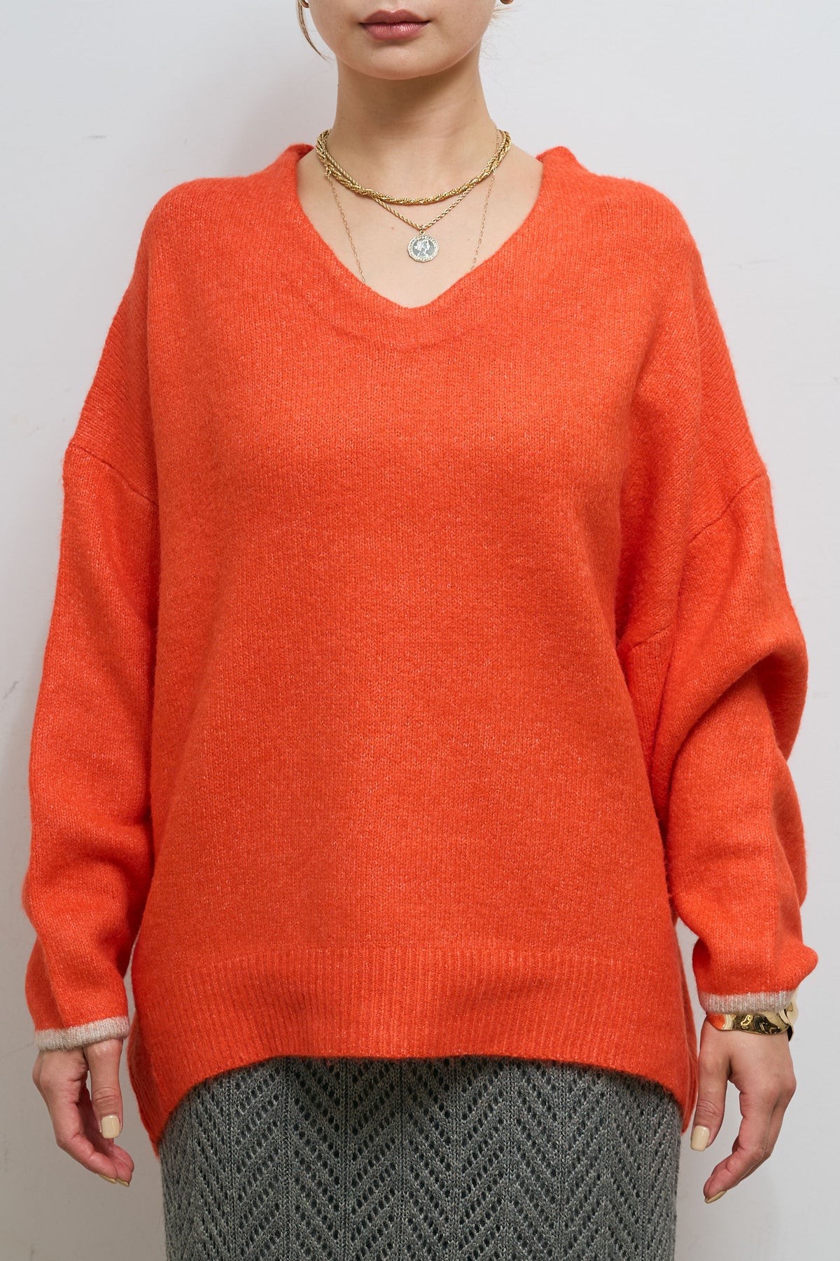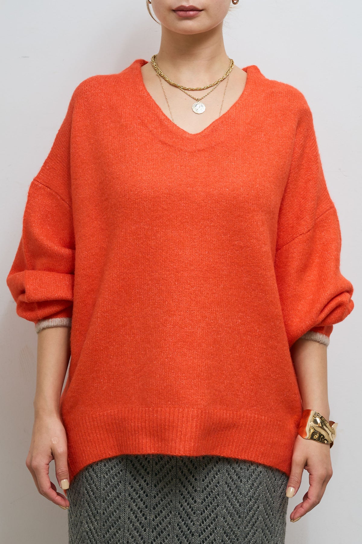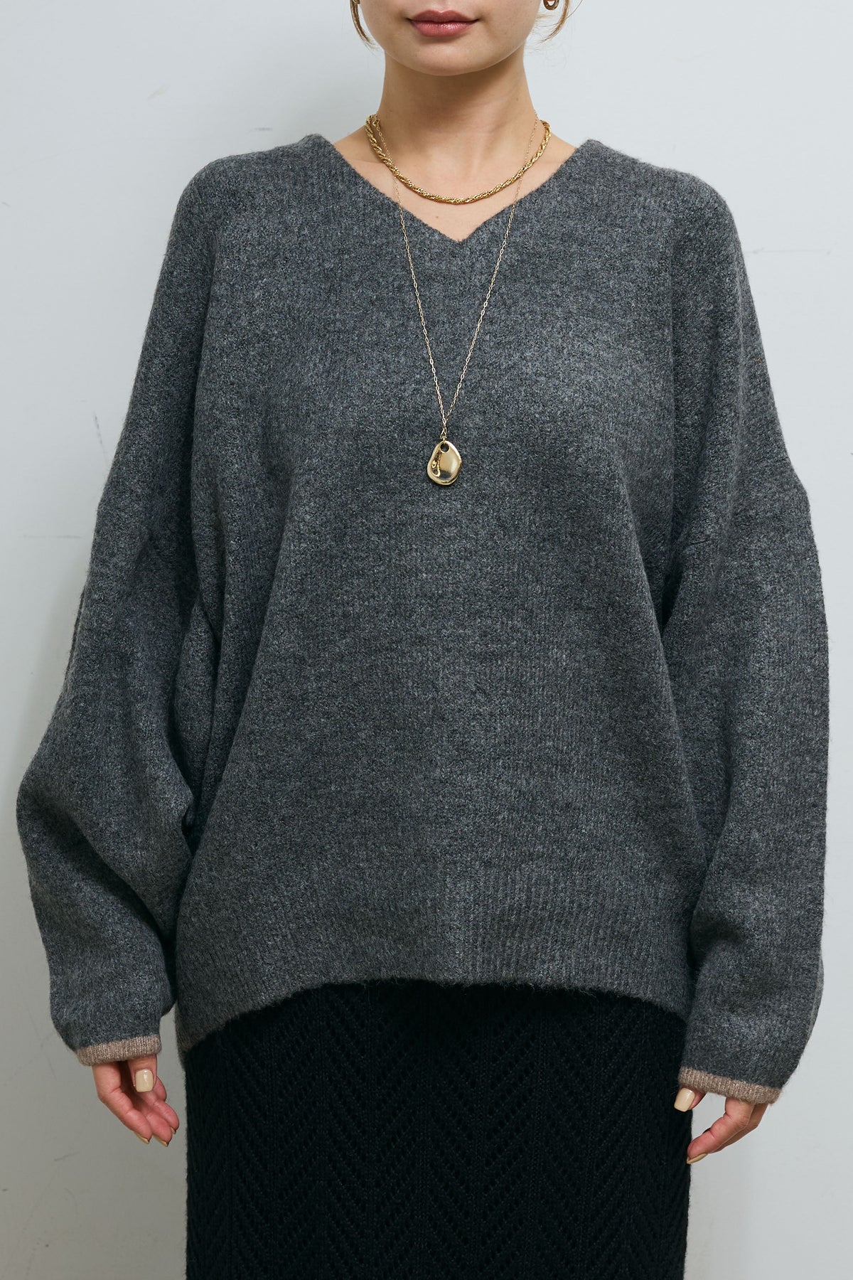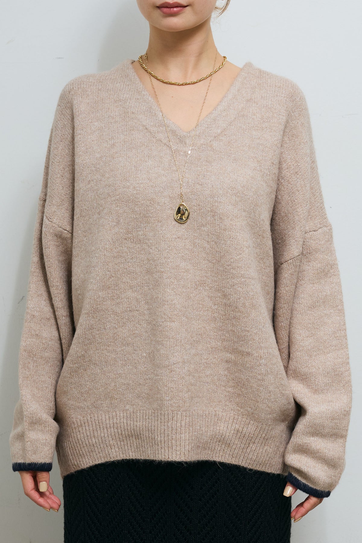 柔らかなフォルムが魅力のバイカラーコクーンニット。ふっくらとした素材感で、立体的なシルエットを生み出します。袖口と裾に配されたさりげない配色デザインがアクセントになり、シンプルながらも印象的な一枚。Vネックラインが顔まわりをすっきり見せ、1枚でもレイヤードでも様になるニットです。