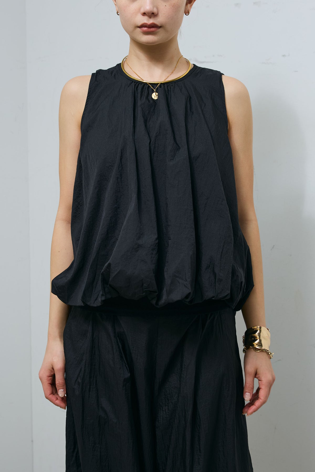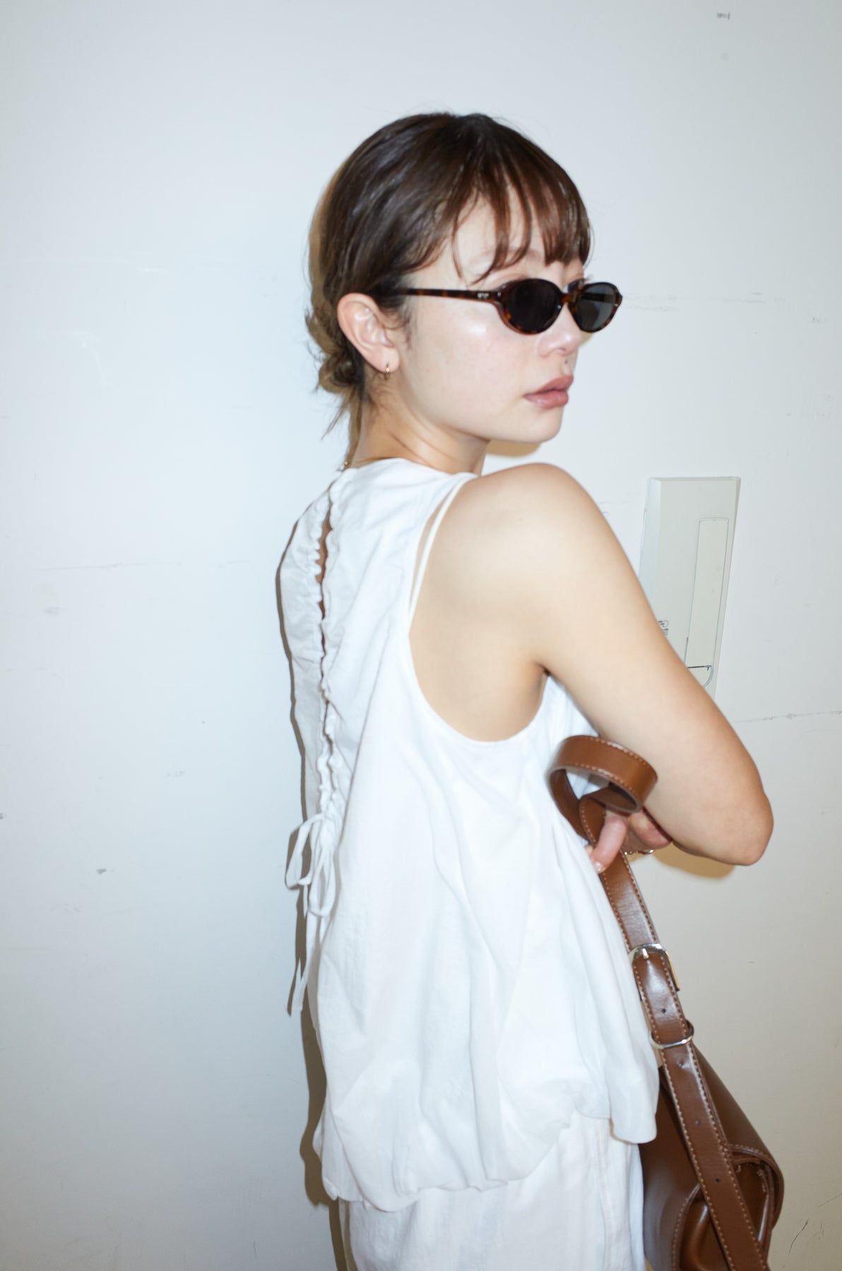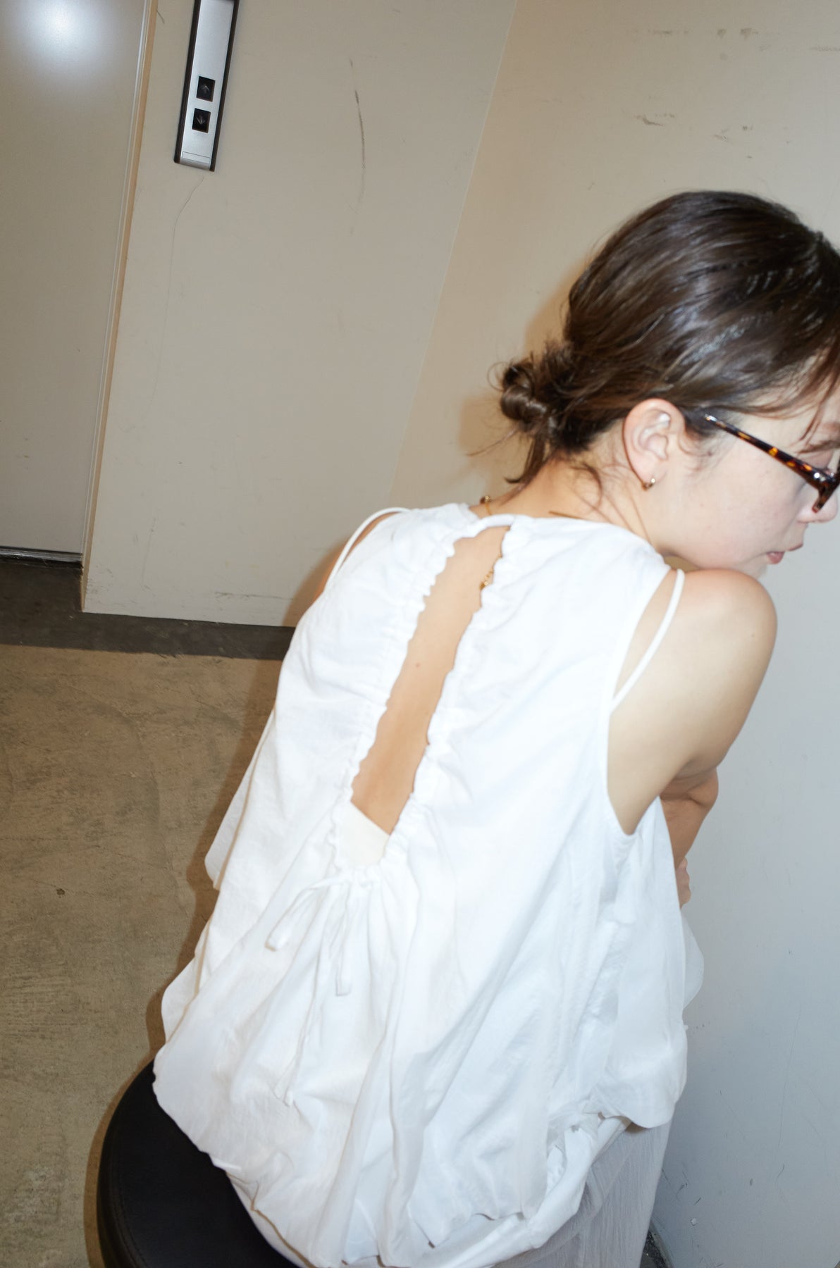ふんわりとしたバルーンシルエットが印象的なシアーブラウス。軽やかな透け感のある素材がやわらかなニュアンスを生み、動くたびに空気を含んだような立体感を感じさせます。フロントはシンプルながら、バックスタイルは大胆なオープンデザインで後ろ姿まで印象的に。ギャザーとリボンディテールがアクセントとなり、さりげないポイントを添えています。パンツやスカートに合わせるだけでスタイリングに軽やかな表情を加えてくれる一枚です。