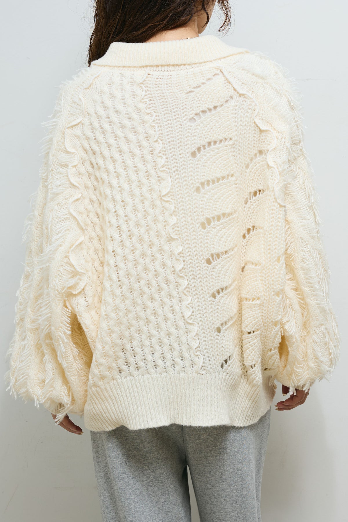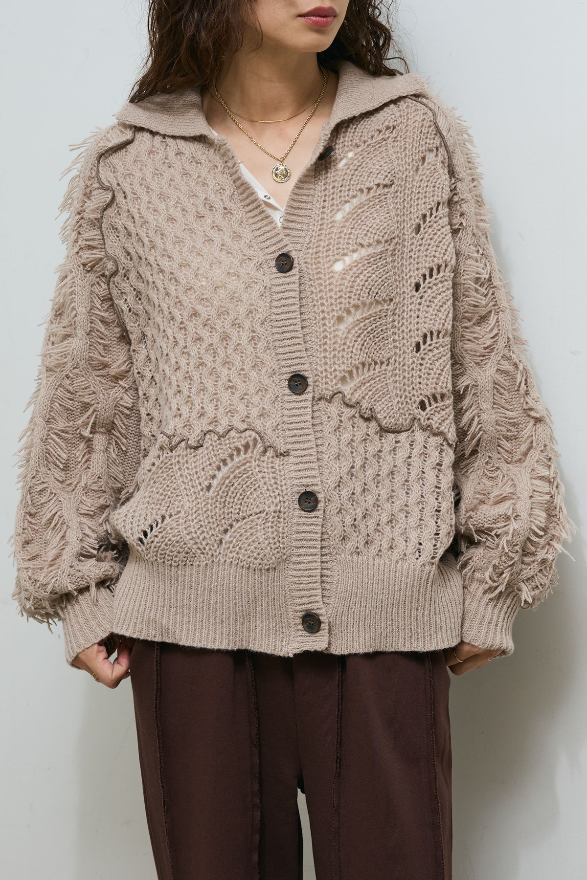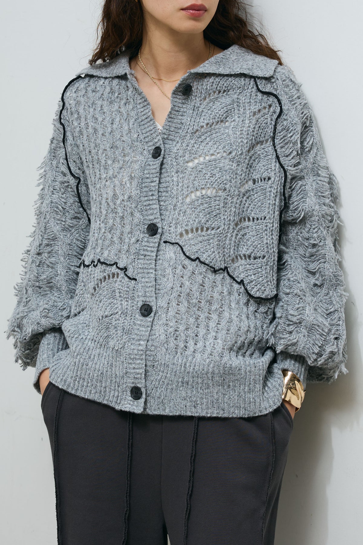 フリンジデザインとカウチン編みが特徴の、ボリューム感たっぷりのカーディガン。ふんわりとした仕上がりで、肩のフリンジがリラックス感を演出します。エッジの効いたカジュアルスタイルにぴったりのアイテムです。シンプルなトップスと合わせて、アクセントとして活躍します。