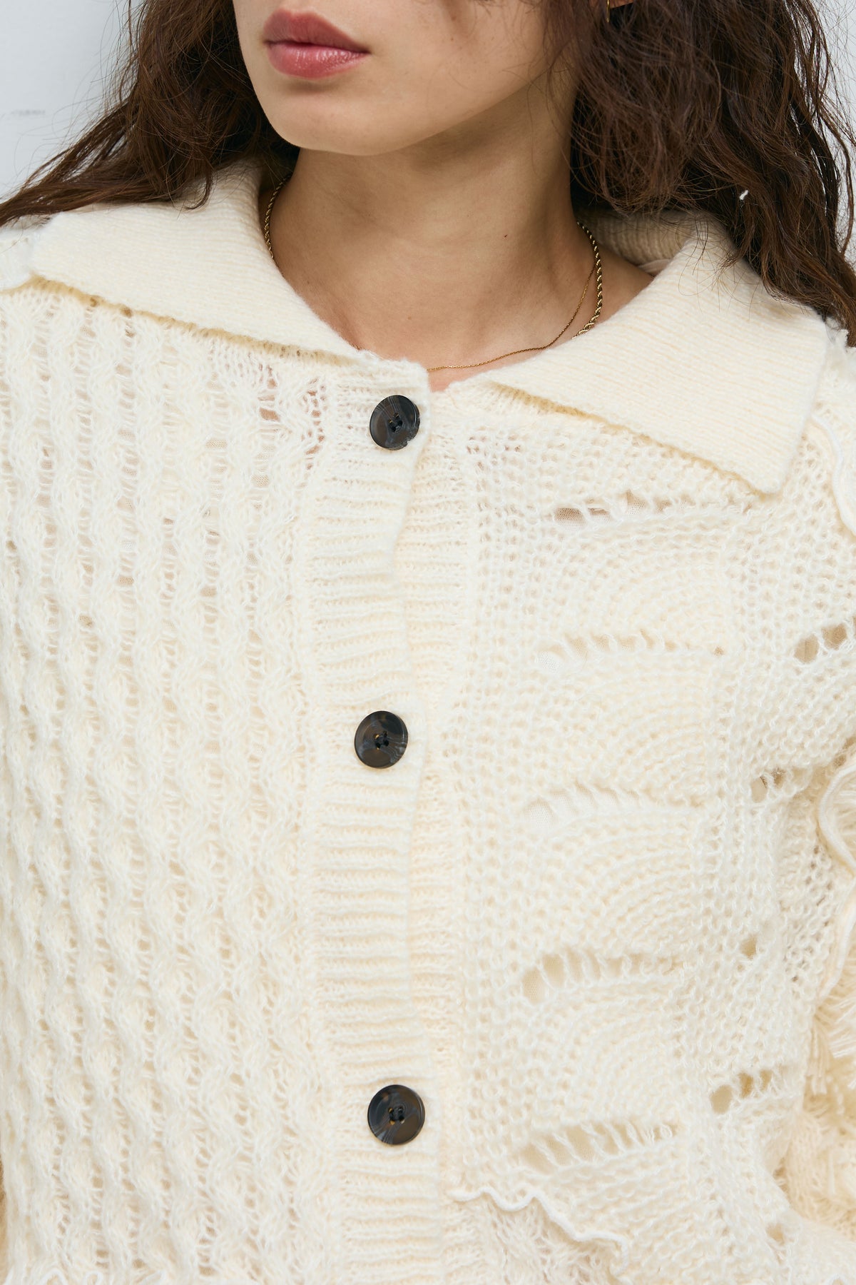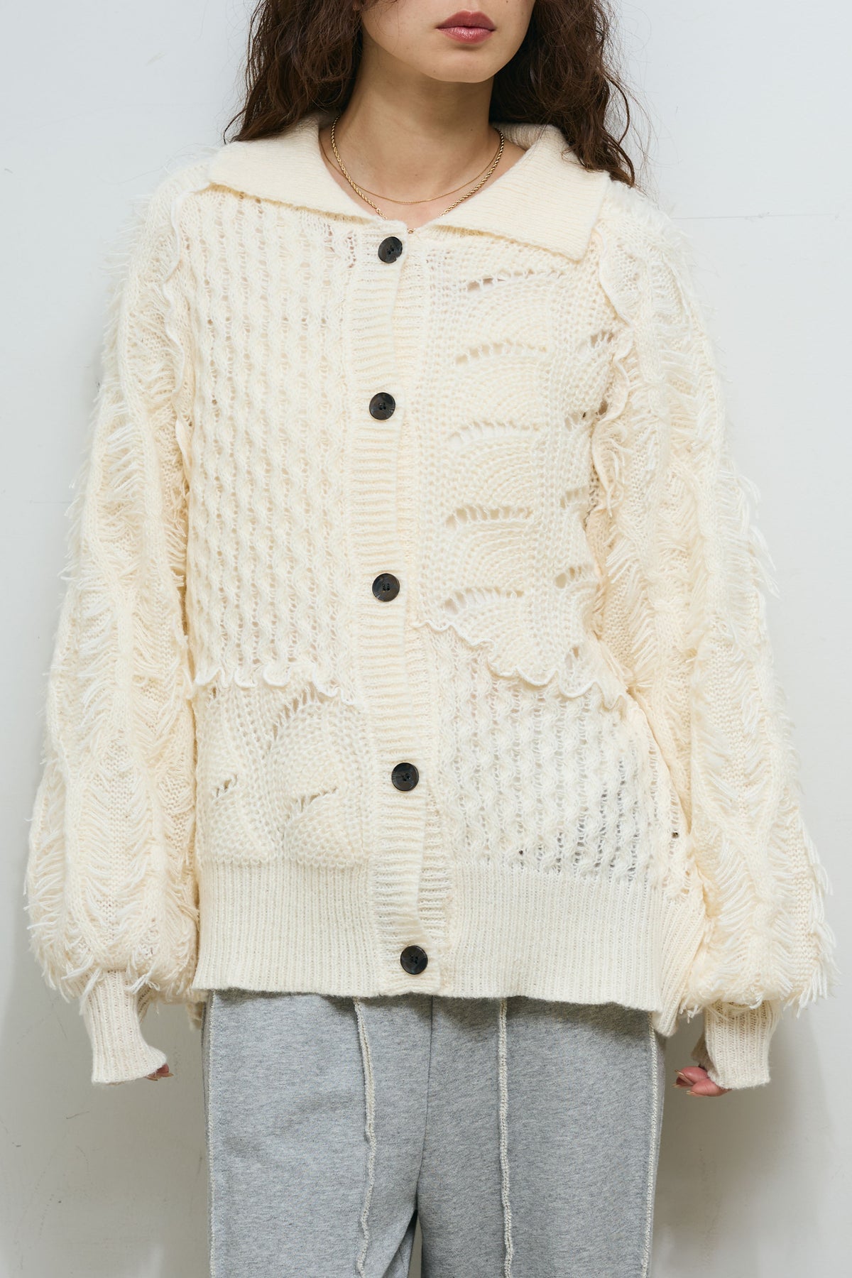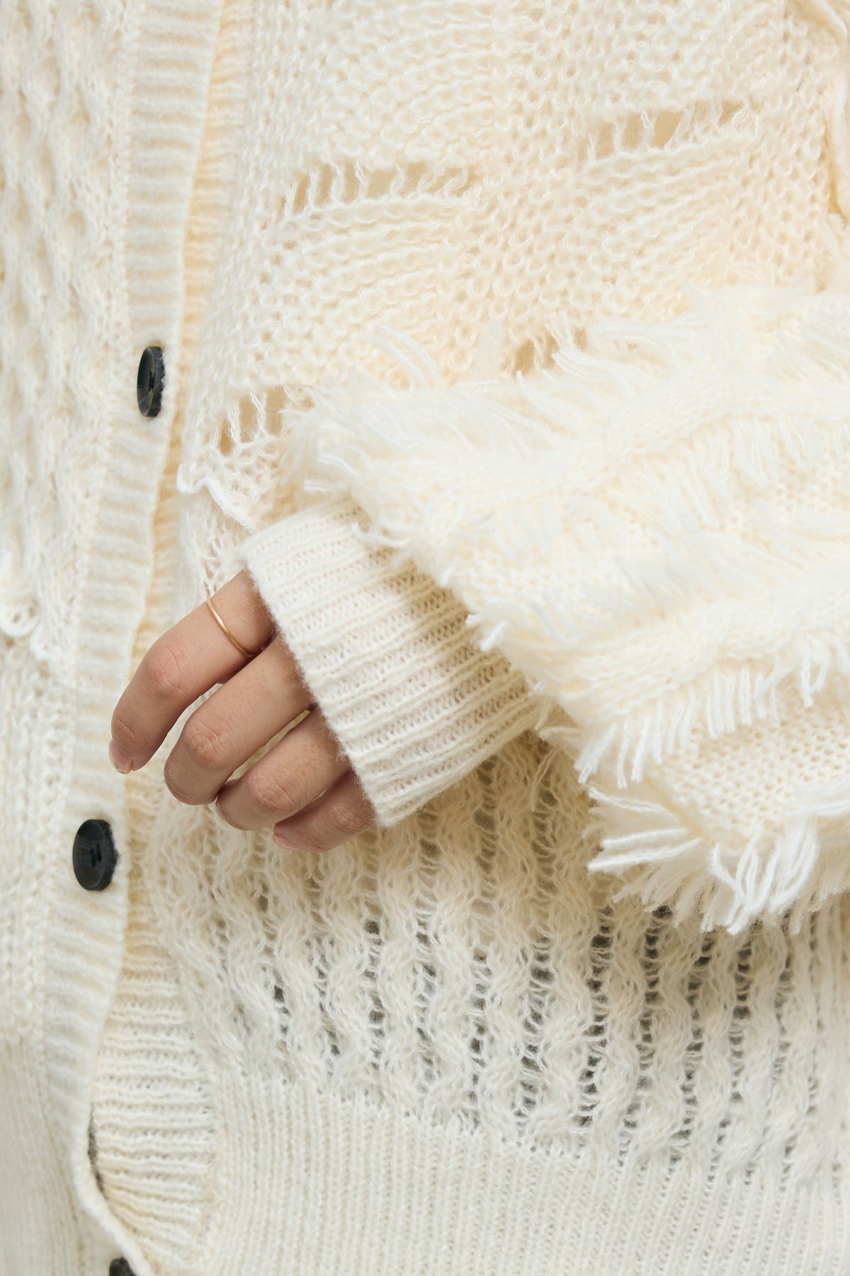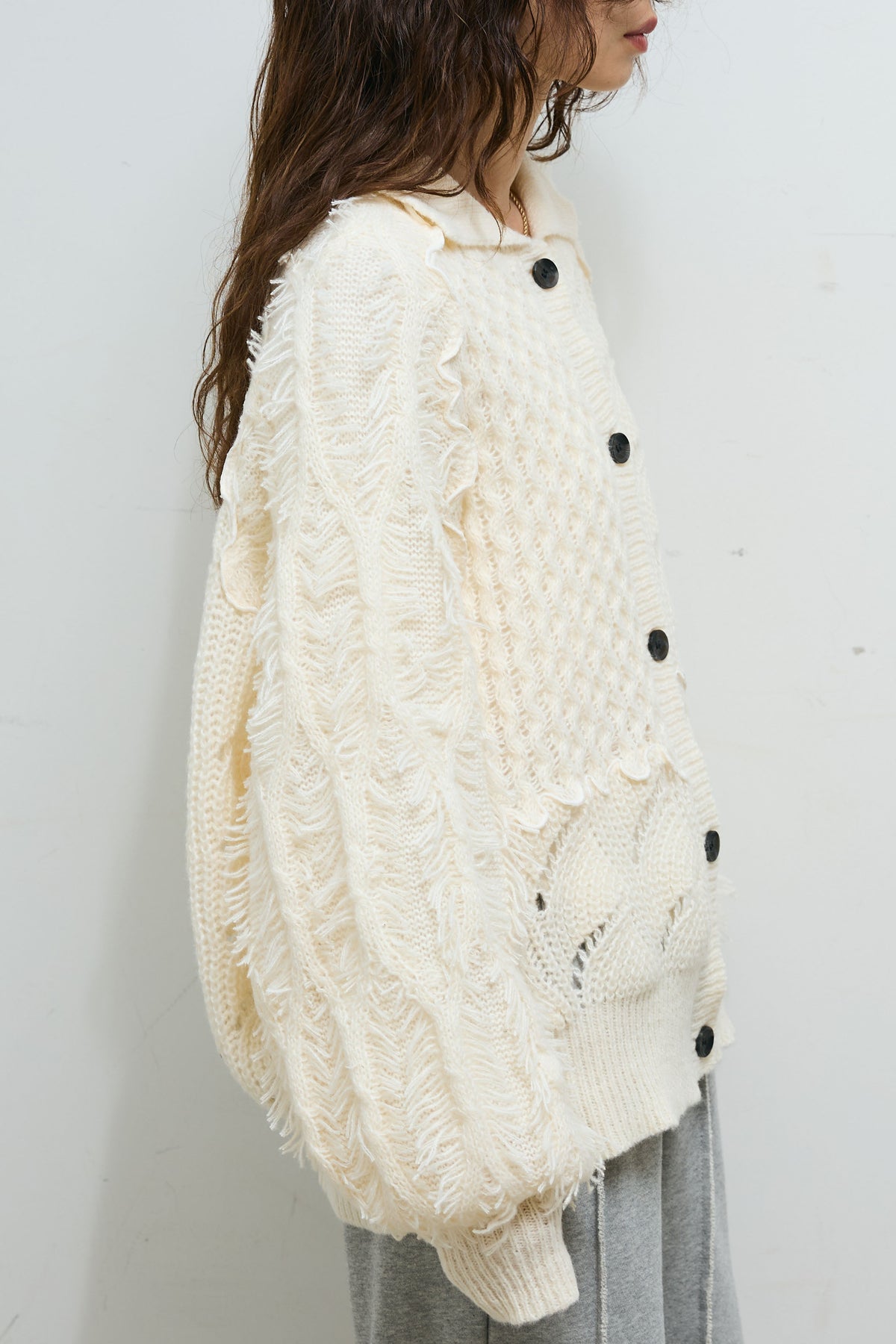 フリンジデザインとカウチン編みが特徴の、ボリューム感たっぷりのカーディガン。ふんわりとした仕上がりで、肩のフリンジがリラックス感を演出します。エッジの効いたカジュアルスタイルにぴったりのアイテムです。シンプルなトップスと合わせて、アクセントとして活躍します。