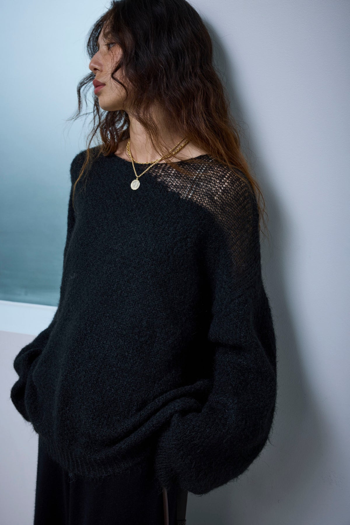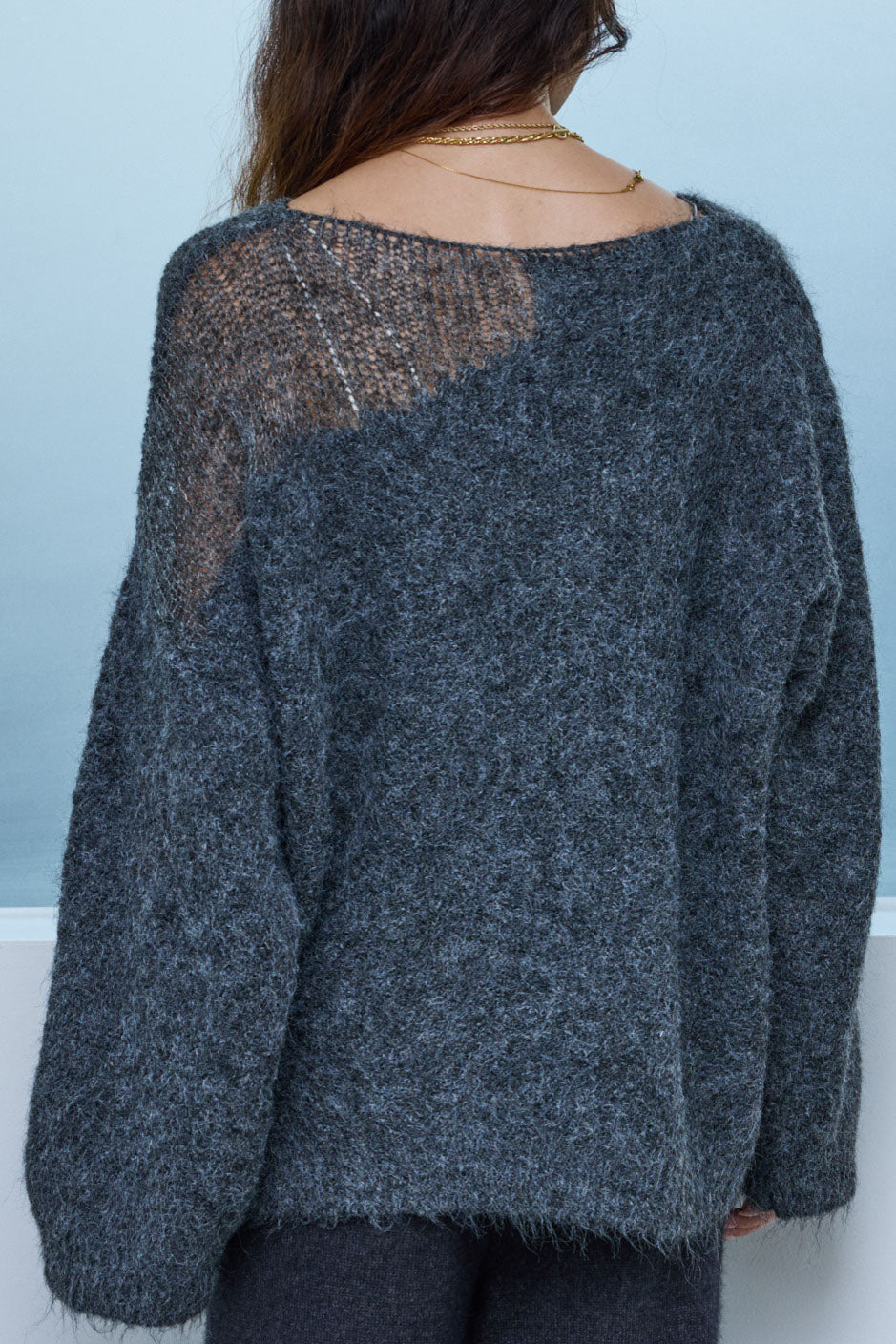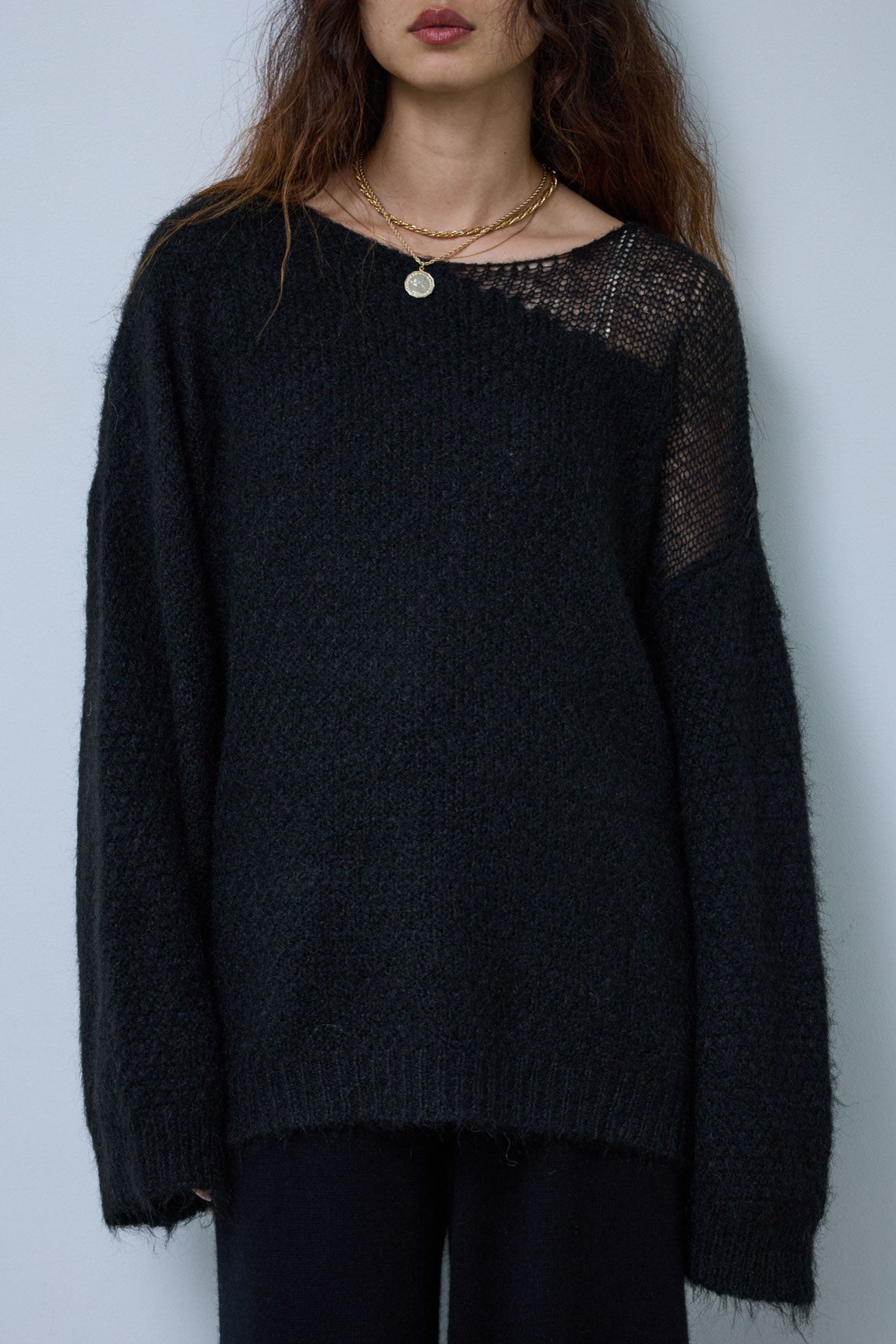 片側に抜け感を持たせたデザインが魅力のアシンメトリーシアーニット。ふんわりとした質感と軽やかな透け感がシーズンムードを高めます。リラックス感のあるシルエットで、インナー次第で印象を変えられるのもポイント。デニムやスカートと合わせて、ナチュラルな抜け感を楽しめる一枚です。