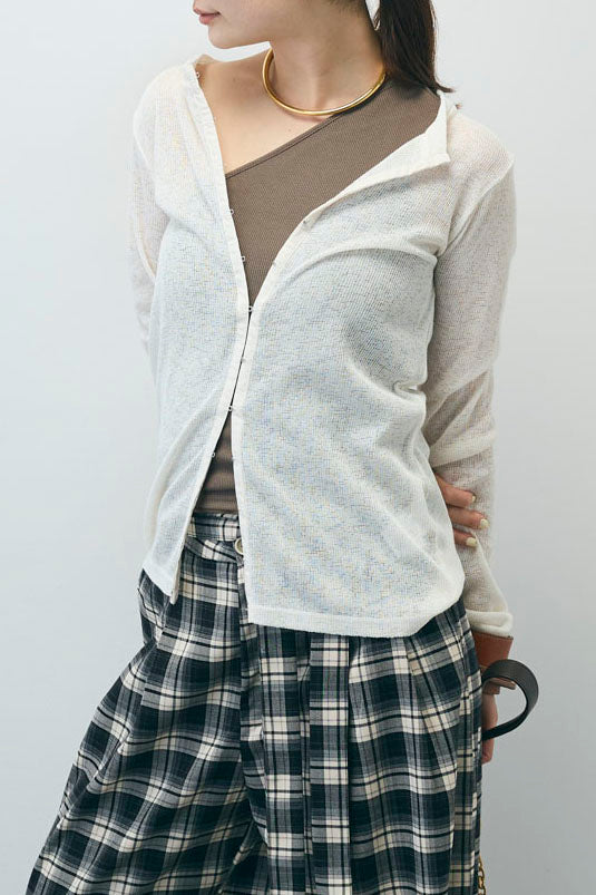 シアー感と程よいラフさが魅力の杢スラブチュニックカーディガン。軽やかな素材感で、春夏のレイヤードにぴったりな一枚。前を開けて羽織るのはもちろん、ボタンを留めてトップス風にも着られる汎用性の高いアイテムです。