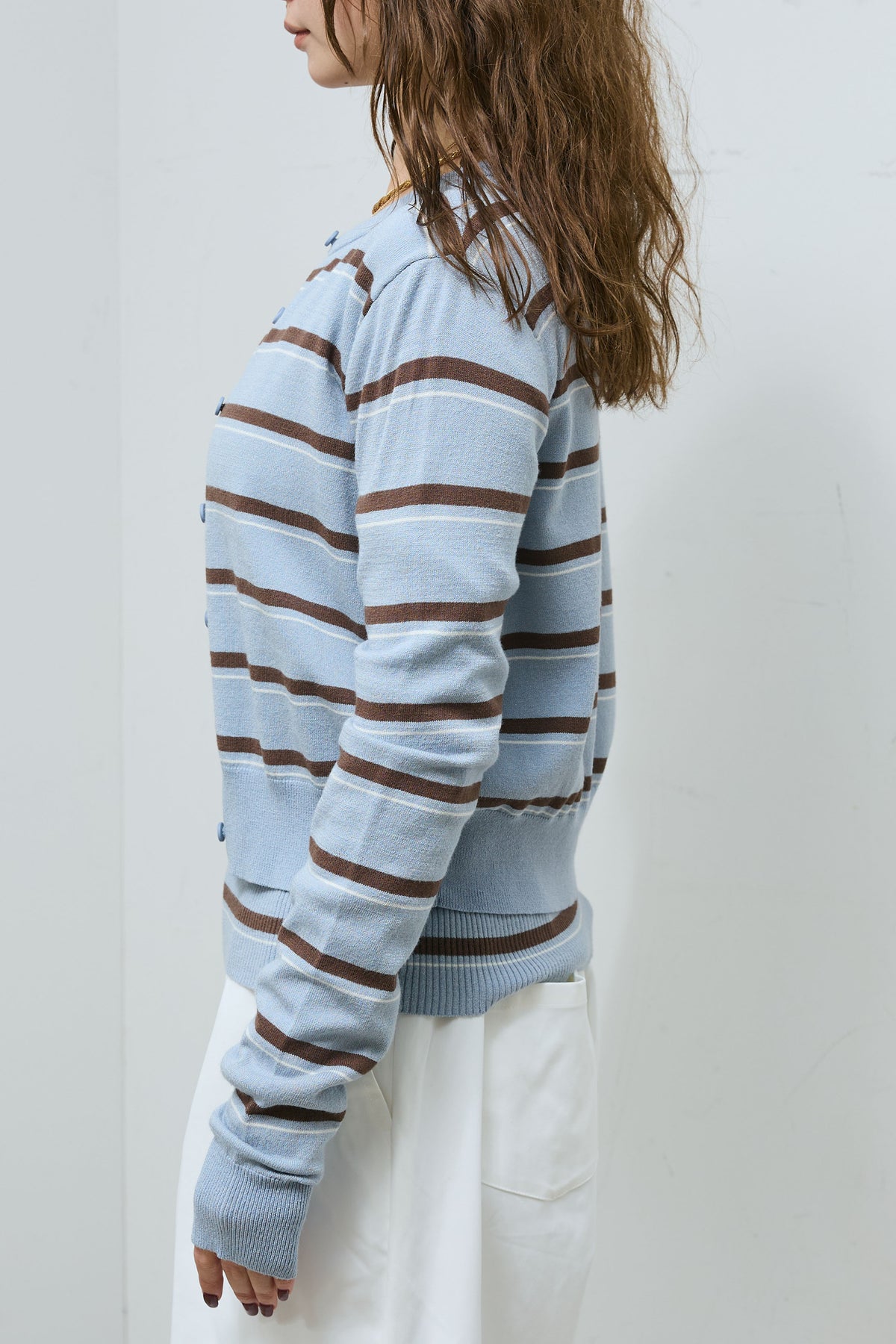 さらりとしたレーヨンナイロン素材で仕立てたボーダーカーディガン。程よくフィットするシルエットが全体をすっきりと見せ、前を閉じても開けてもバランス良く着こなせます。細めのボーダー配色が主張しすぎず、装いに自然なリズムをプラス。トップスとしても羽織りとしても活躍し、デイリーに取り入れやすい一枚です。