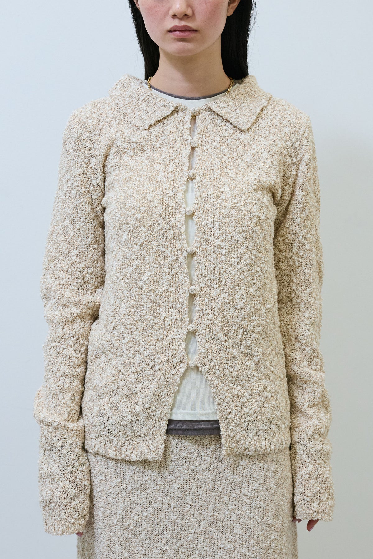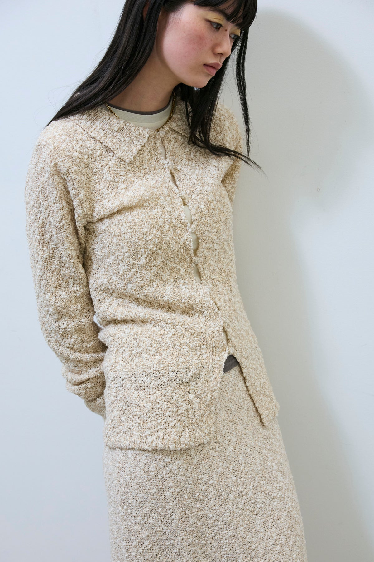 凹凸感のあるツイード風の編み地が、装いに奥行きを添えるポロカーディガン。MIXスラブ糸ならではの立体的な表情が、シンプルなスタイリングにも自然な存在感をもたらします。コンパクトな襟デザインが全体をすっきりとまとめ、ボタンを留めても開けてもバランスよく着用可能。トップスとしても羽織りとしても取り入れやすく、着こなしの幅が広がる一枚です。