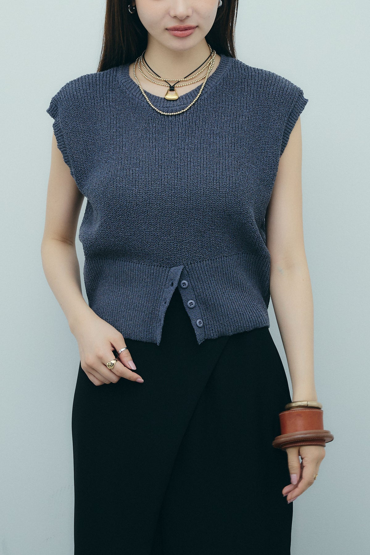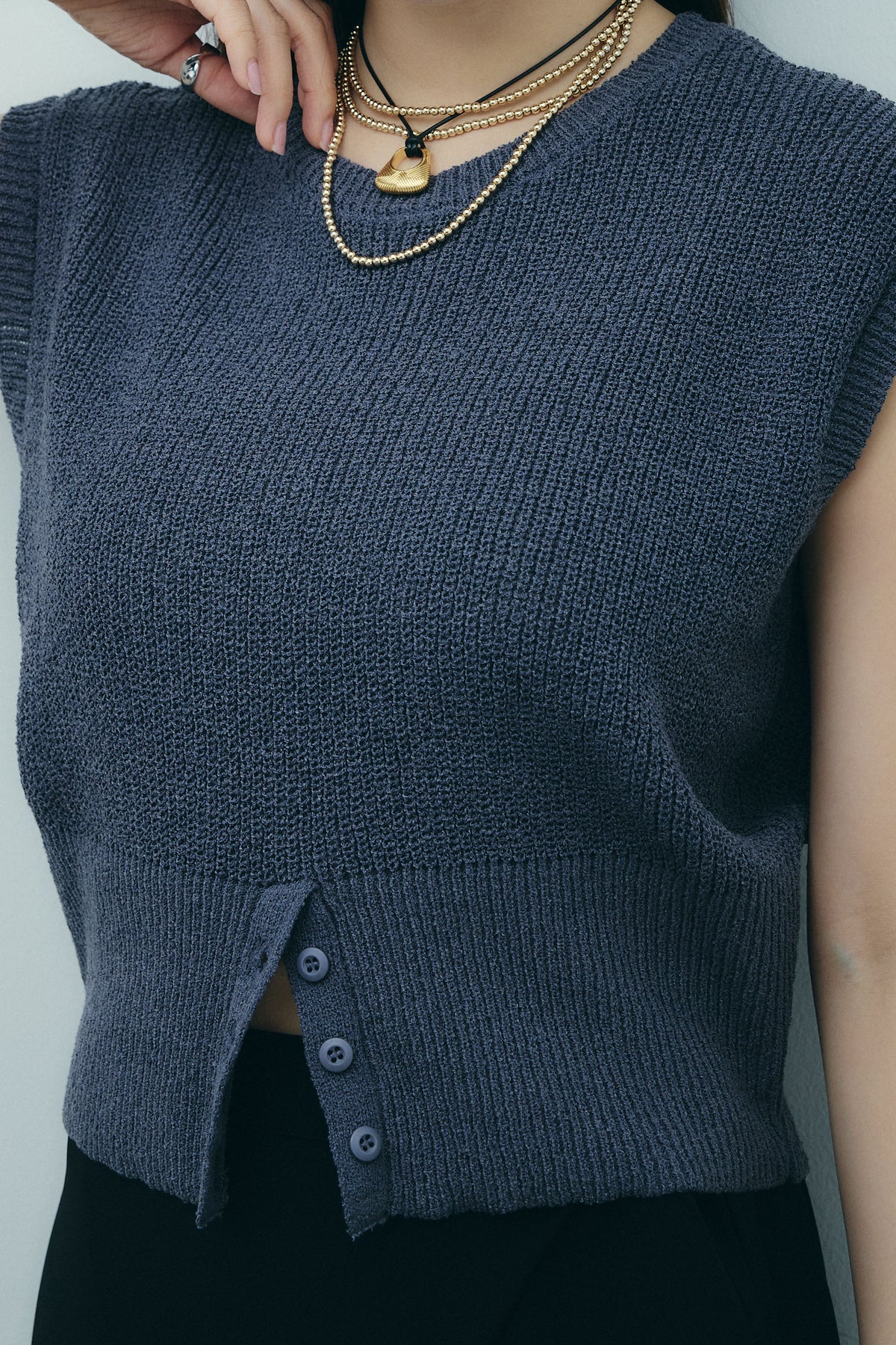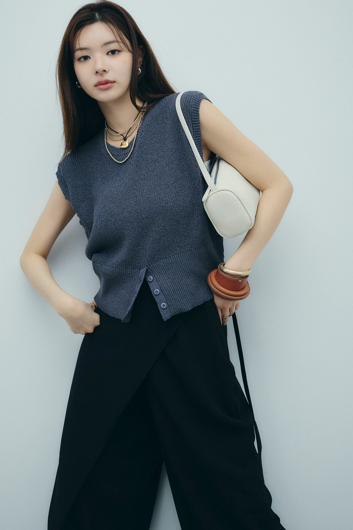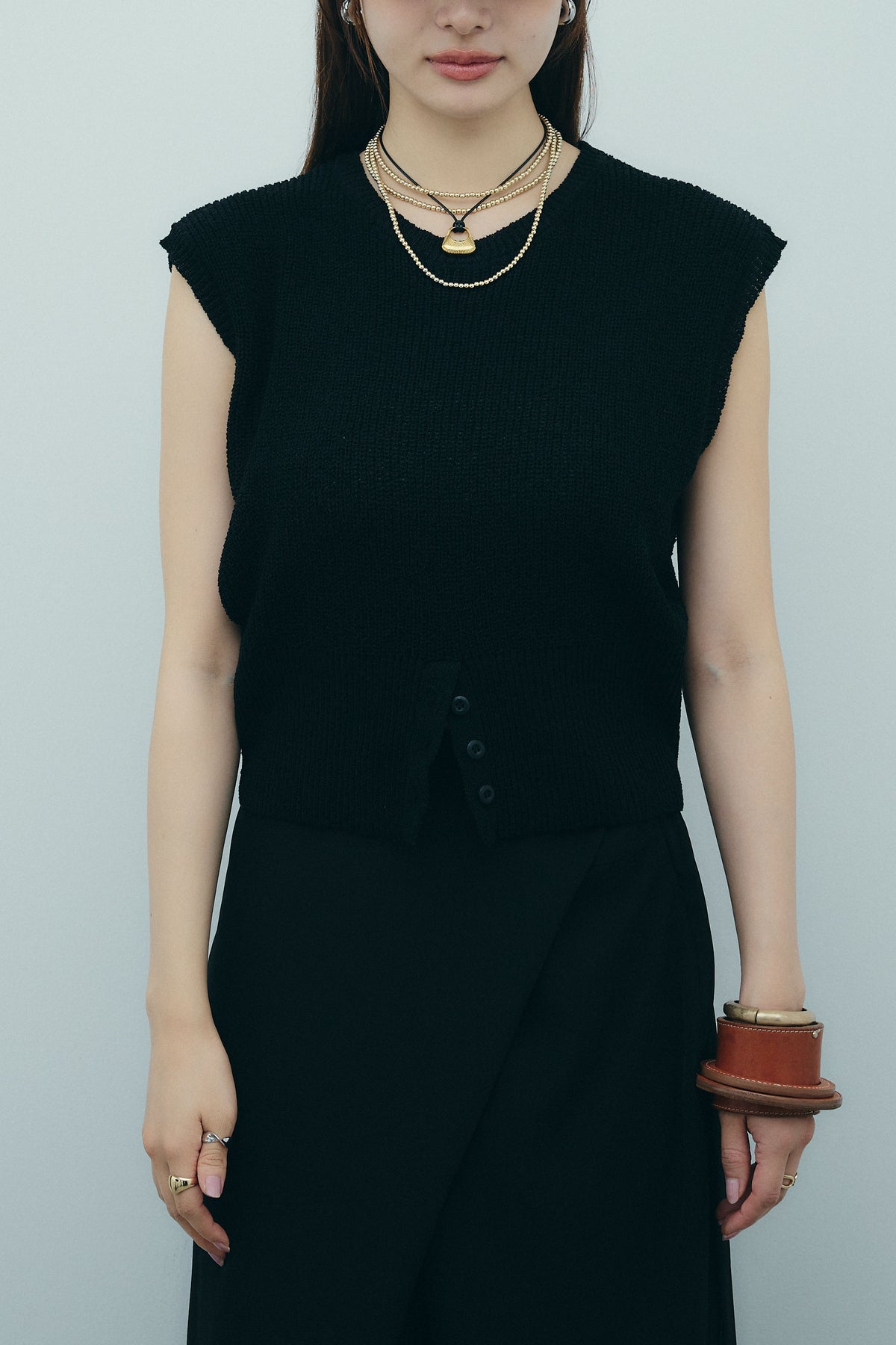 通気性の良い片畔編みが涼しげなサマーニット。コンパクトなシルエットに前身頃のボタンディテールがアクセントを添えています。シンプルながらも存在感があり、カジュアルからきれいめまで幅広いスタイリングに活躍するアイテムです。