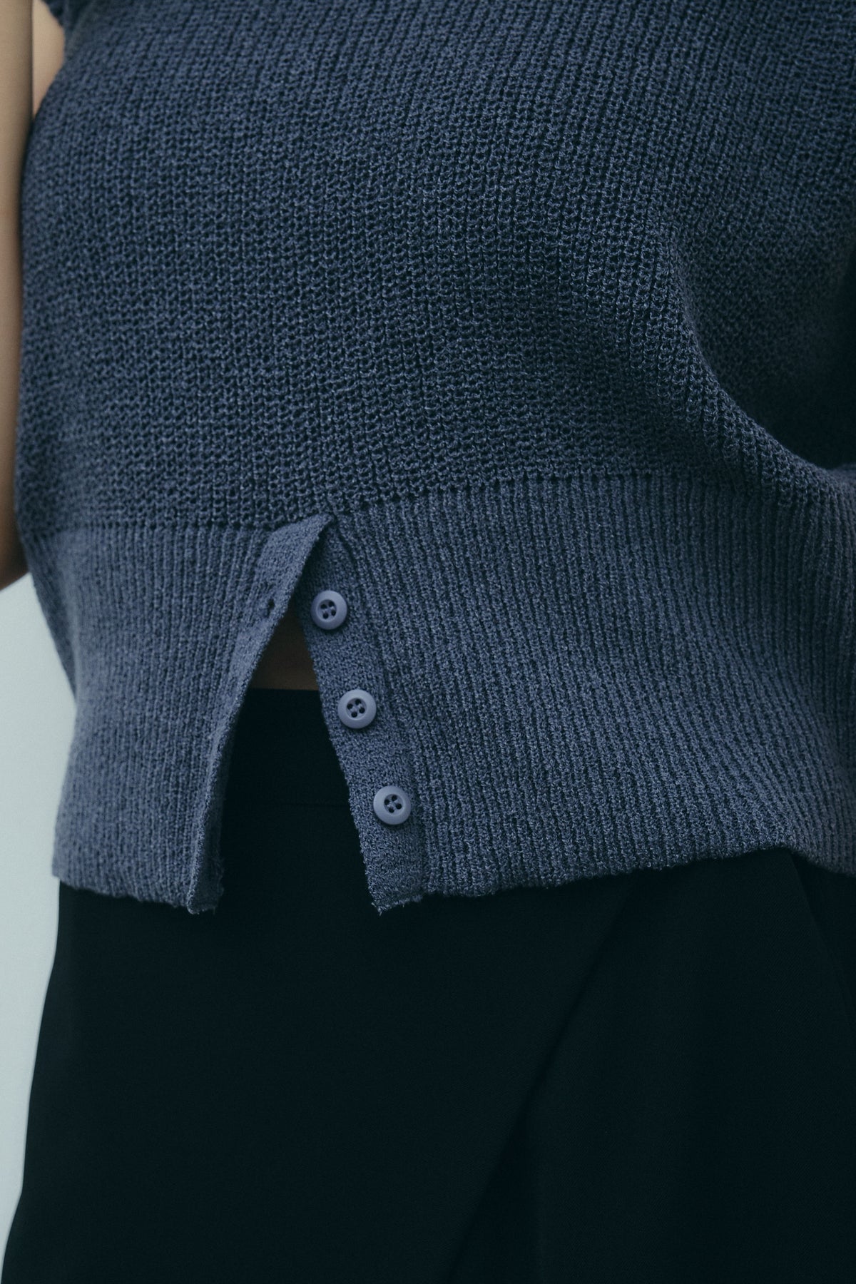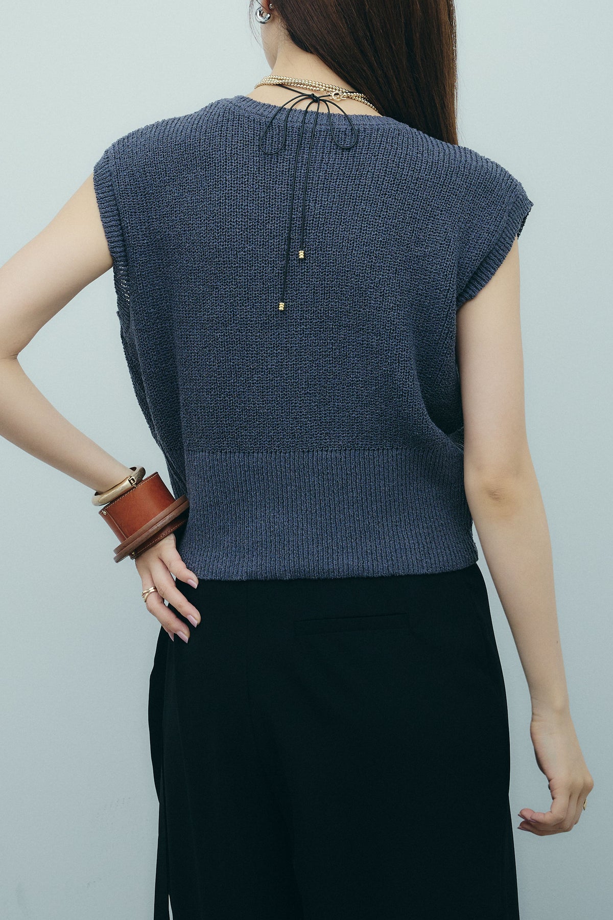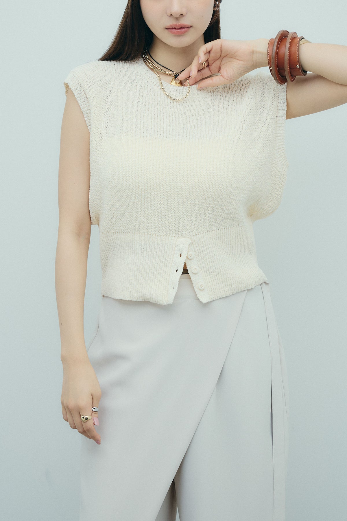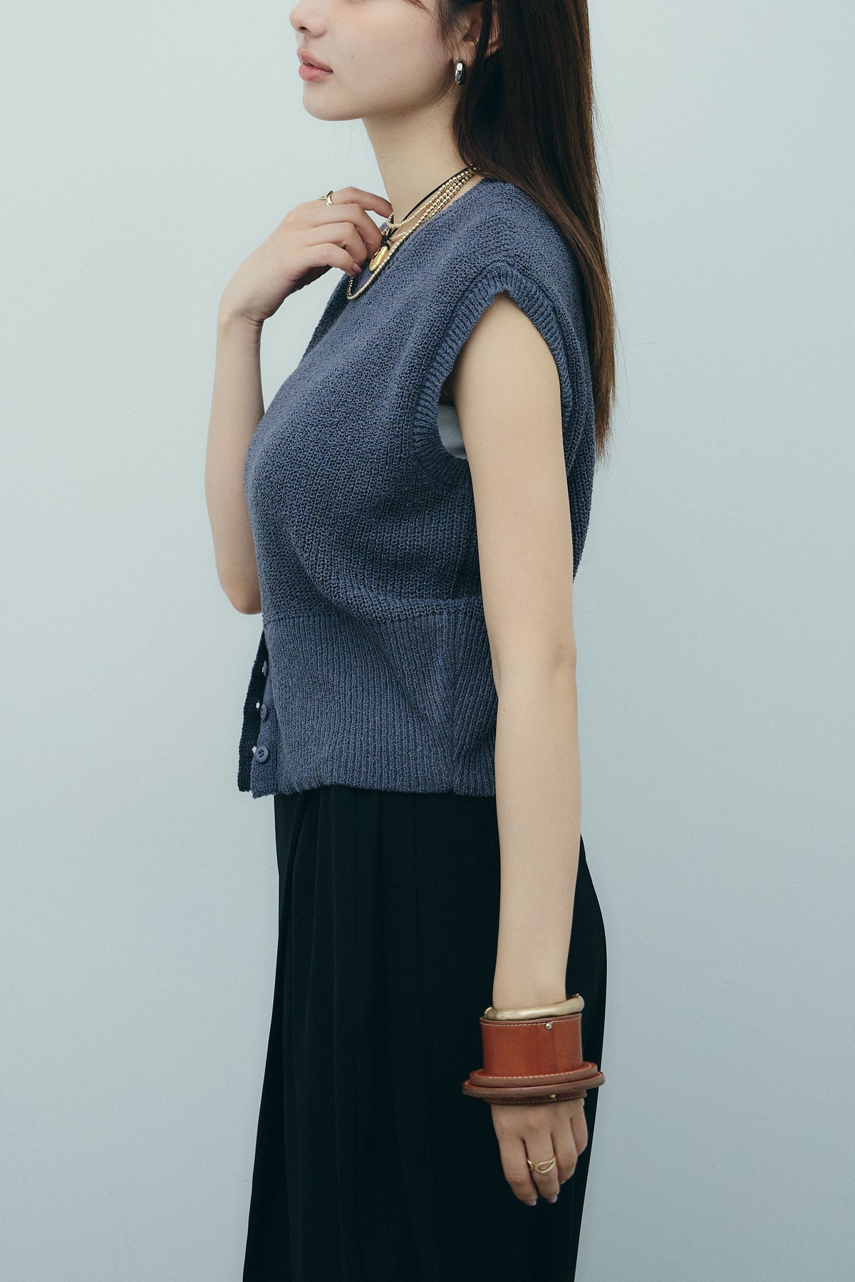 通気性の良い片畔編みが涼しげなサマーニット。コンパクトなシルエットに前身頃のボタンディテールがアクセントを添えています。シンプルながらも存在感があり、カジュアルからきれいめまで幅広いスタイリングに活躍するアイテムです。