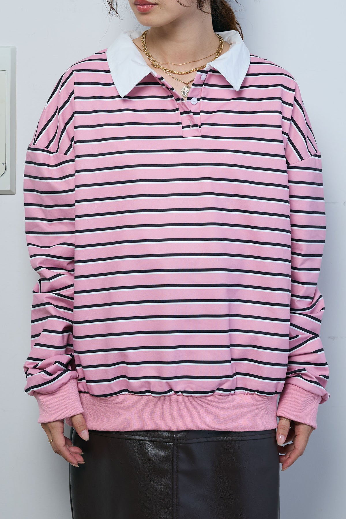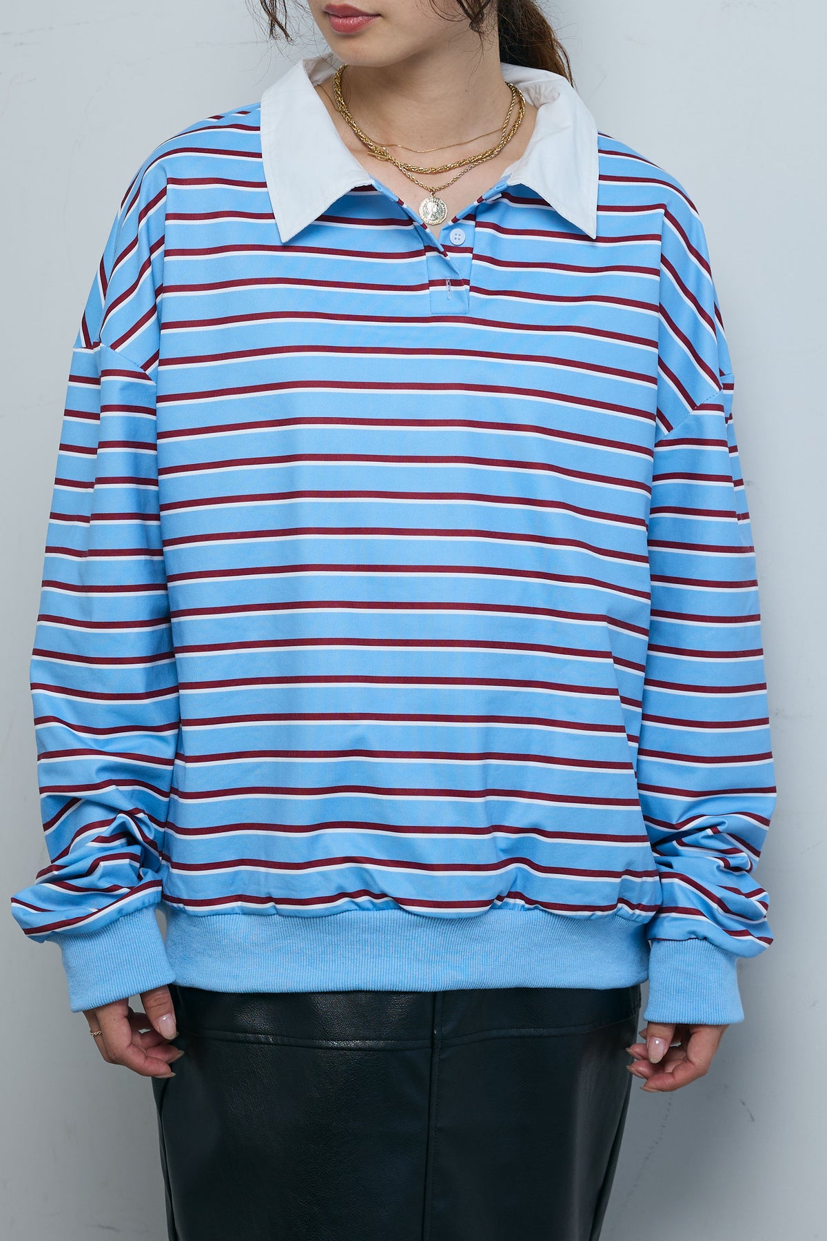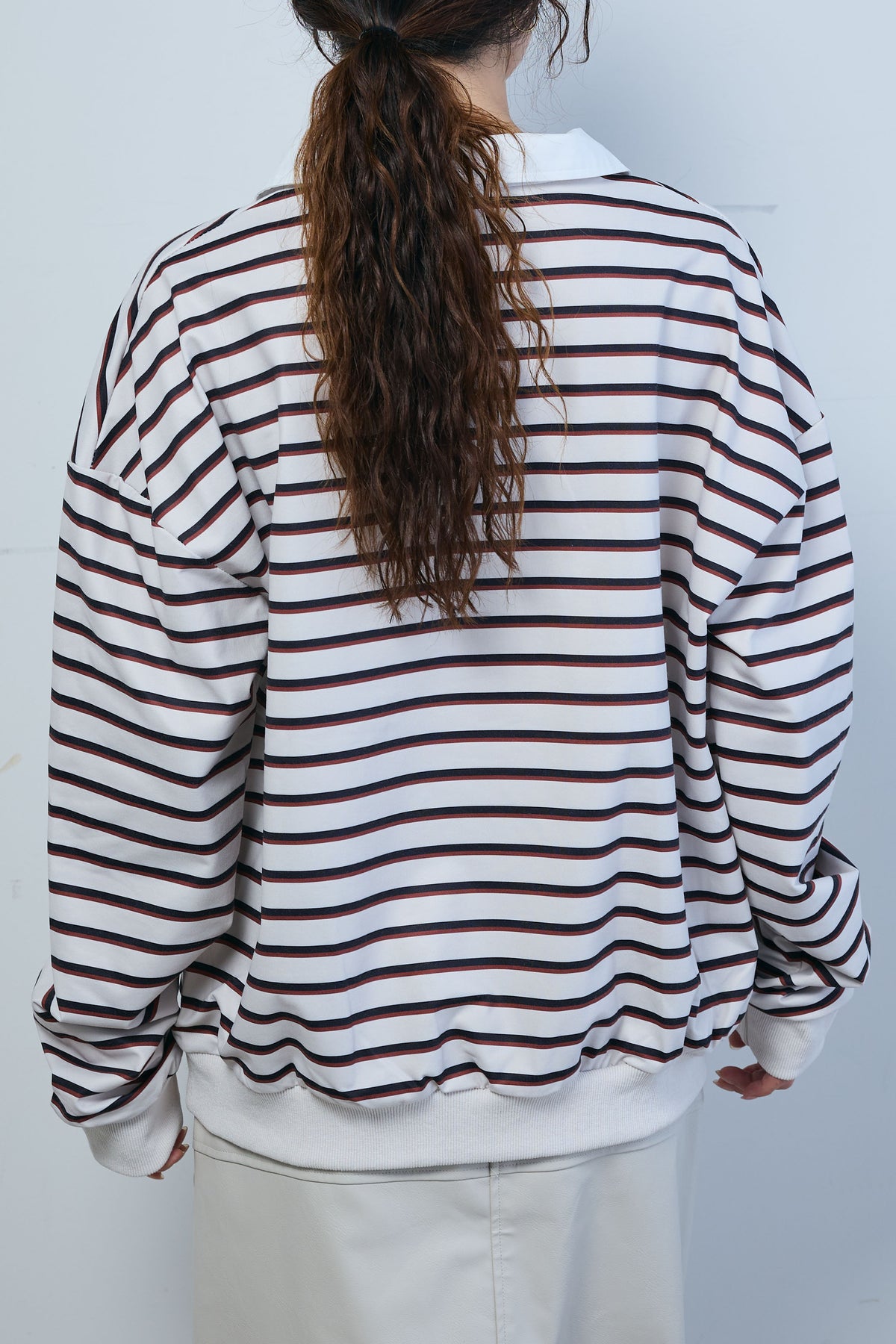 ポロ襟ボーダーTOPSは、クラシカルなポロ襟デザインと爽やかなボーダー柄が特徴のトップスで、カジュアルながらもきちんと感を演出します。程よいゆとりのあるシルエットで動きやすく、デニムやスカートと合わせて幅広いコーディネートが楽しめるアイテムです。