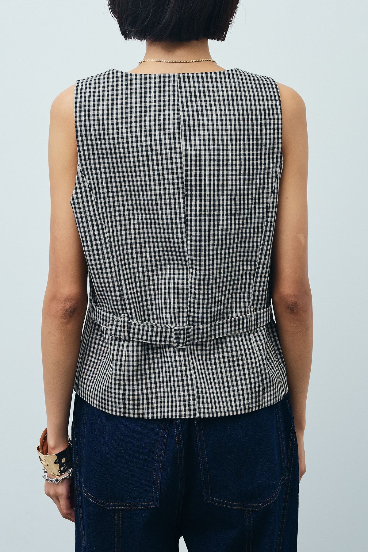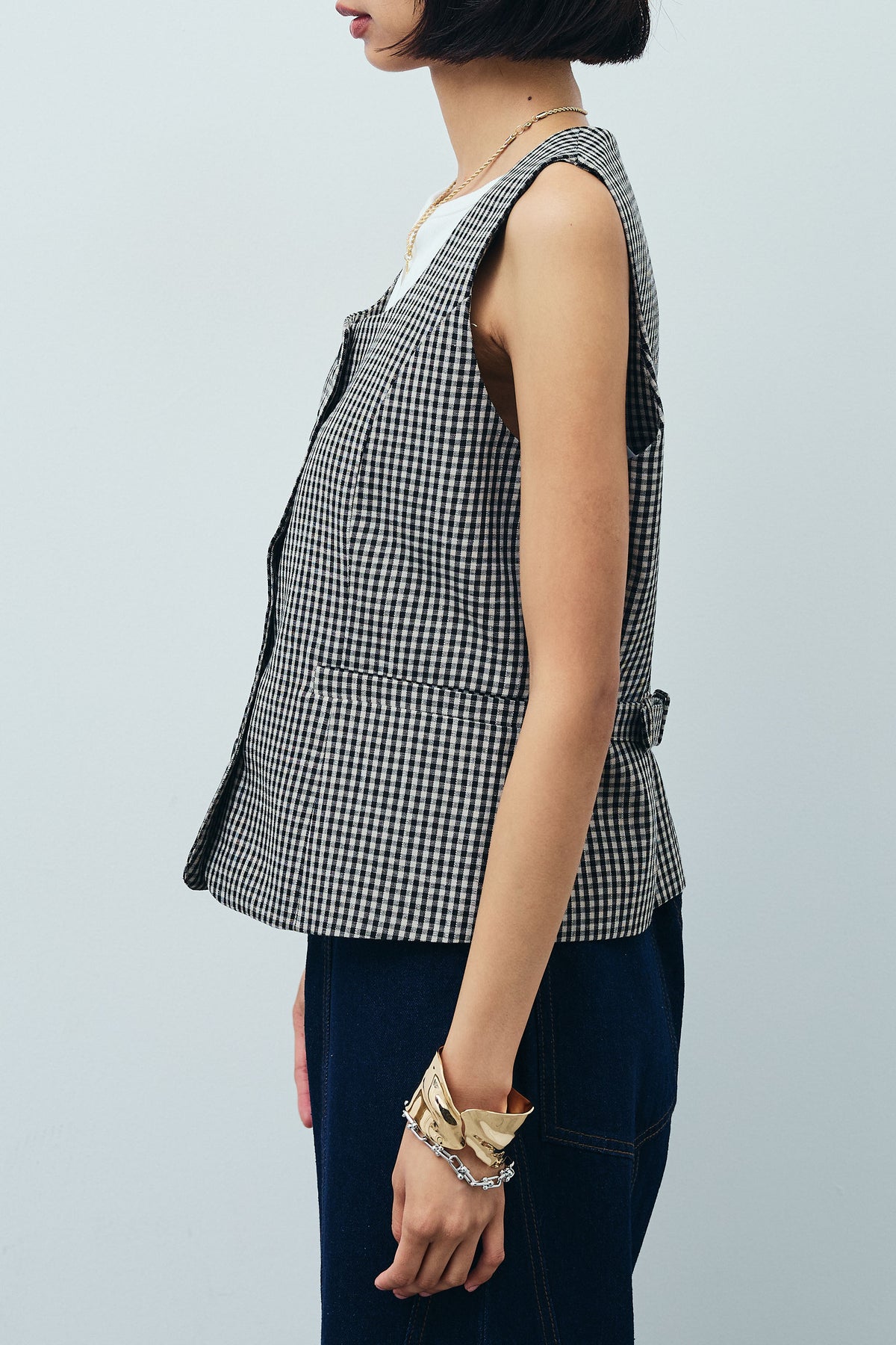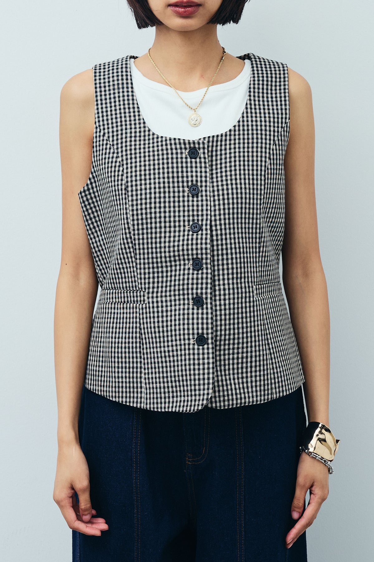 細かなチェック柄が印象的なベスト。すっきりとしたシルエットとコンパクトな丈感で、Tシャツやブラウスとのレイヤードを楽しめます。前面のボタンデザインがクラシックな雰囲気をプラス。パンツやスカート、どちらとも好相性で、季節を問わず活躍するアイテムです。