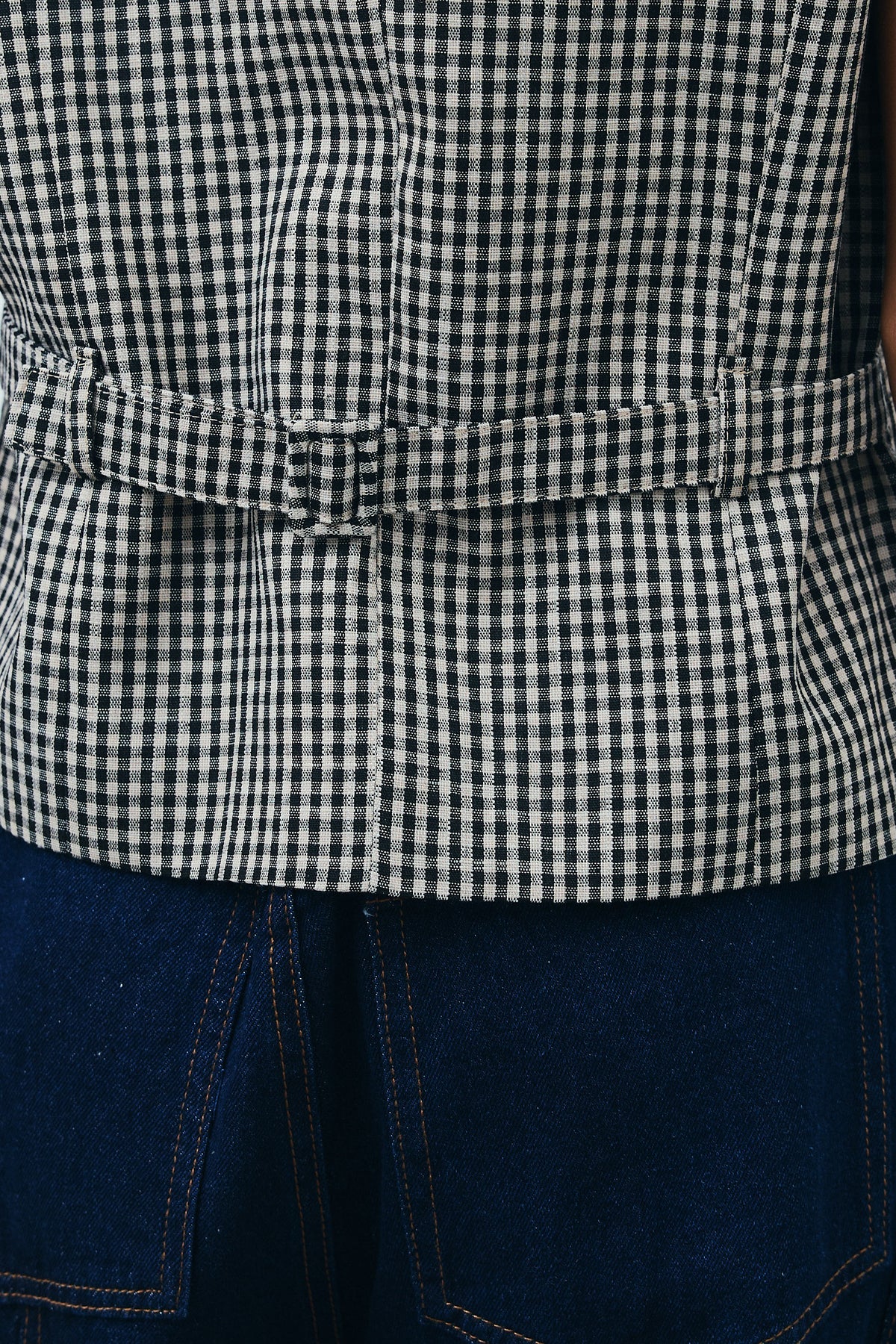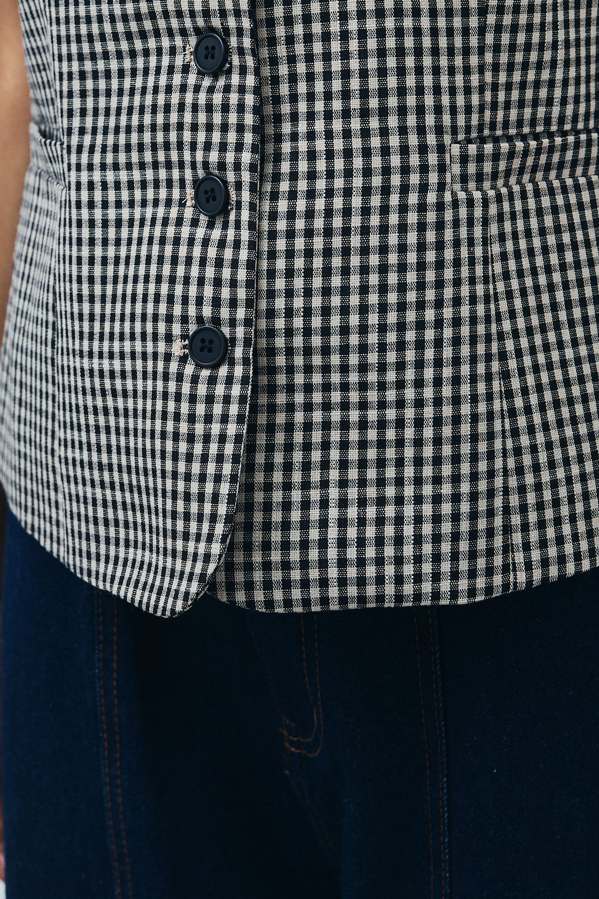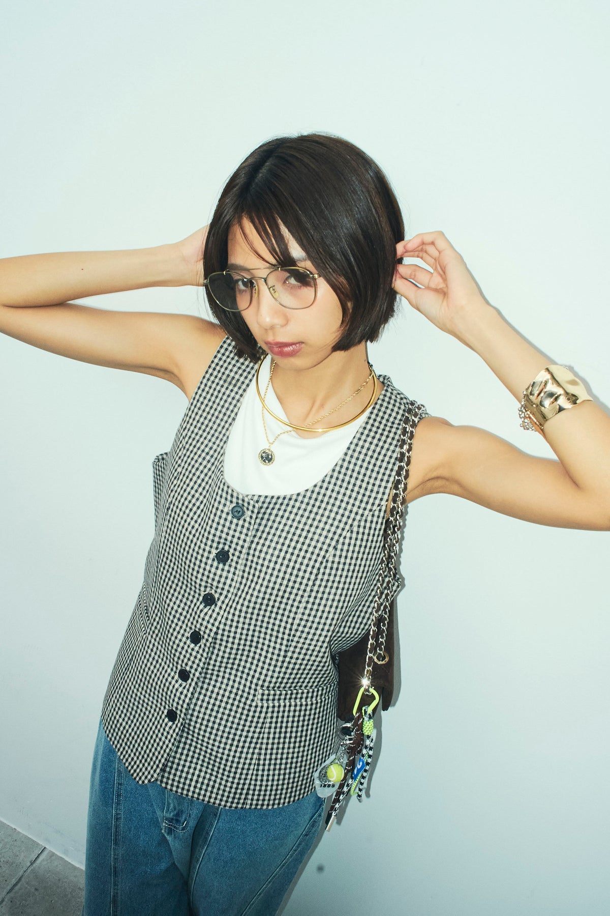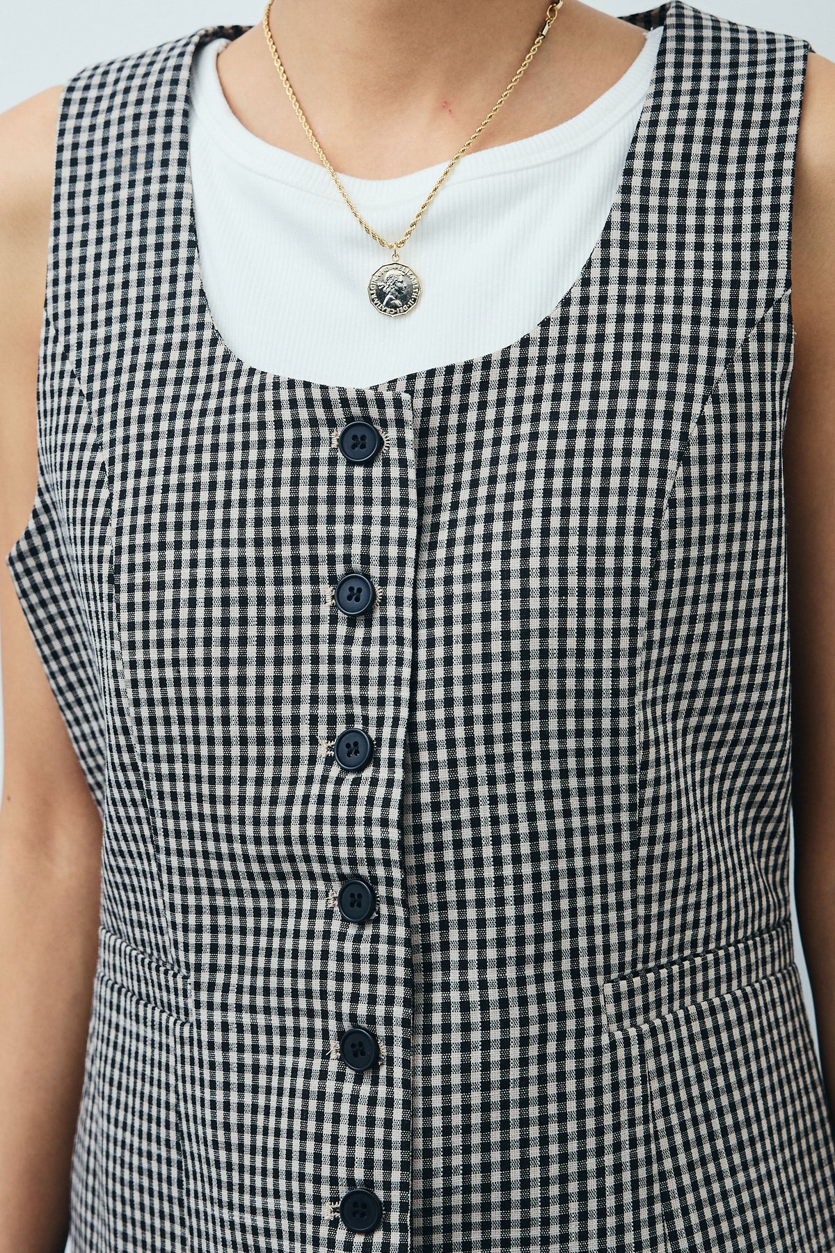 細かなチェック柄が印象的なベスト。すっきりとしたシルエットとコンパクトな丈感で、Tシャツやブラウスとのレイヤードを楽しめます。前面のボタンデザインがクラシックな雰囲気をプラス。パンツやスカート、どちらとも好相性で、季節を問わず活躍するアイテムです。
