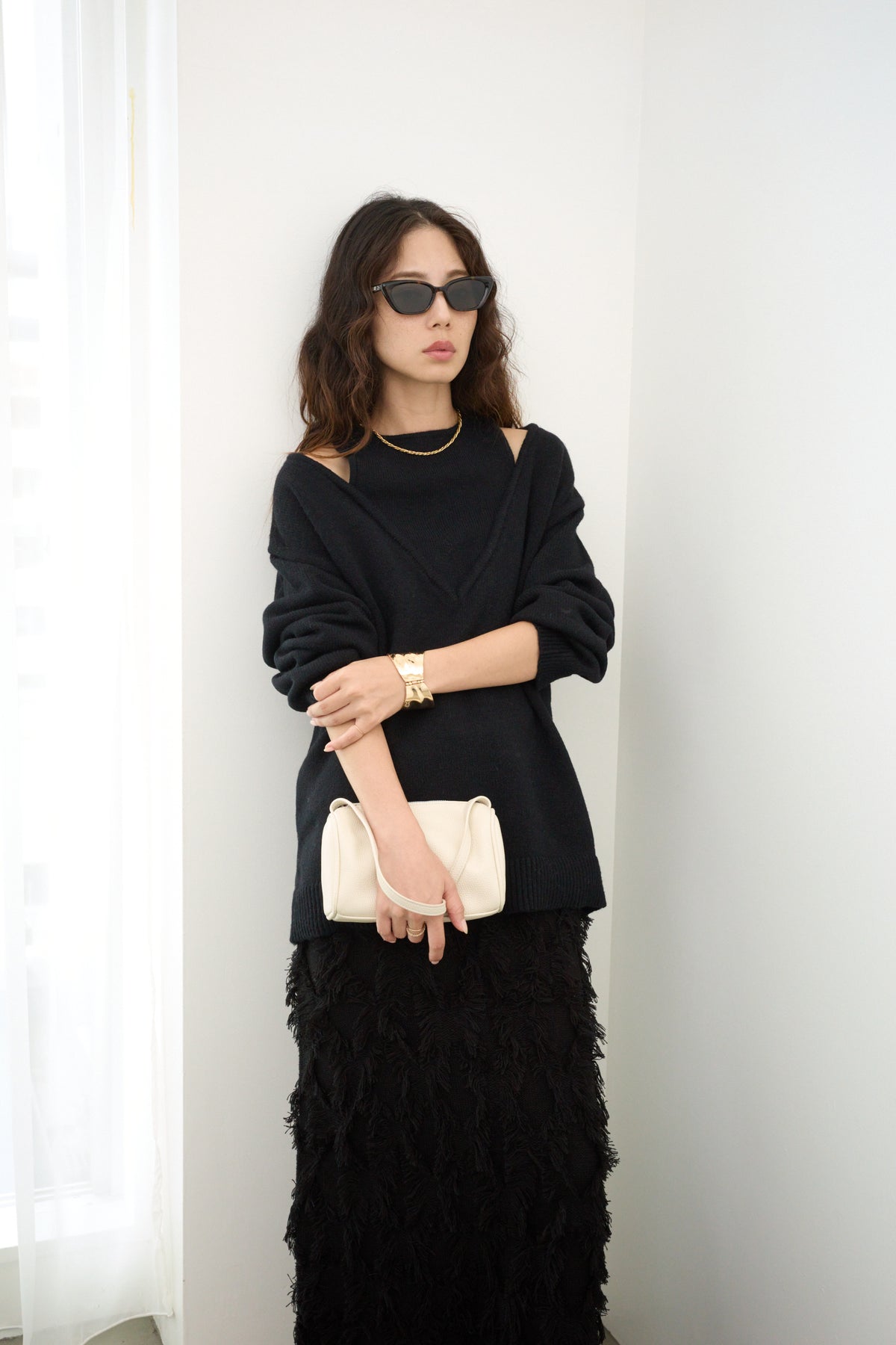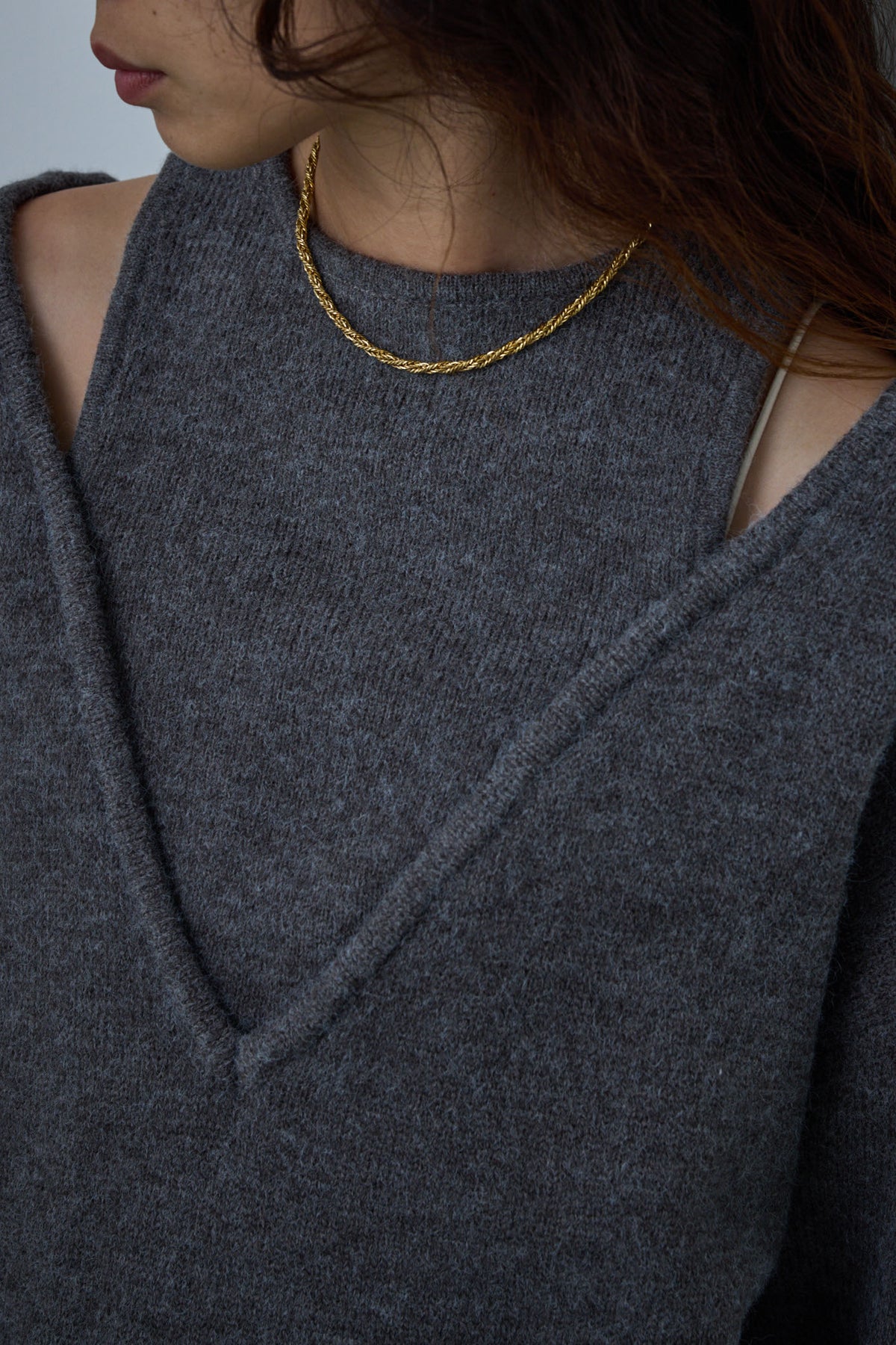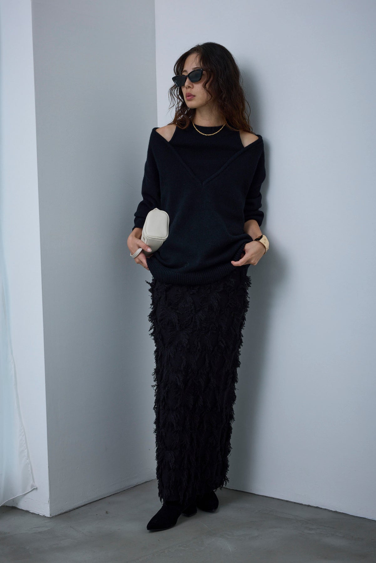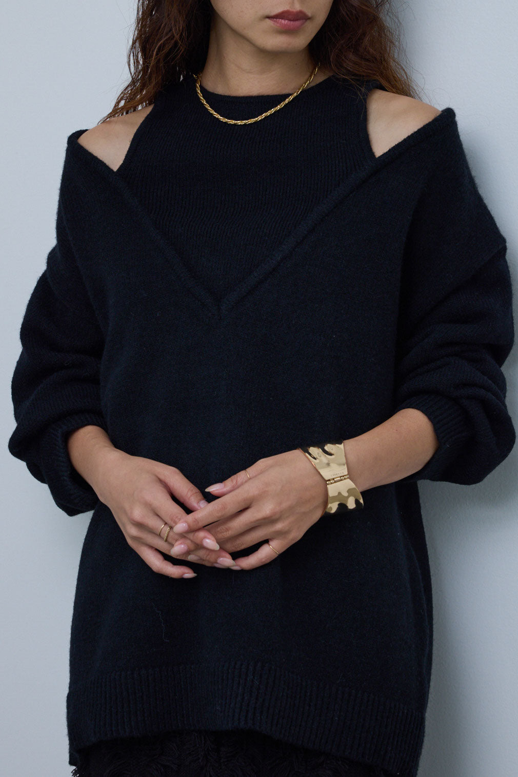 大胆なショルダースリットが目を惹くニットトップス。レイヤード風のデザインがトレンド感をプラスし、1枚で着映えするアイテムです。ゆったりとしたシルエットと柔らかな素材感で着心地も抜群。シンプルなボトムを合わせるだけでバランスよく仕上がり、デイリーコーデに程よい抜け感を与えてくれます。