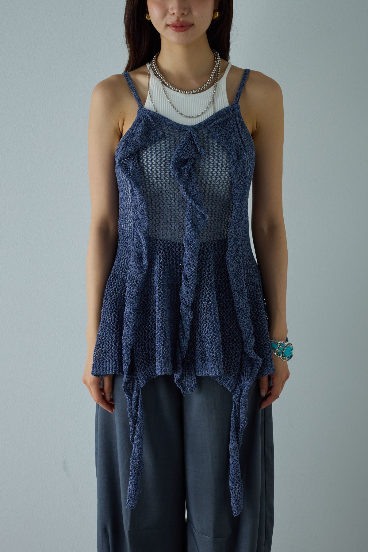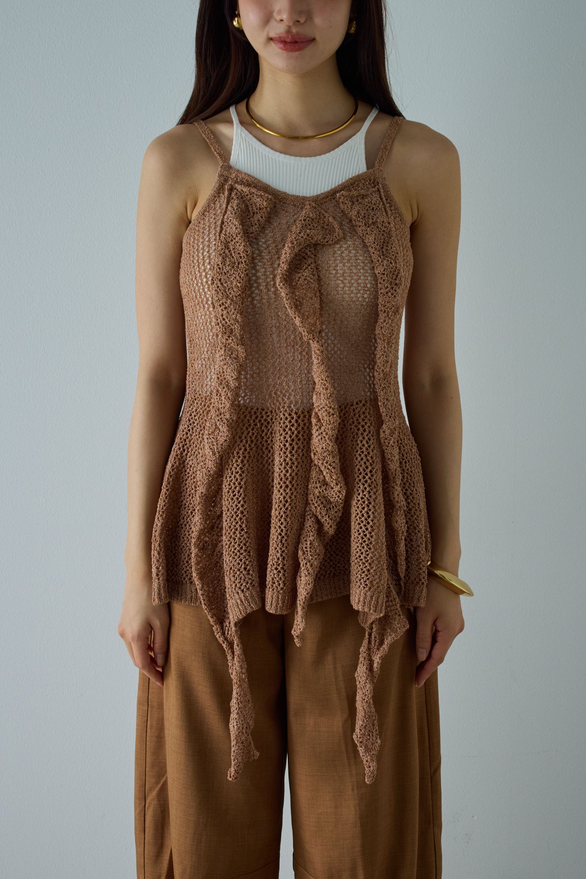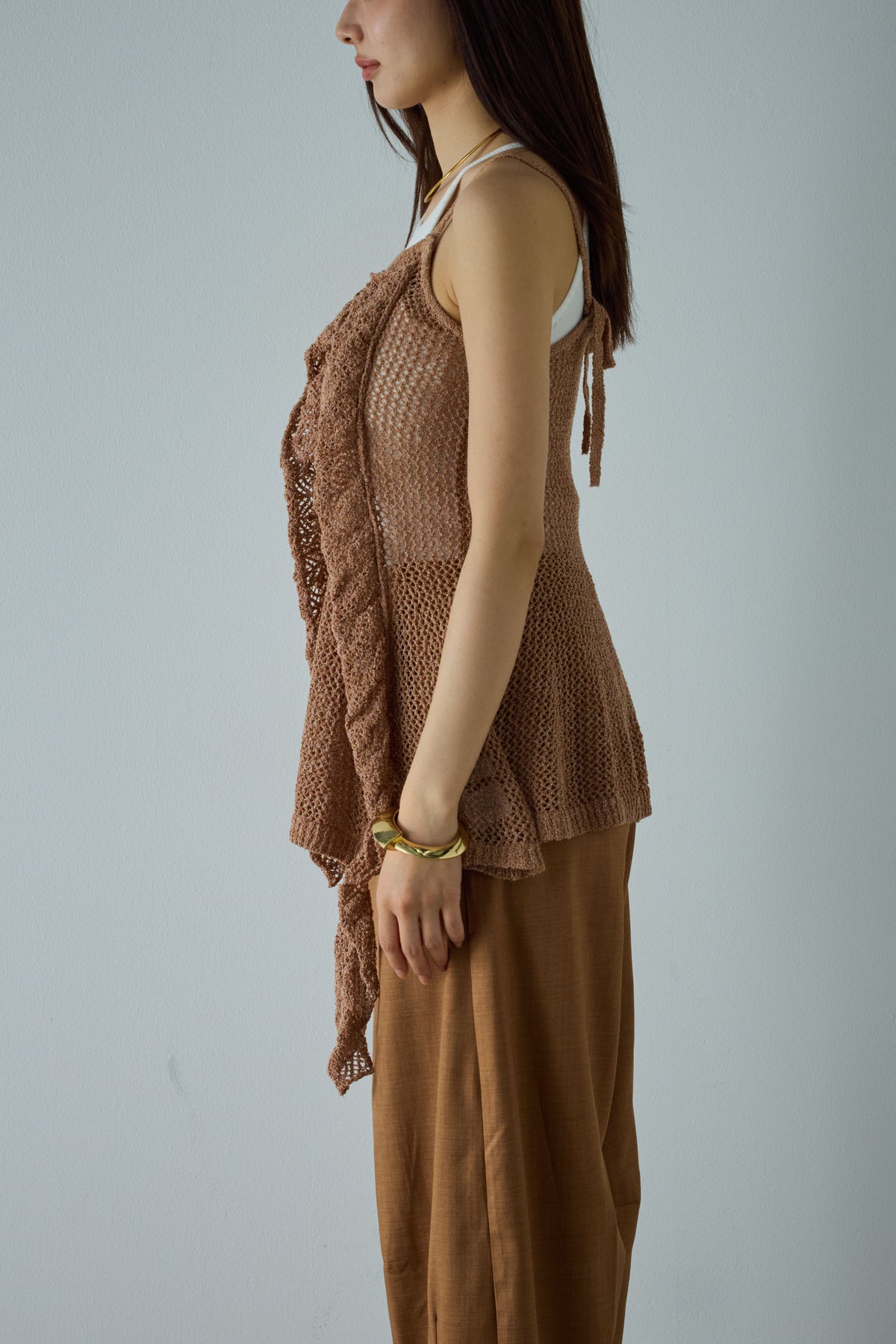 軽やかなメッシュ素材にフリルデザインが特徴的なニットキャミソール。ドレープ感のあるフリルが、カジュアルな中にも女性らしさをプラスし、着るだけで華やかな印象を与えてくれます。フロント部分には編み目が美しく、肩紐のデザインがアクセントに。シンプルなインナーとして、またはカジュアルコーディネートに合わせやすいアイテムです。柔らかな肌触りで快適な着心地を提供し、春夏のスタイルにぴったりな一枚です。