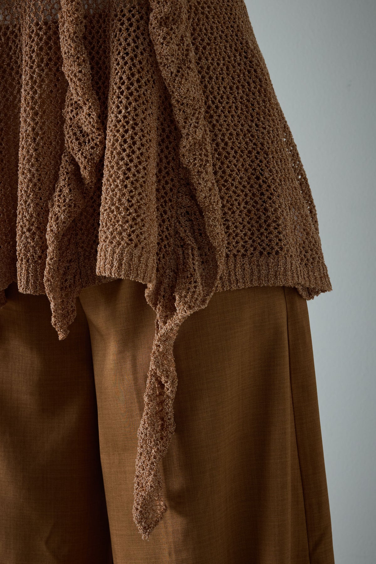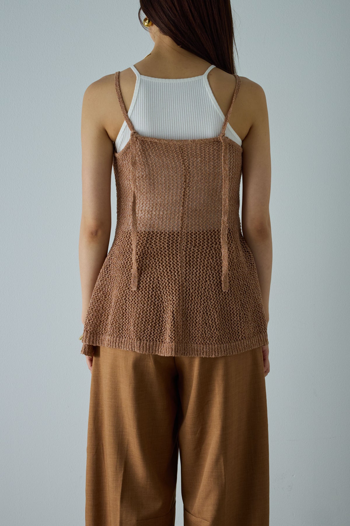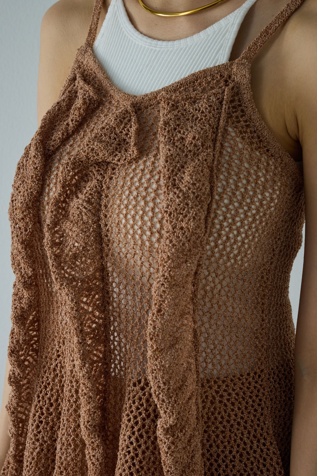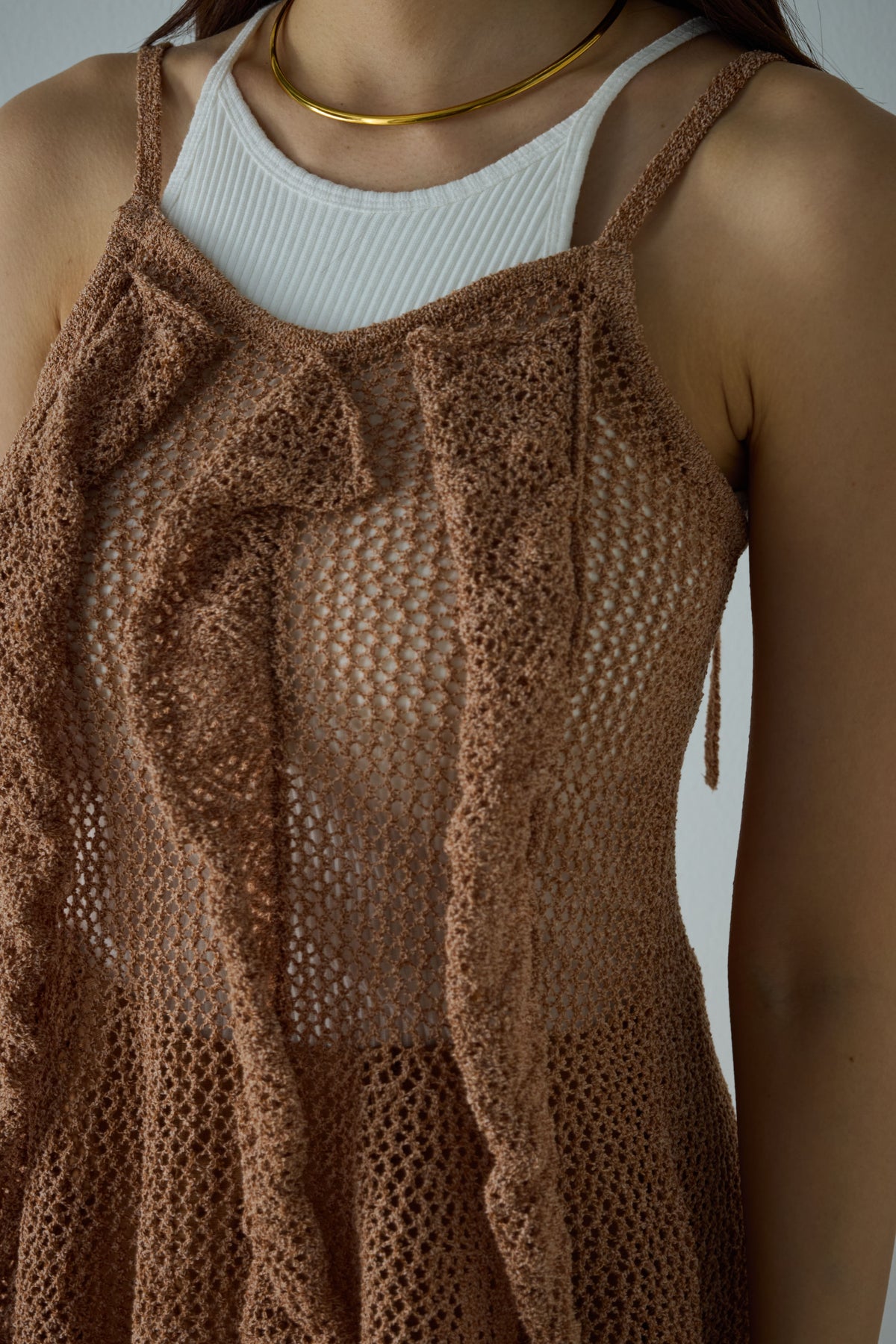 軽やかなメッシュ素材にフリルデザインが特徴的なニットキャミソール。ドレープ感のあるフリルが、カジュアルな中にも女性らしさをプラスし、着るだけで華やかな印象を与えてくれます。フロント部分には編み目が美しく、肩紐のデザインがアクセントに。シンプルなインナーとして、またはカジュアルコーディネートに合わせやすいアイテムです。柔らかな肌触りで快適な着心地を提供し、春夏のスタイルにぴったりな一枚です。