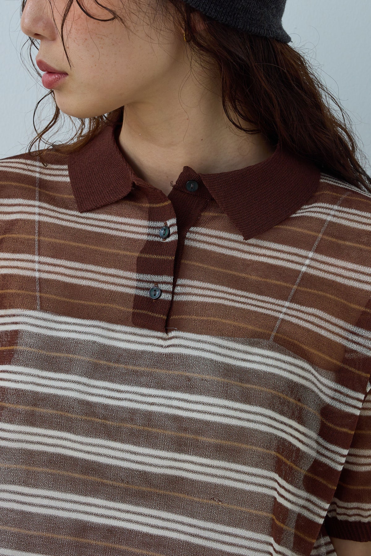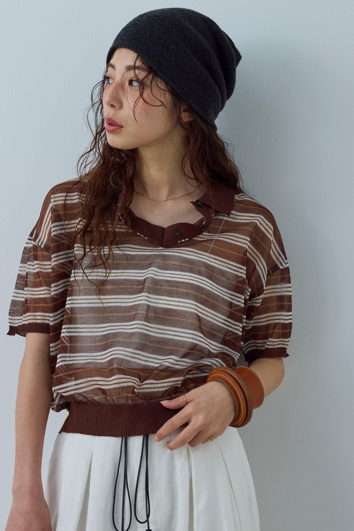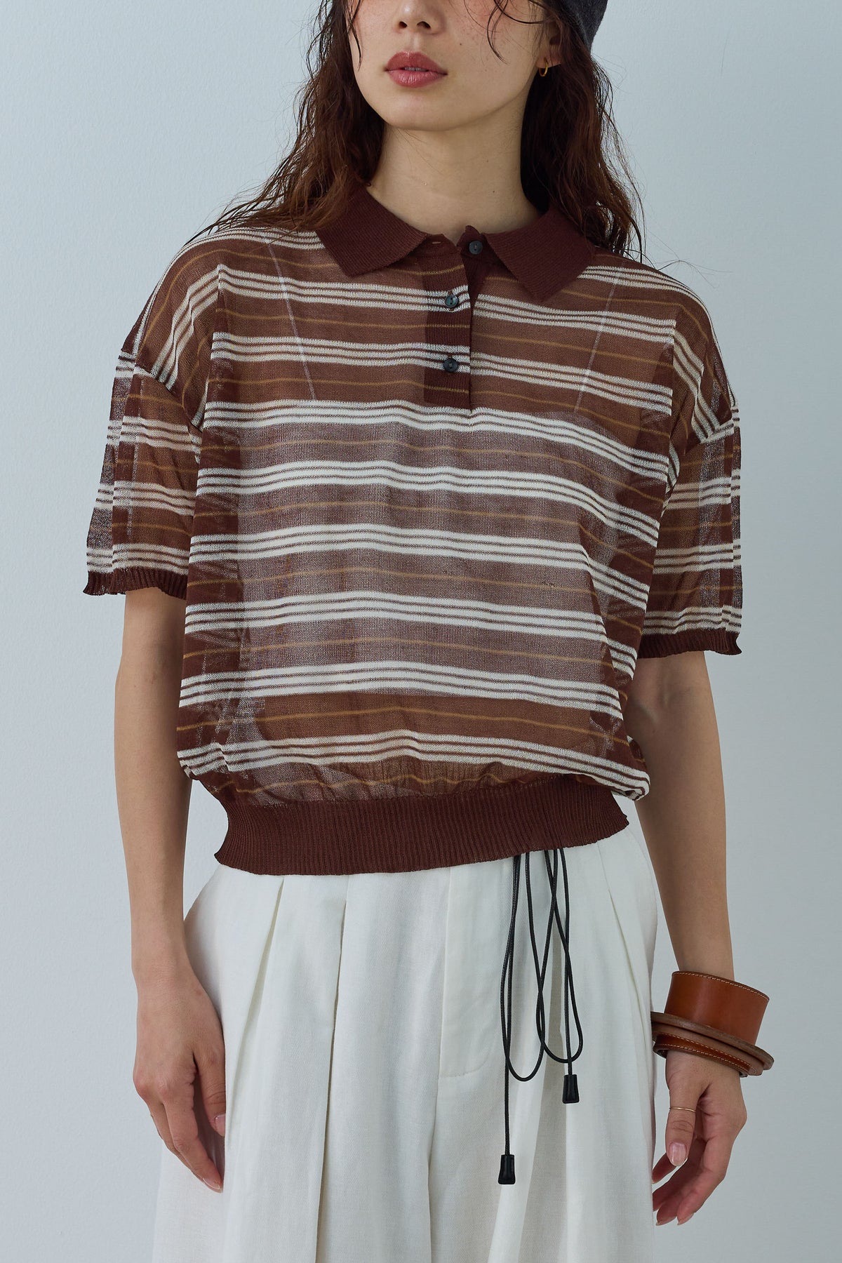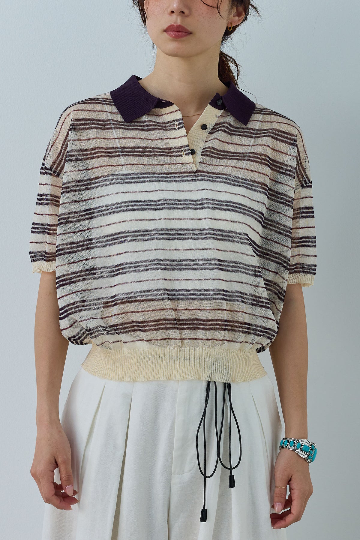 透け感のある生地で、ボーダーデザインが特徴的なポロシャツスタイルのトップスです。カジュアルながらもシアー素材のため、軽やかで涼しげな印象を与えるアイテムです。