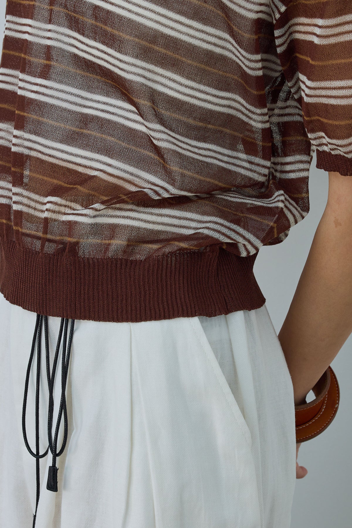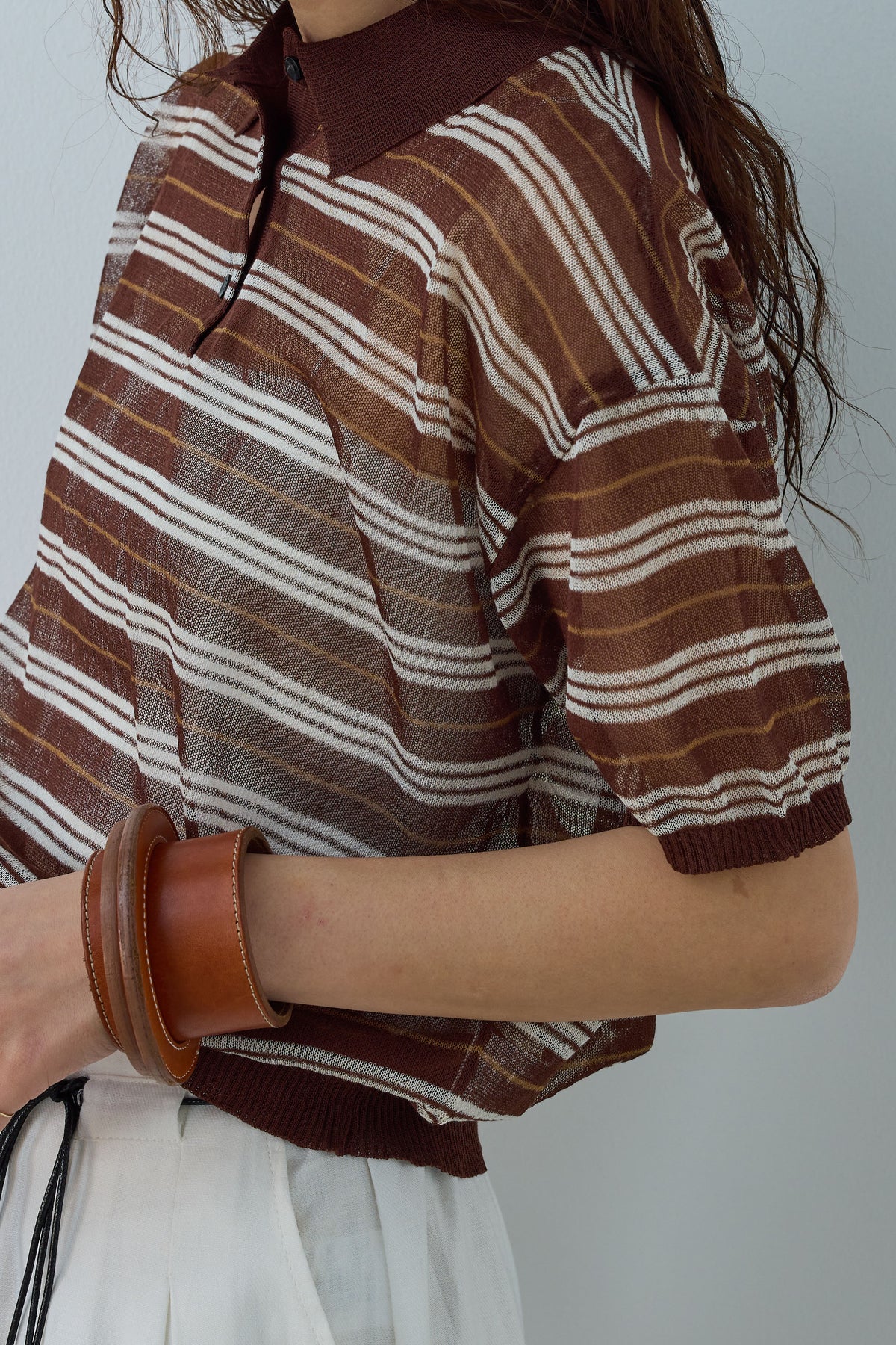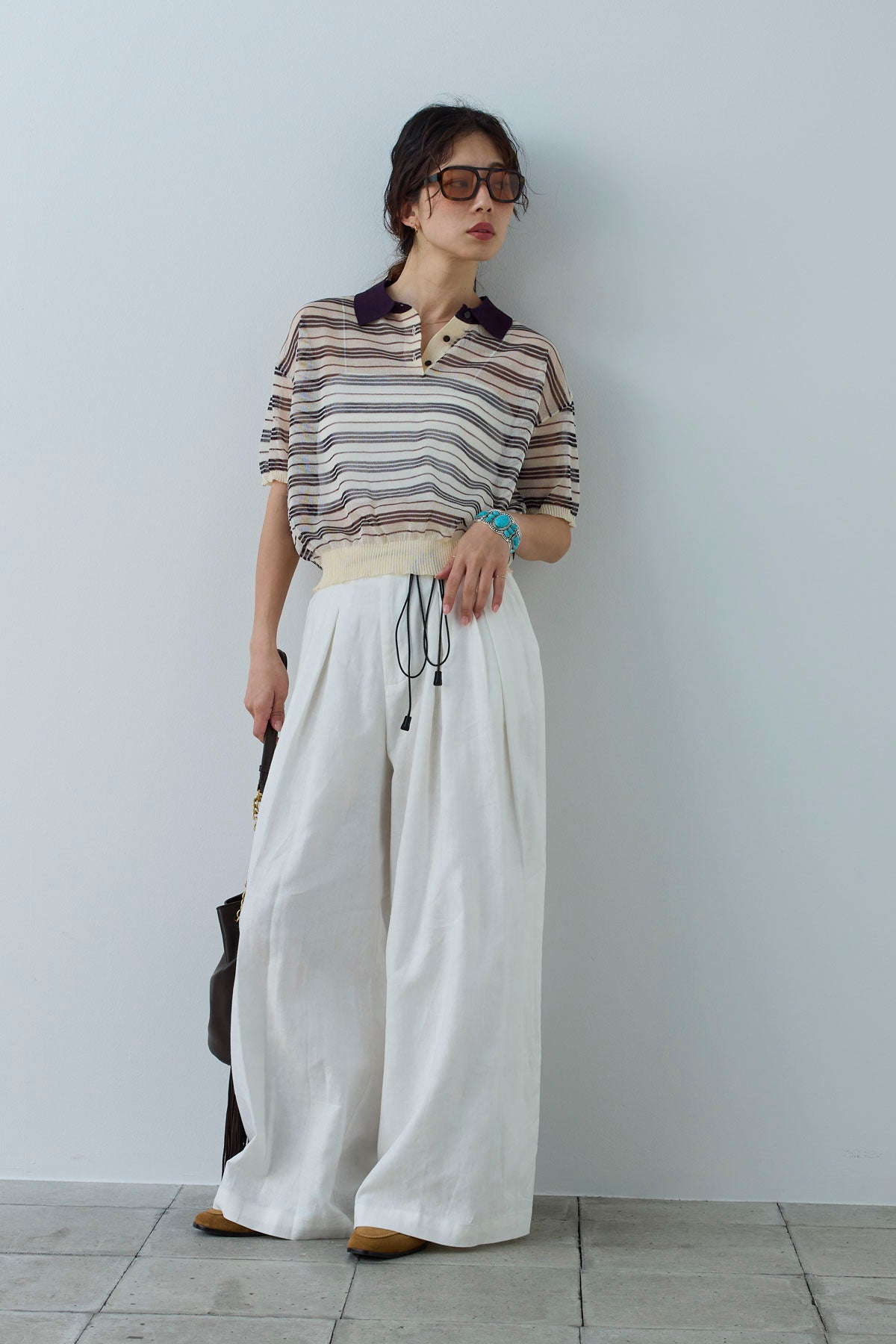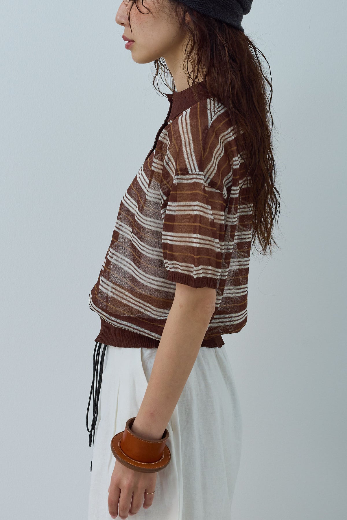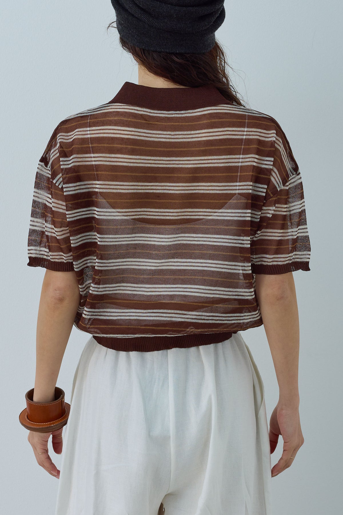 透け感のある生地で、ボーダーデザインが特徴的なポロシャツスタイルのトップスです。カジュアルながらもシアー素材のため、軽やかで涼しげな印象を与えるアイテムです。