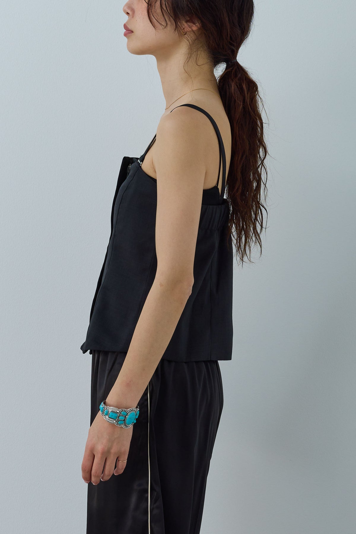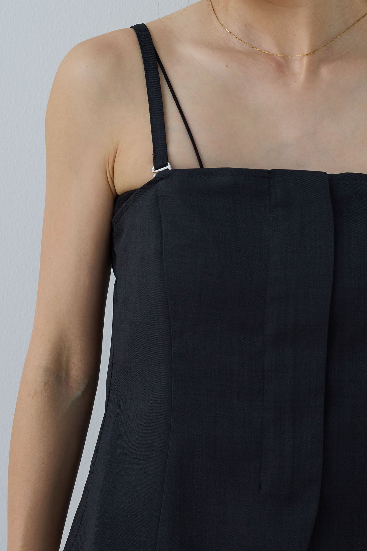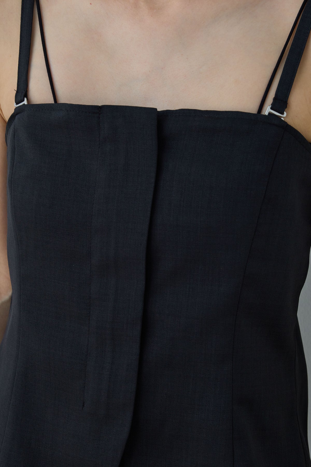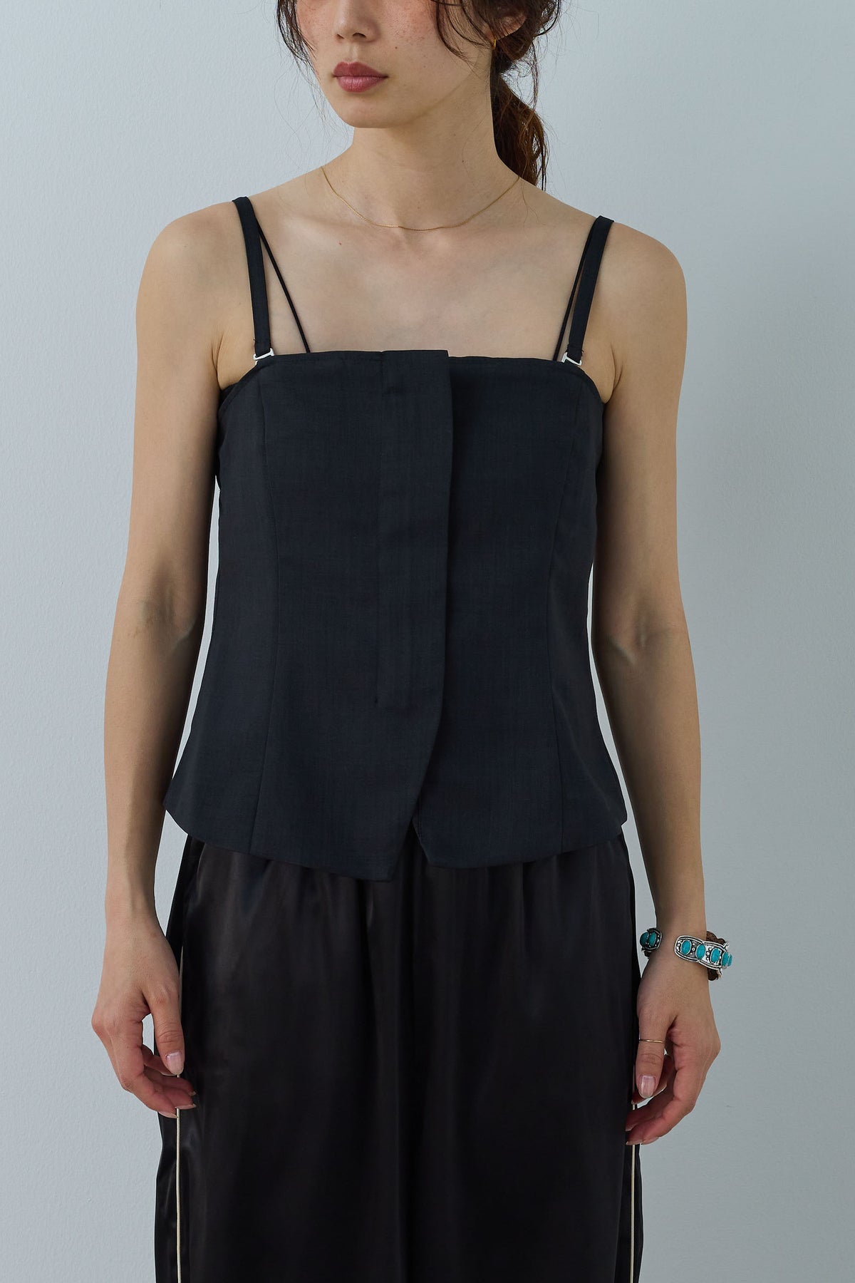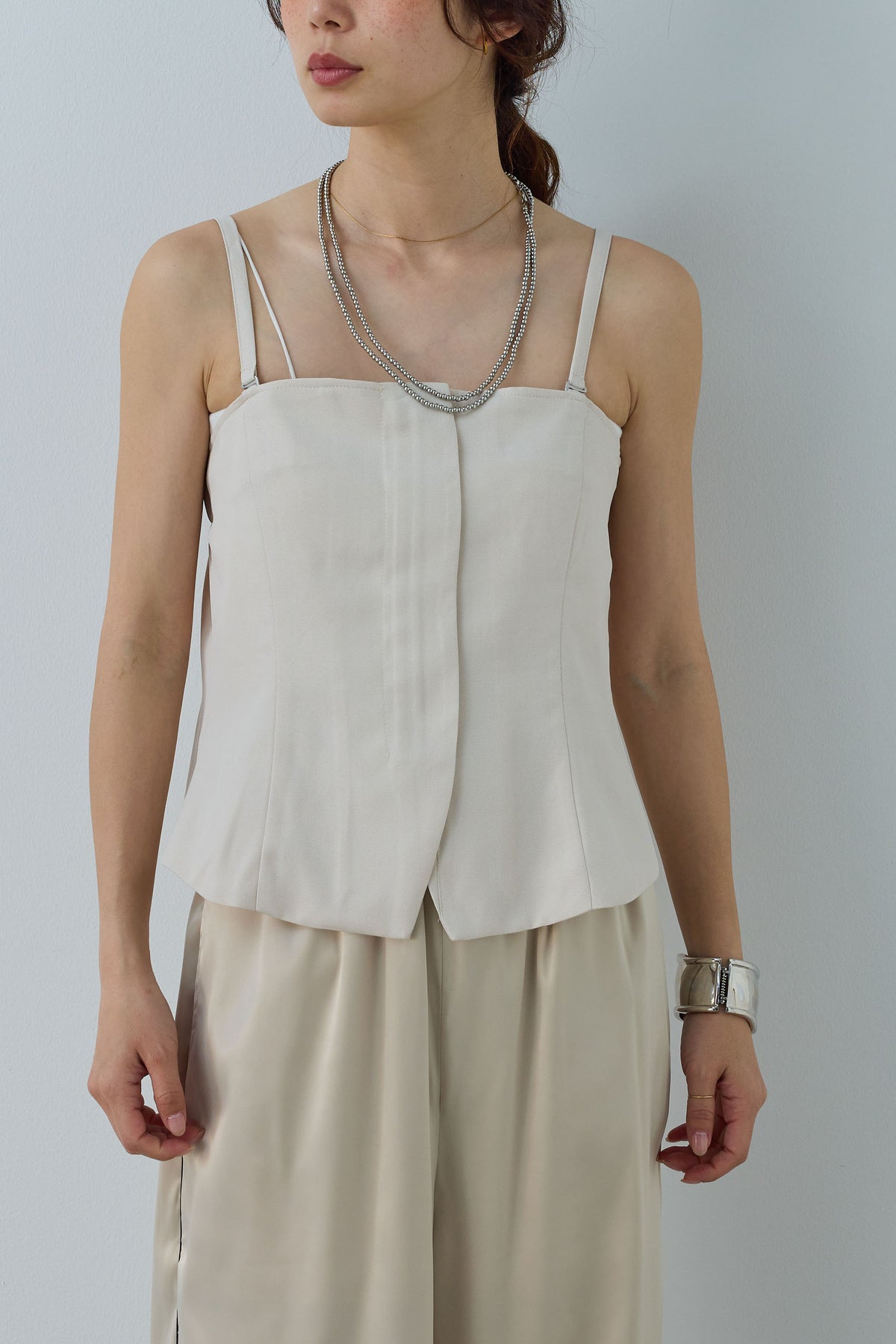 リネン風の素材で作られたシンプルで洗練されたデザインのビスチェです。ストラップ付きで、フロント部分にシンプルなディテールが施されており、カジュアルにもエレガントにも合わせやすいアイテムです。