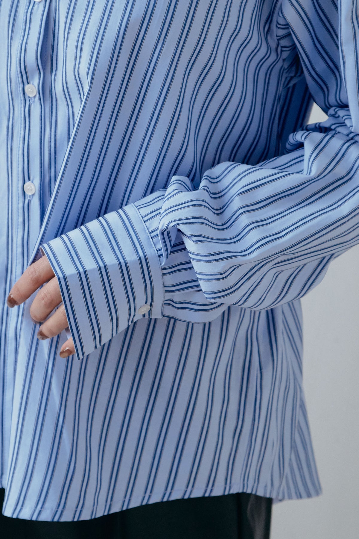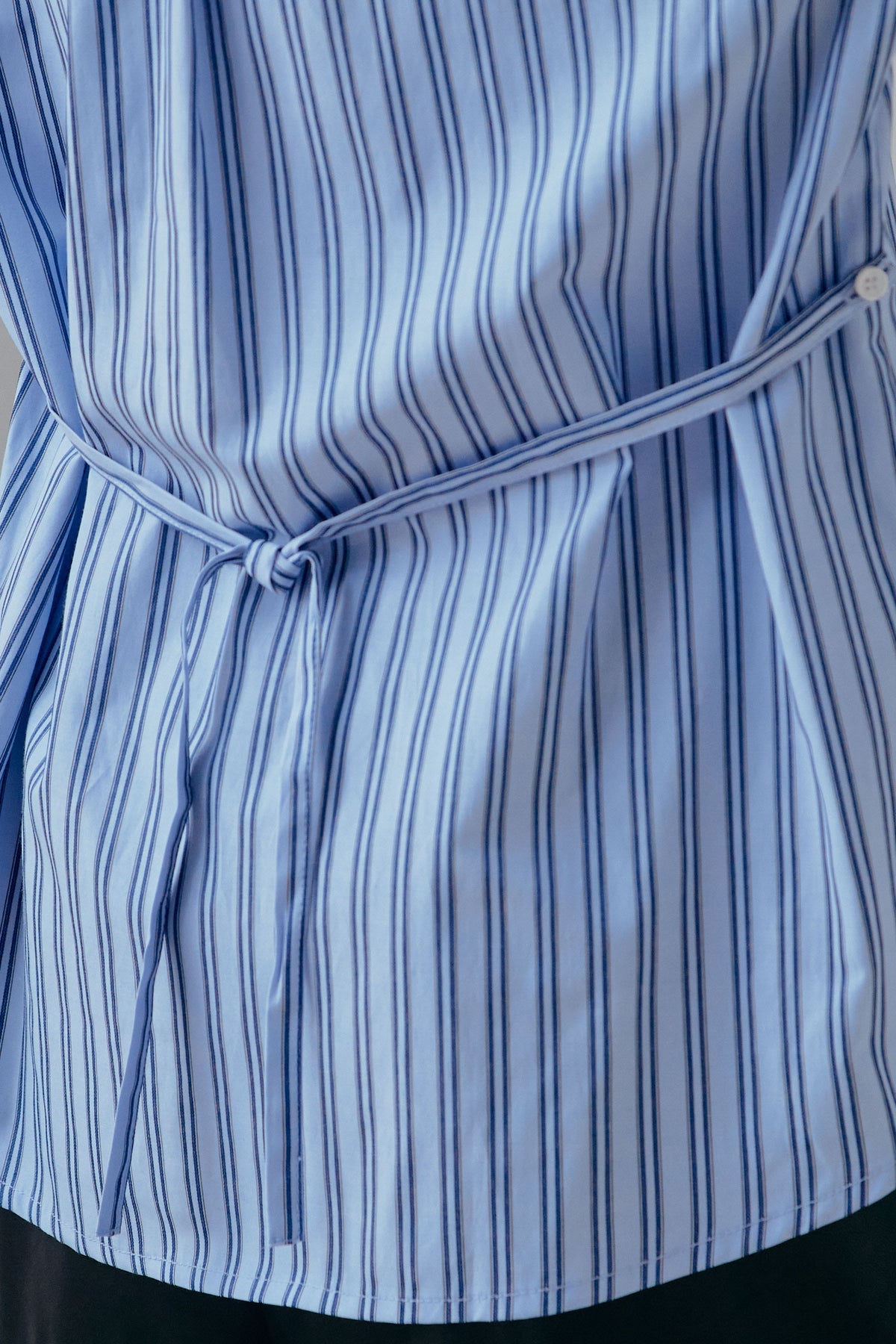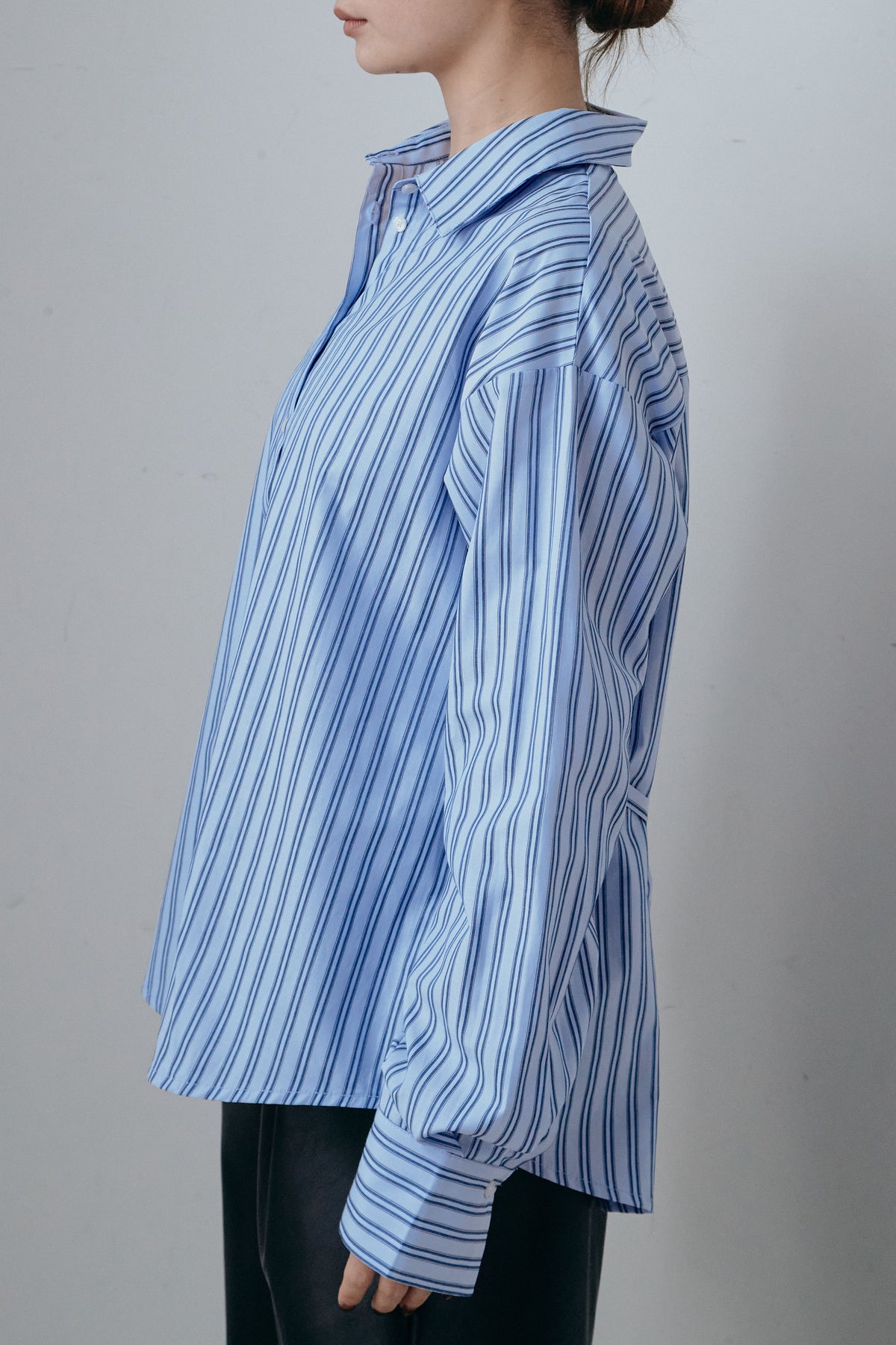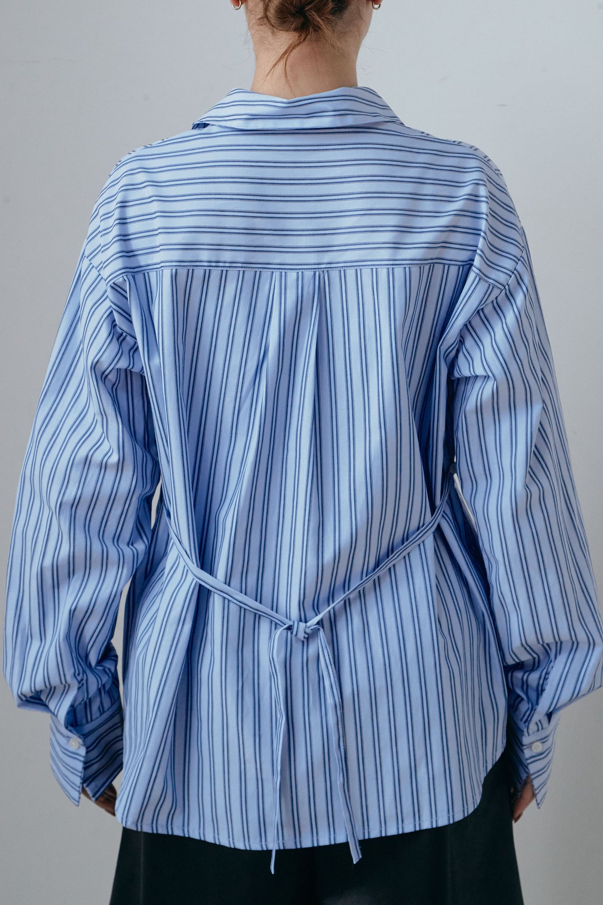 ウエストシェイプを楽しめる2WAY仕様のストライプシャツ。そのまま着れば程よくゆとりのあるシルエットに、内側のディテールを活かせば自然なライン変化が生まれます。落ち着いたストライプ柄が全体をすっきりと見せ、一枚着はもちろん羽織りとしても活躍。袖のボリューム感がさりげないアクセントになり、日常のスタイリングに取り入れやすい一着です。