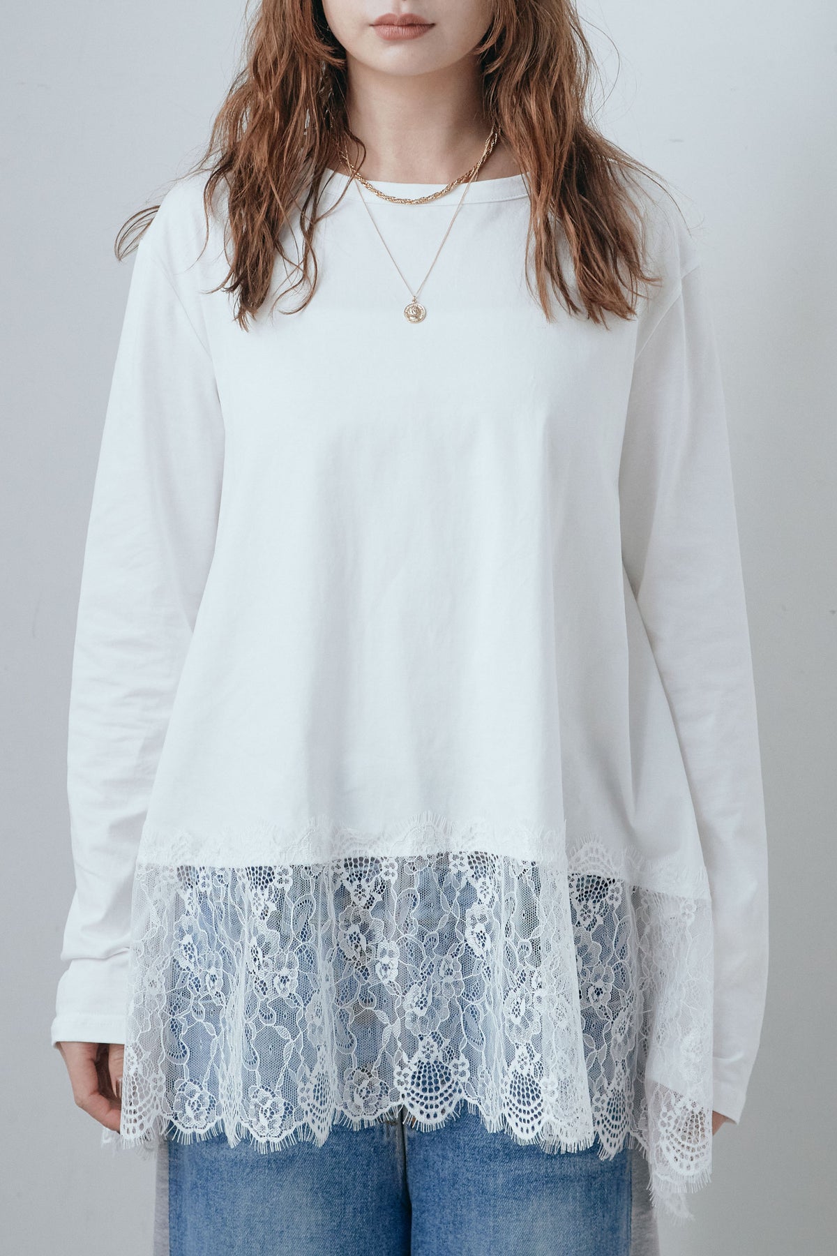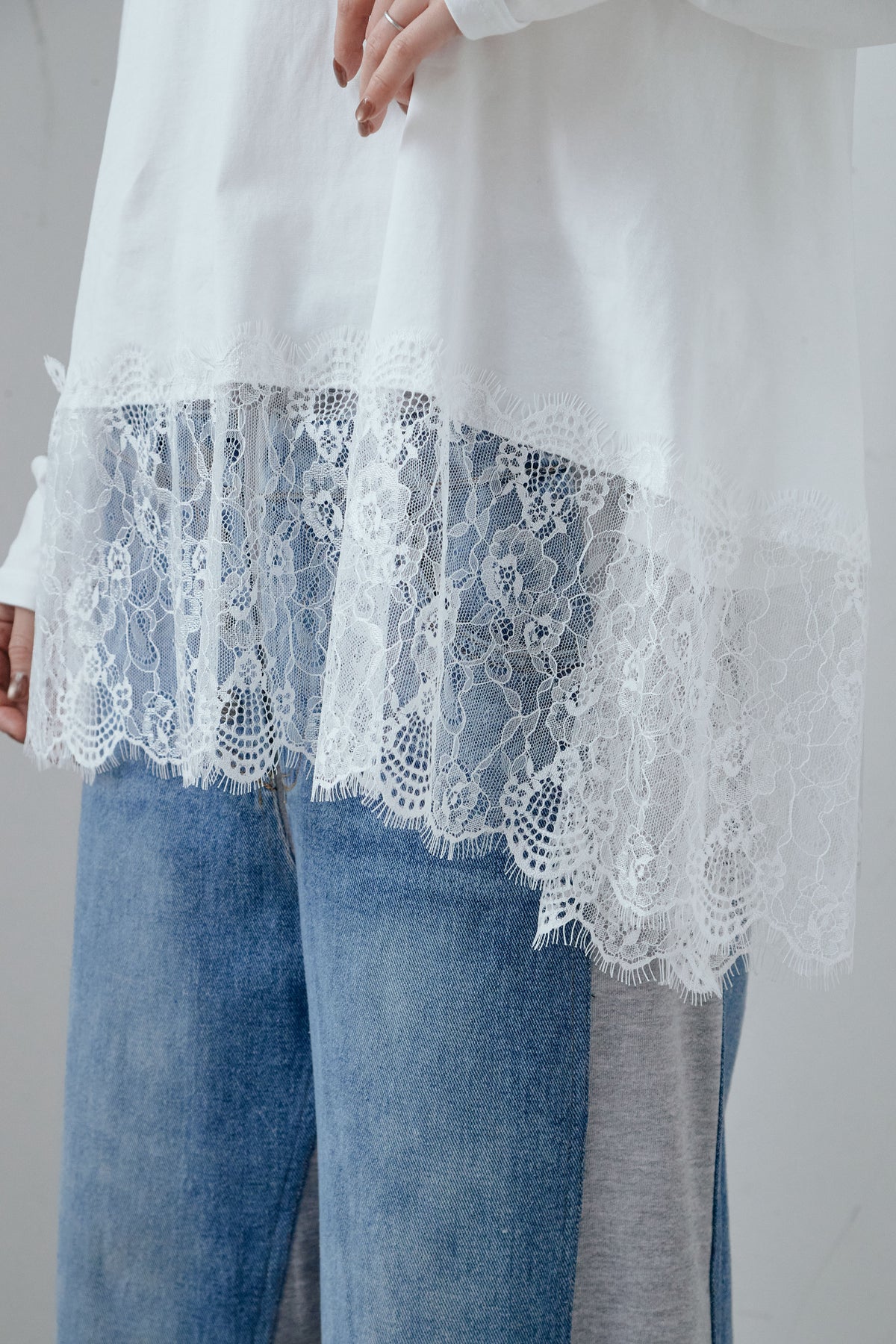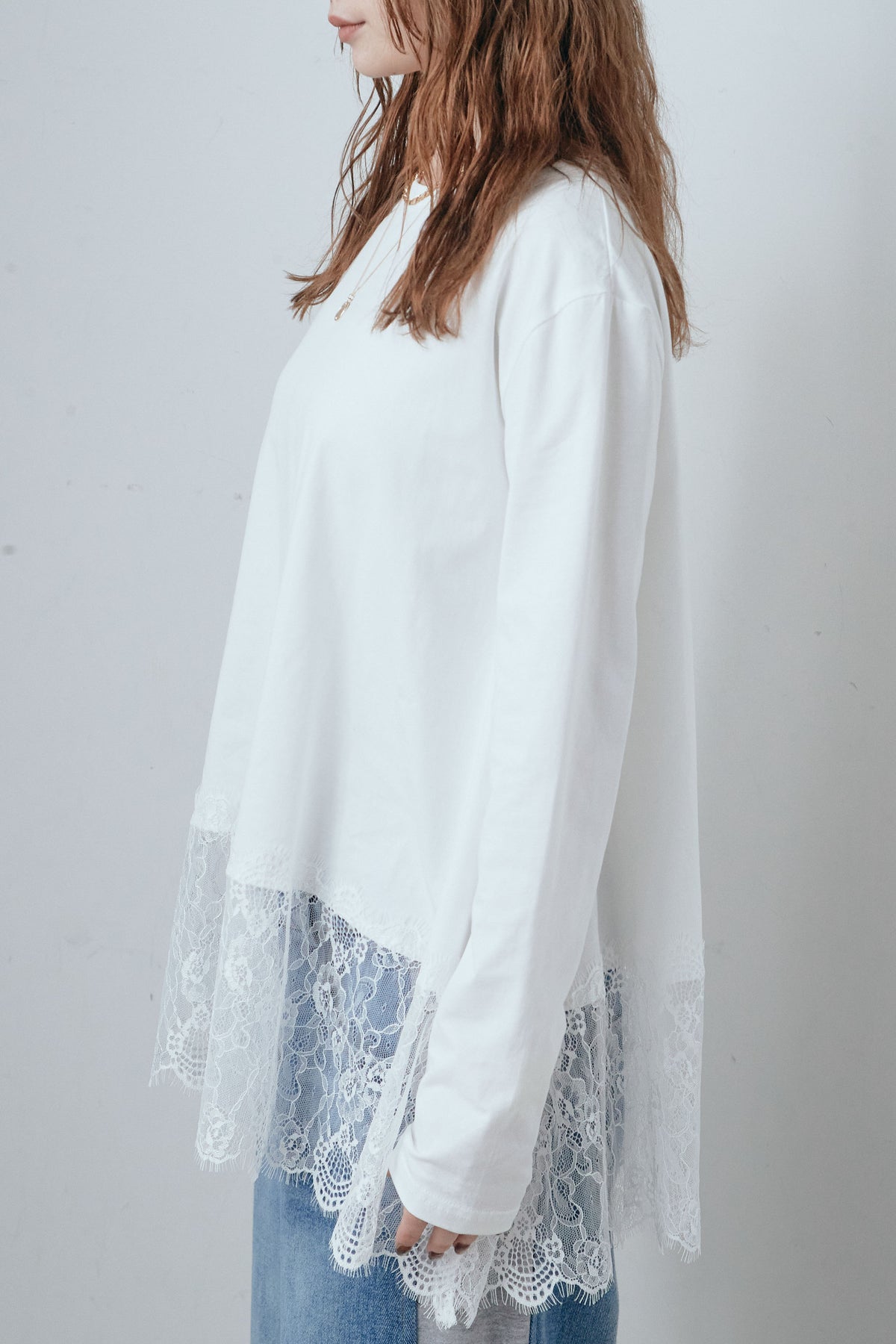 裾にレースをあしらったコンビデザインのカットソー。シンプルな上身頃に繊細なレースを重ねることで、軽やかな動きと奥行きをプラスします。程よくゆとりのあるシルエットで、一枚でも重ね着でも使いやすい仕上がり。パンツやスカートを選ばず合わせやすく、日常のスタイリングにさりげない変化を加えてくれる一着です。