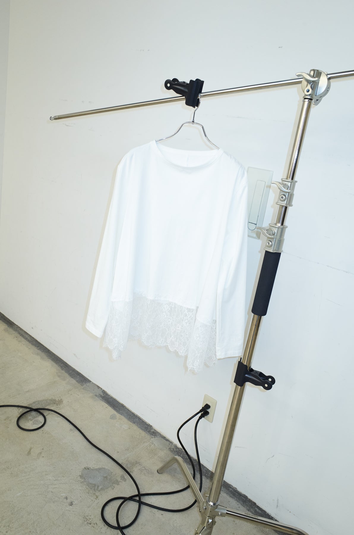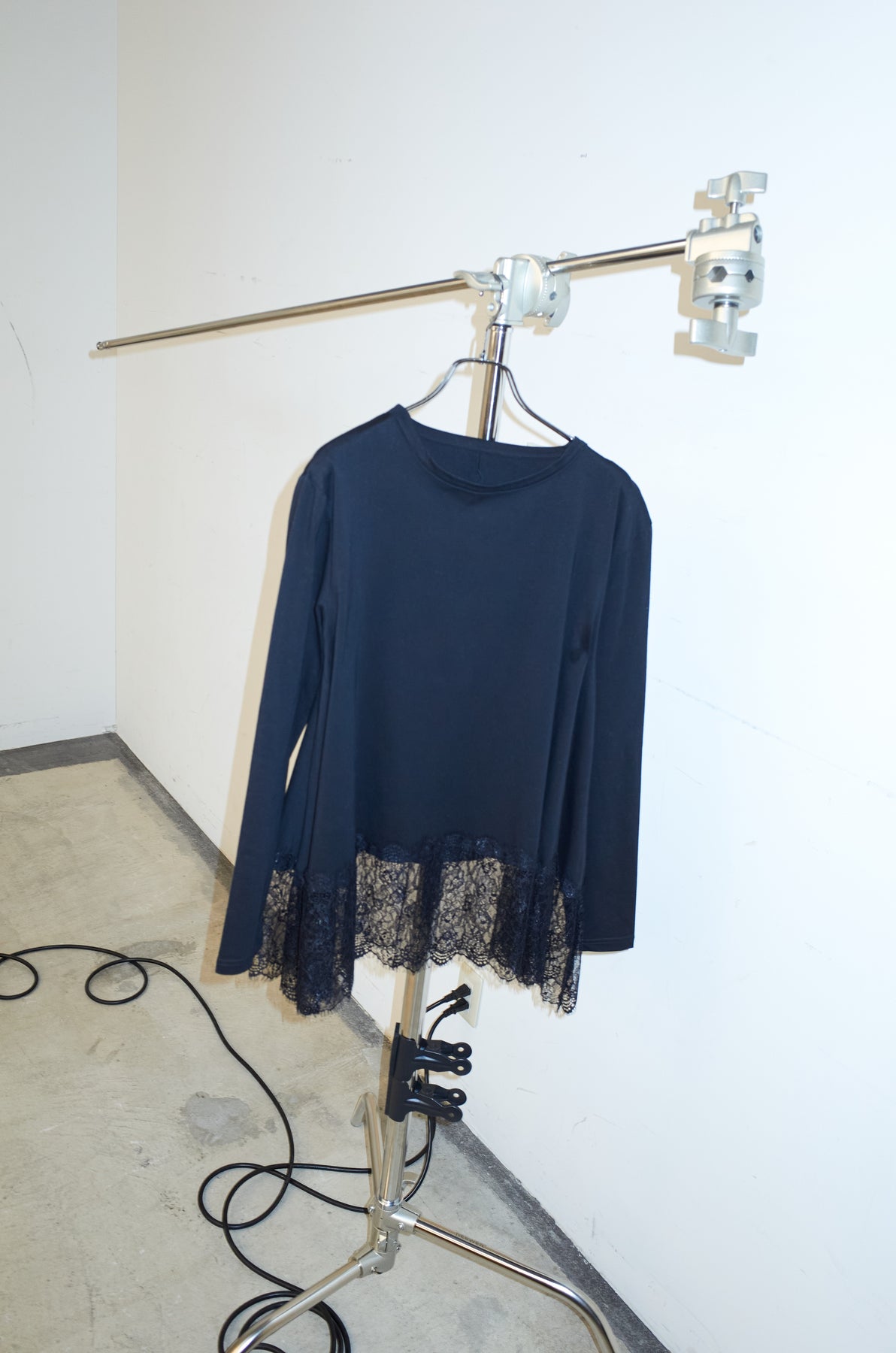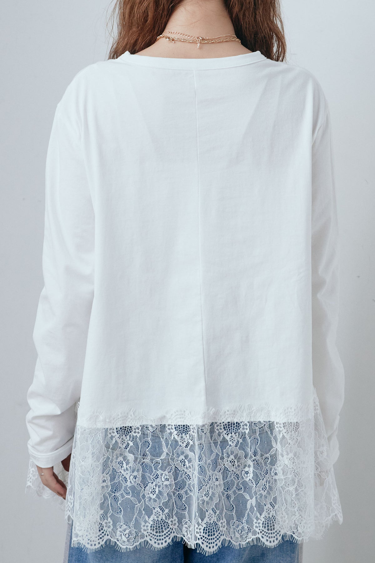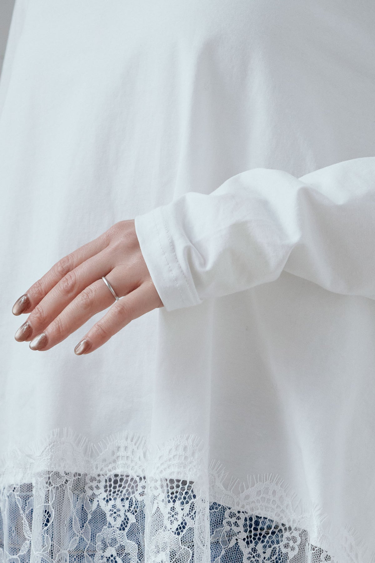 裾にレースをあしらったコンビデザインのカットソー。シンプルな上身頃に繊細なレースを重ねることで、軽やかな動きと奥行きをプラスします。程よくゆとりのあるシルエットで、一枚でも重ね着でも使いやすい仕上がり。パンツやスカートを選ばず合わせやすく、日常のスタイリングにさりげない変化を加えてくれる一着です。