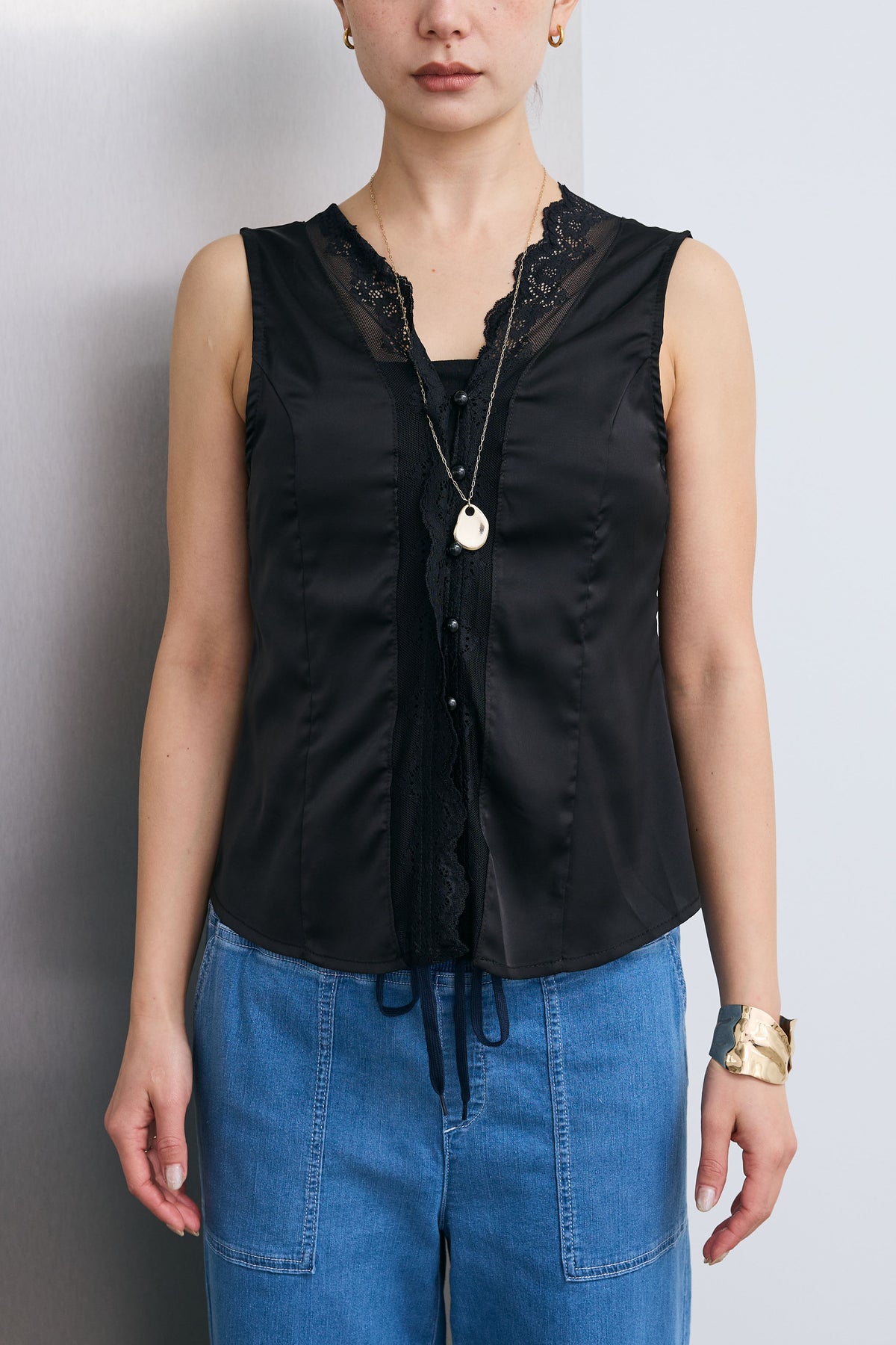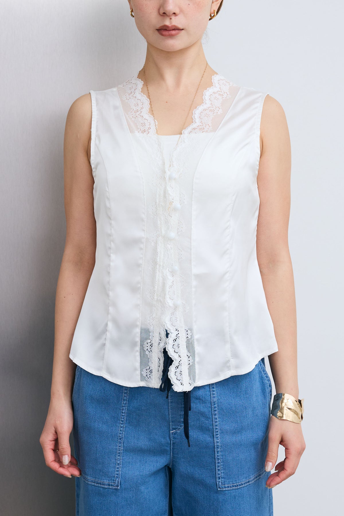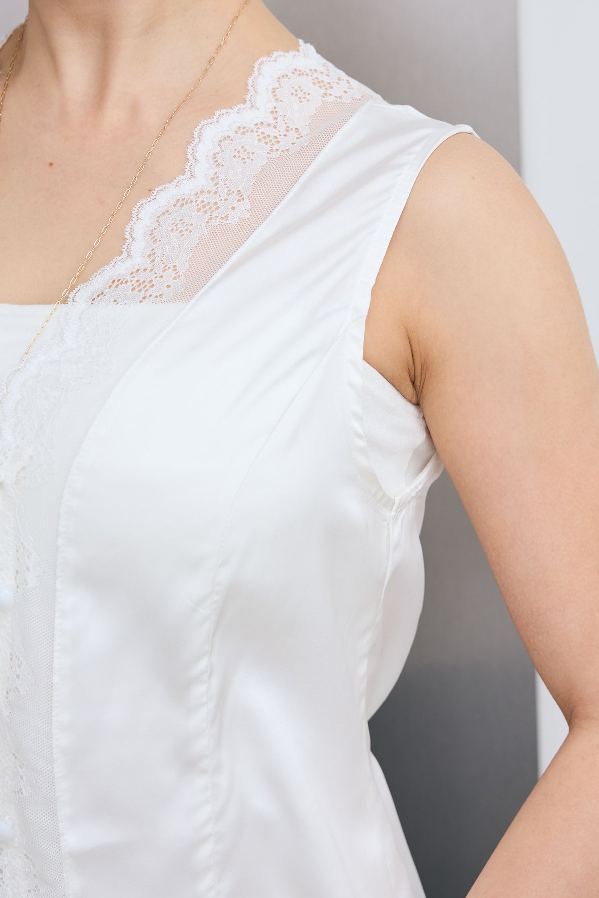 繊細なレースをあしらったトリムデザインが目を惹くノースリーブブラウス。程よい光沢のサテン素材がやわらかな印象を引き立て、軽やかな抜け感をプラス。すっきりとしたシルエットでレイヤードにも取り入れやすく、スタイリングにさりげない華やかさを添える一着です。