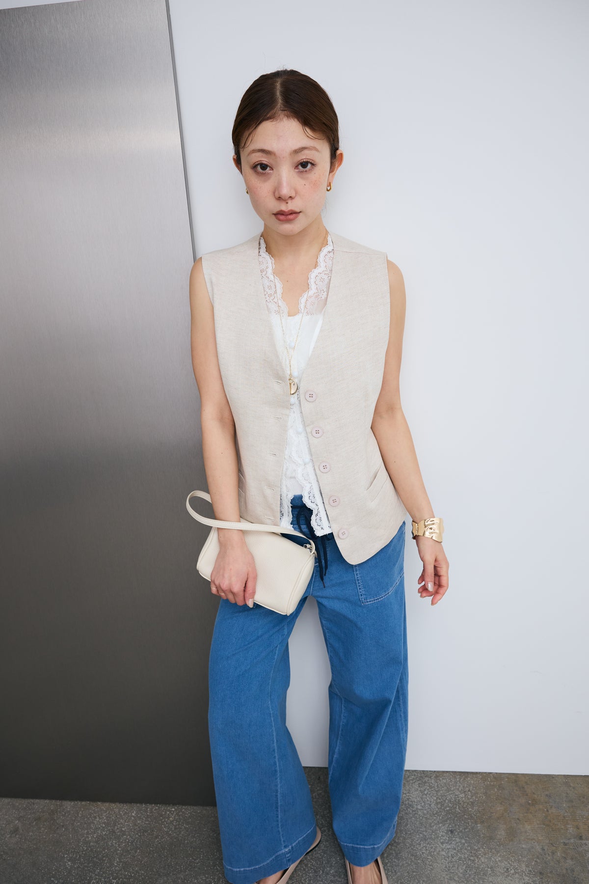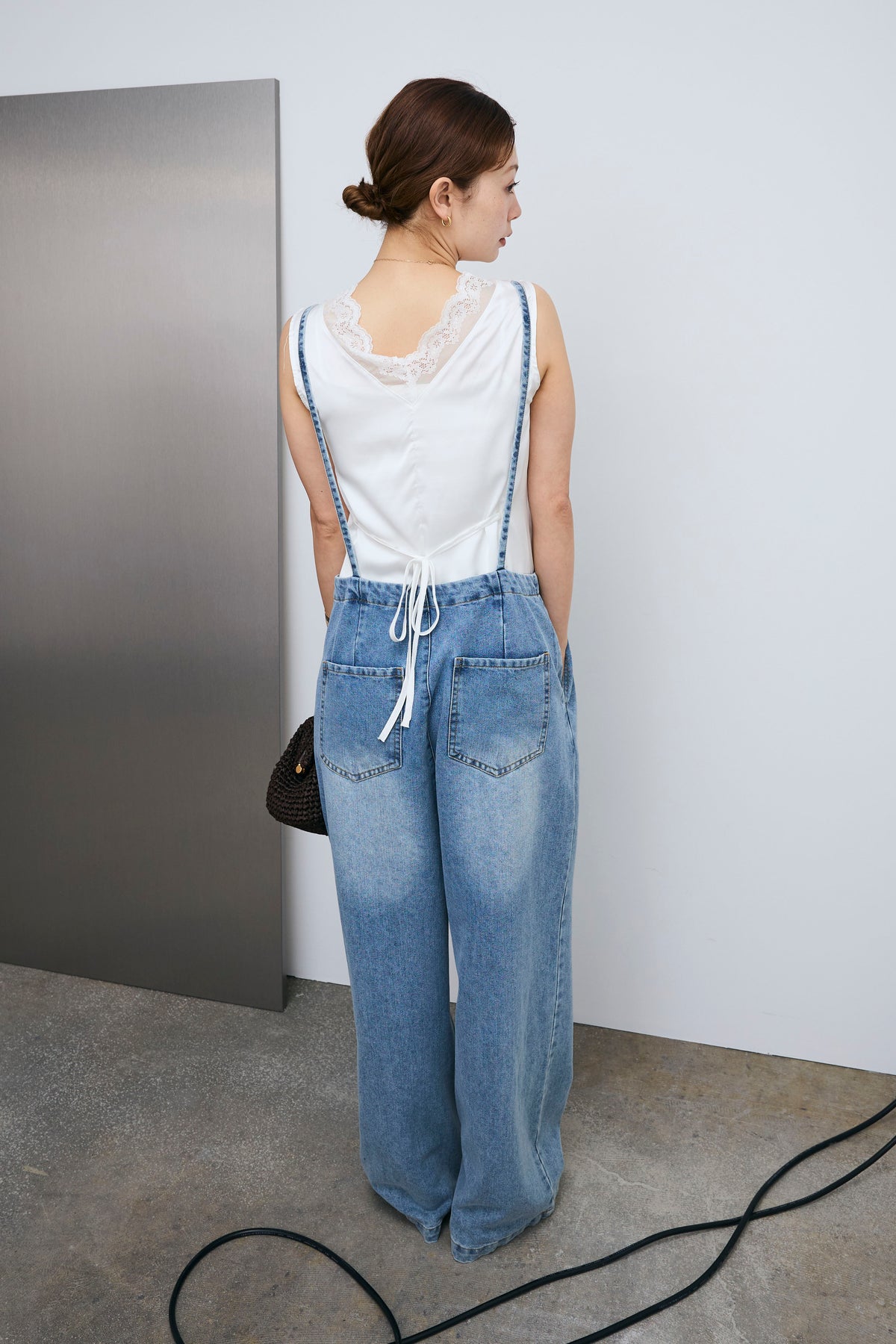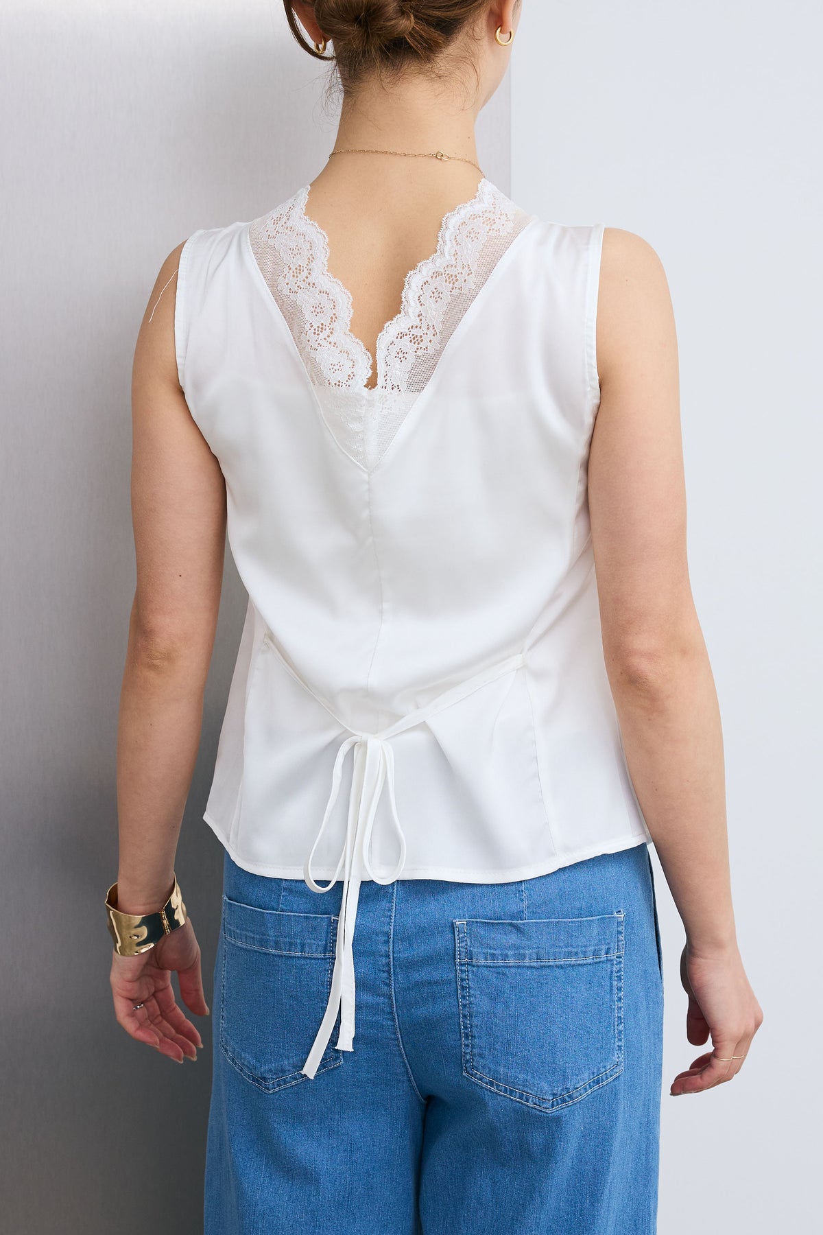 繊細なレースをあしらったトリムデザインが目を惹くノースリーブブラウス。程よい光沢のサテン素材がやわらかな印象を引き立て、軽やかな抜け感をプラス。すっきりとしたシルエットでレイヤードにも取り入れやすく、スタイリングにさりげない華やかさを添える一着です。