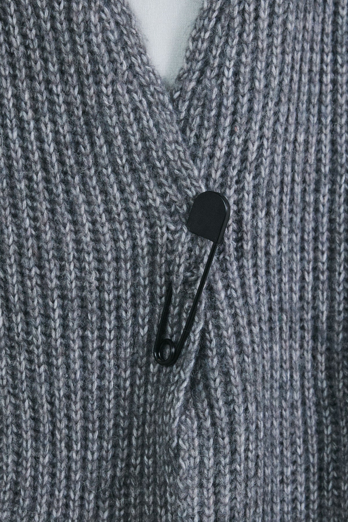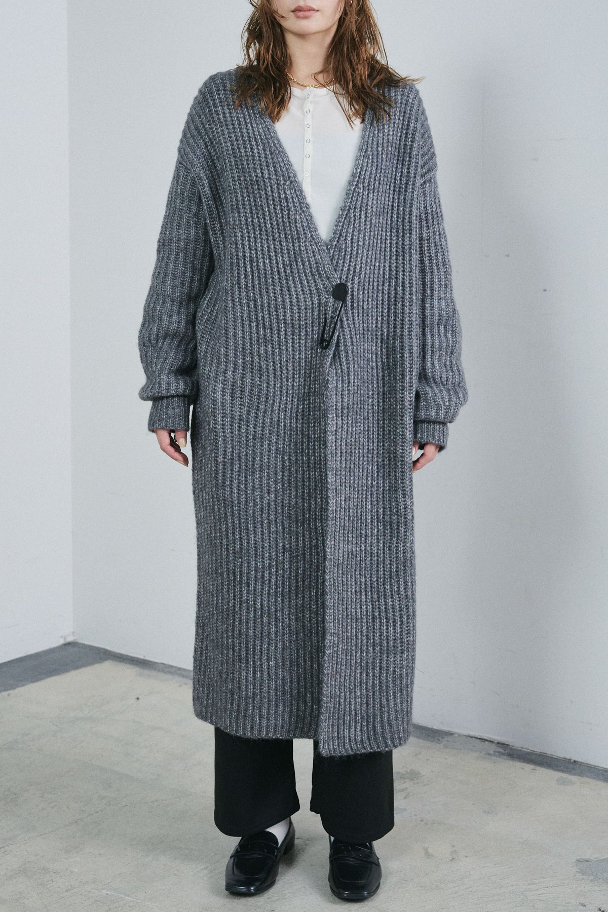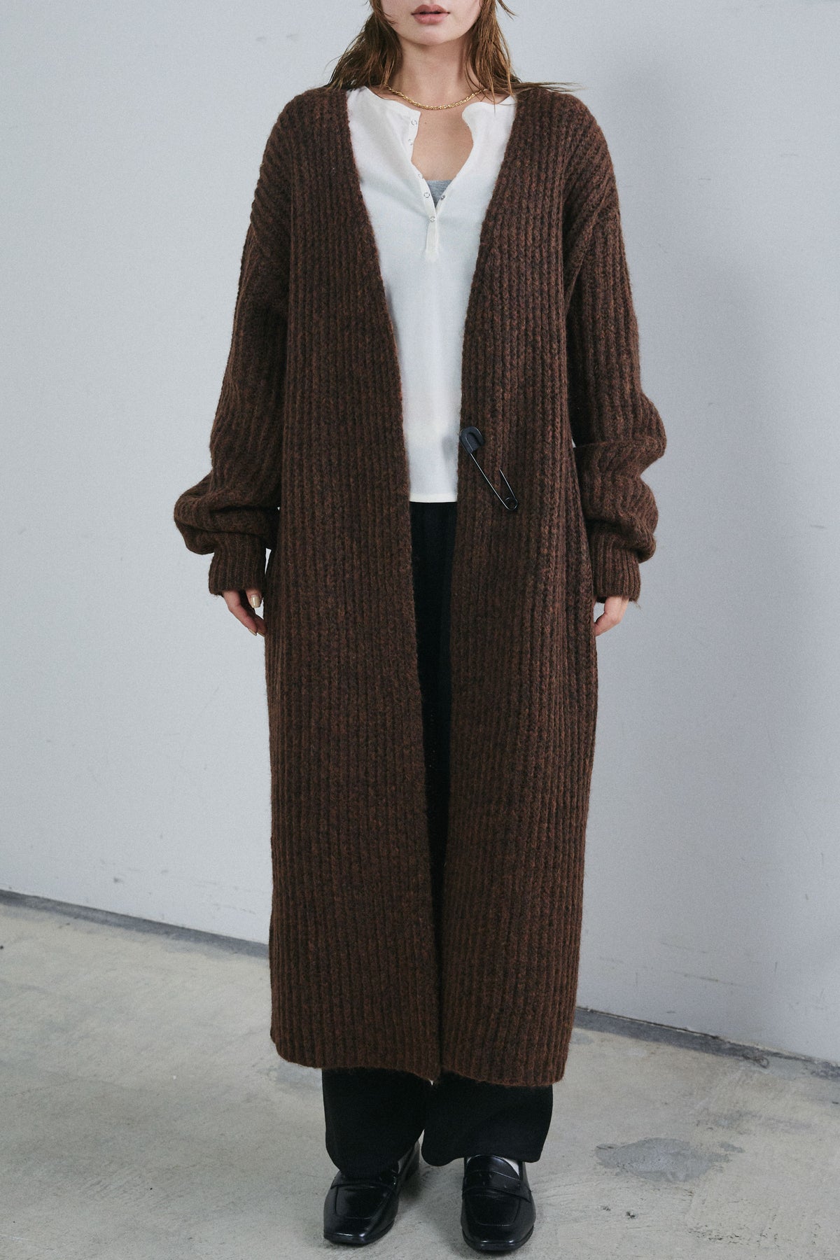 ざっくりとした編み地が魅力のロングカーディガン。キルトピン付きで、軽く留めるだけでシルエットに変化をつけられます。ゆったりとした落ち感のあるシルエットで、羽織るだけでこなれた印象に。ニット素材の柔らかな風合いが心地よく、季節の変わり目にも重宝するアイテムです。
