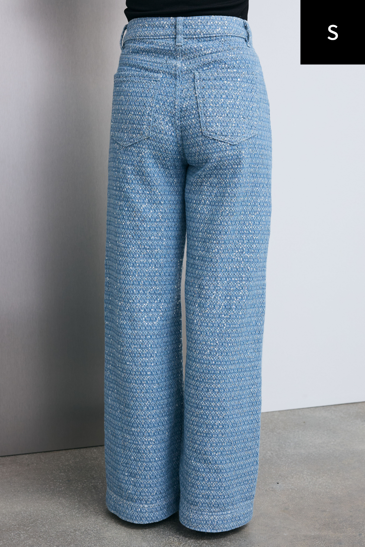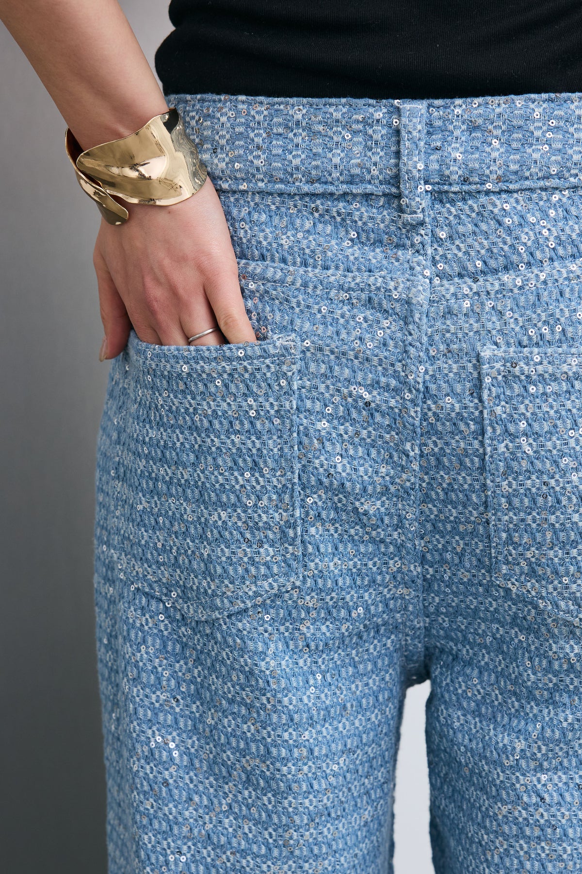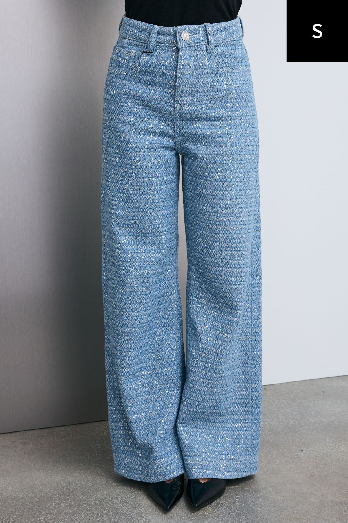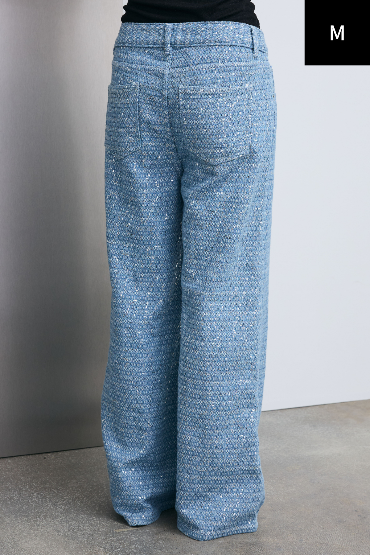 さりげなく輝くグリッターが印象的なデニムパンツ。程よいワイドシルエットが抜け感を生み、シンプルなトップスと合わせるだけでこなれたバランスに。デニムならではのカジュアルさに繊細なきらめきをプラスし、日常のスタイリングをさりげなく引き上げてくれる一着です。