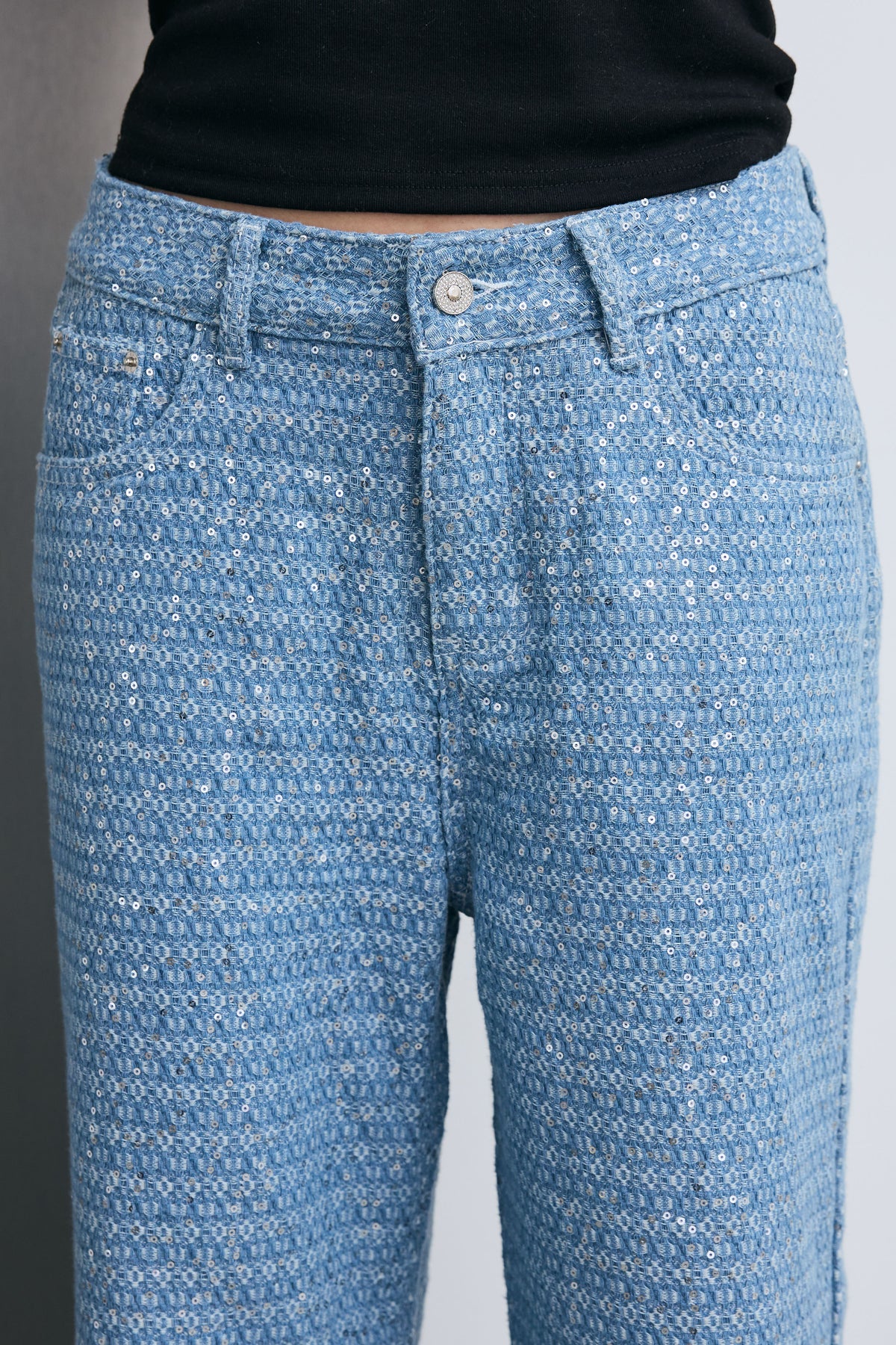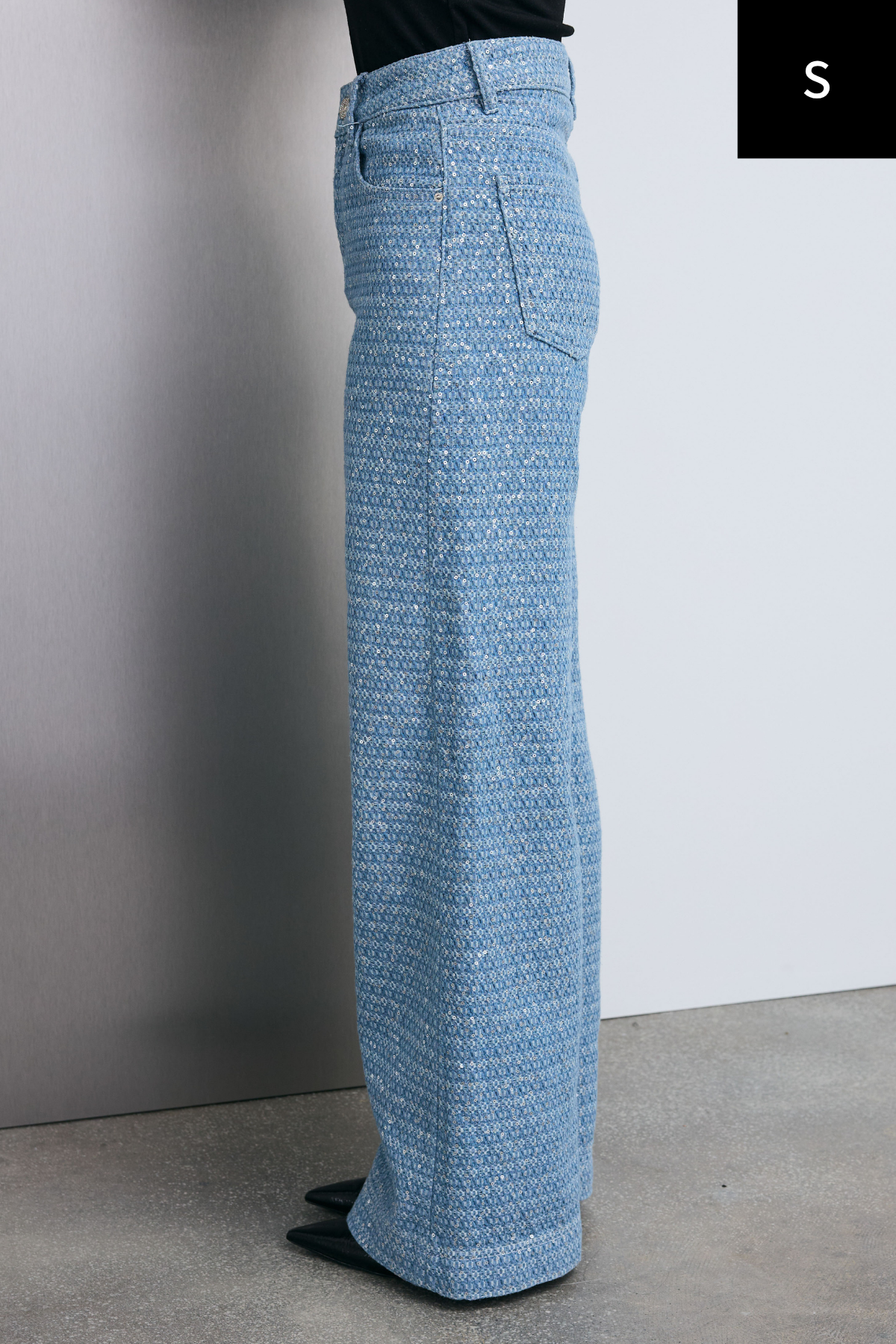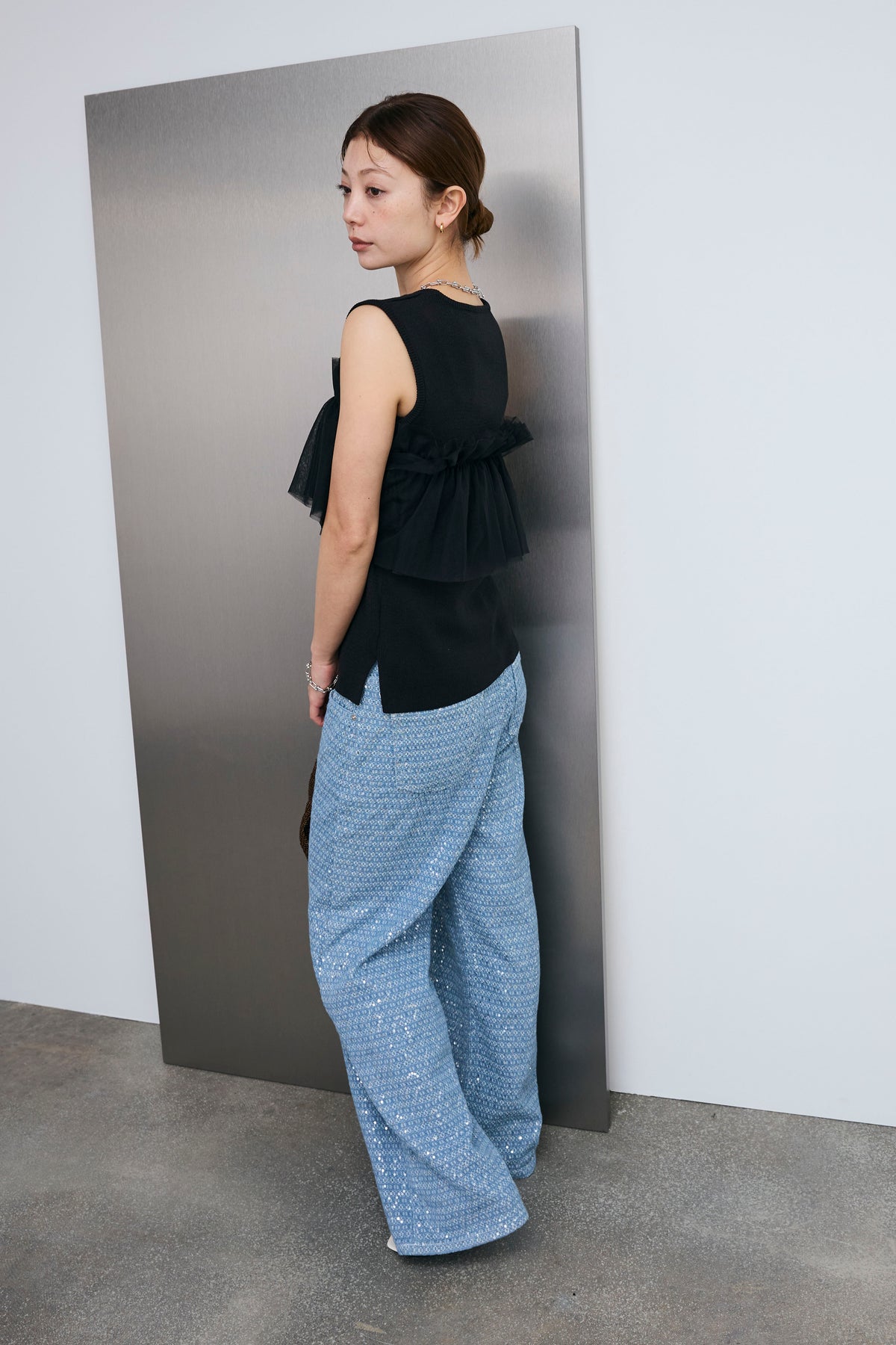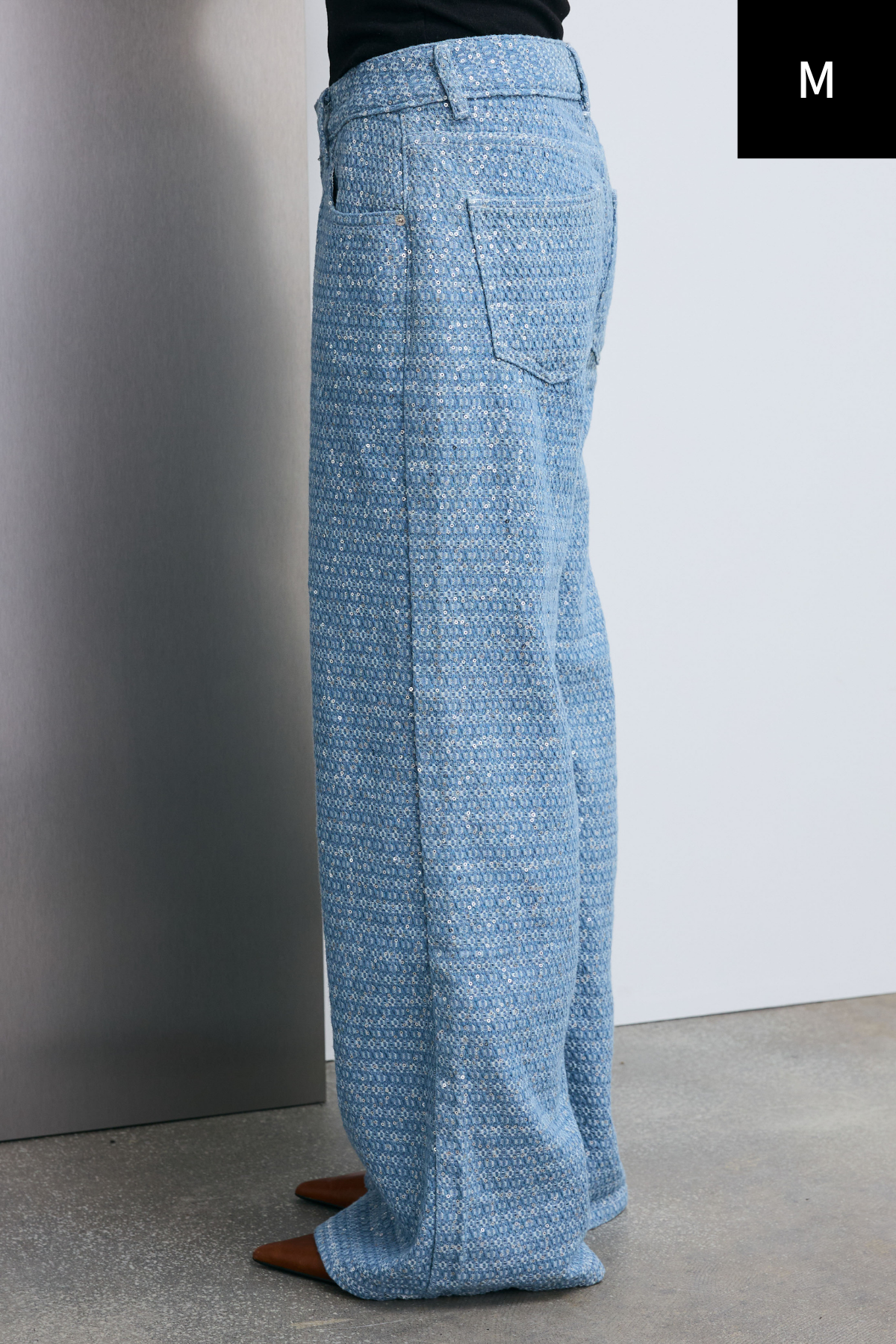 さりげなく輝くグリッターが印象的なデニムパンツ。程よいワイドシルエットが抜け感を生み、シンプルなトップスと合わせるだけでこなれたバランスに。デニムならではのカジュアルさに繊細なきらめきをプラスし、日常のスタイリングをさりげなく引き上げてくれる一着です。
