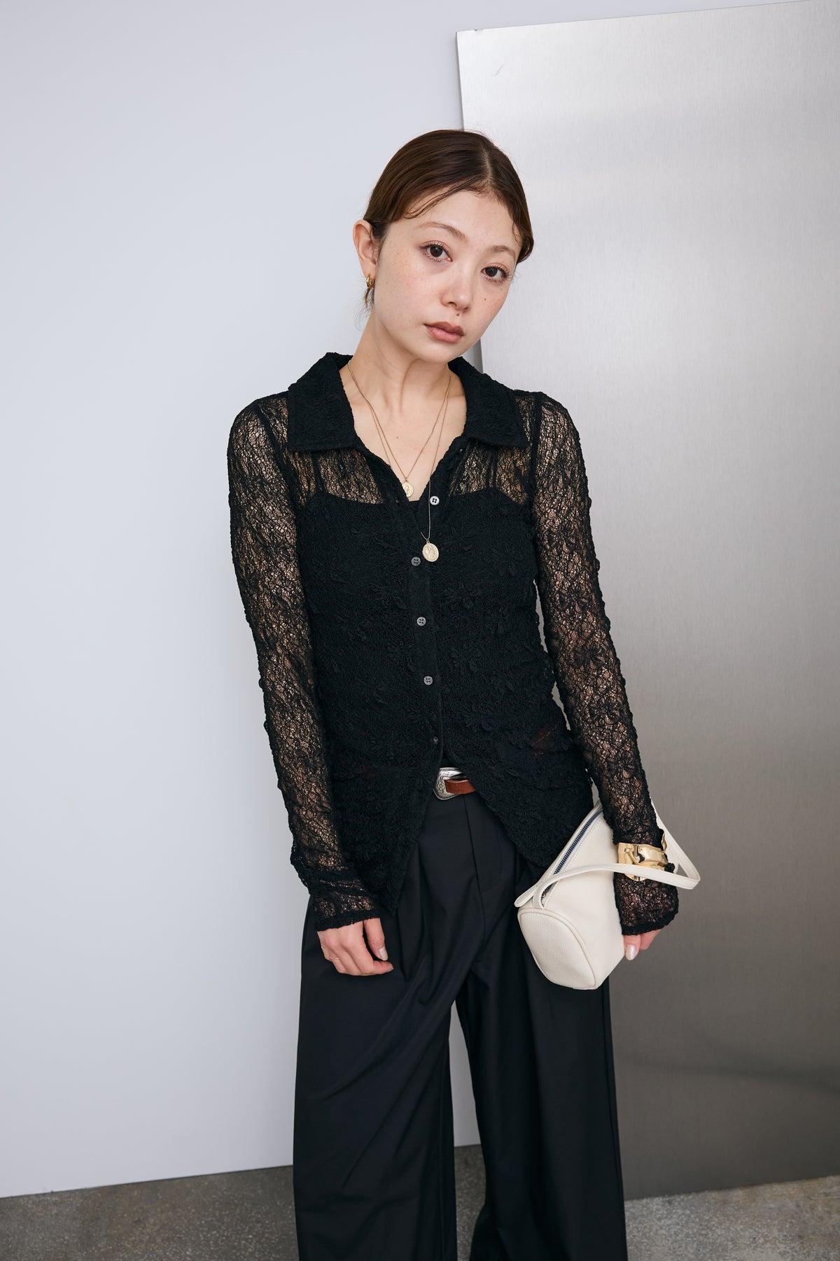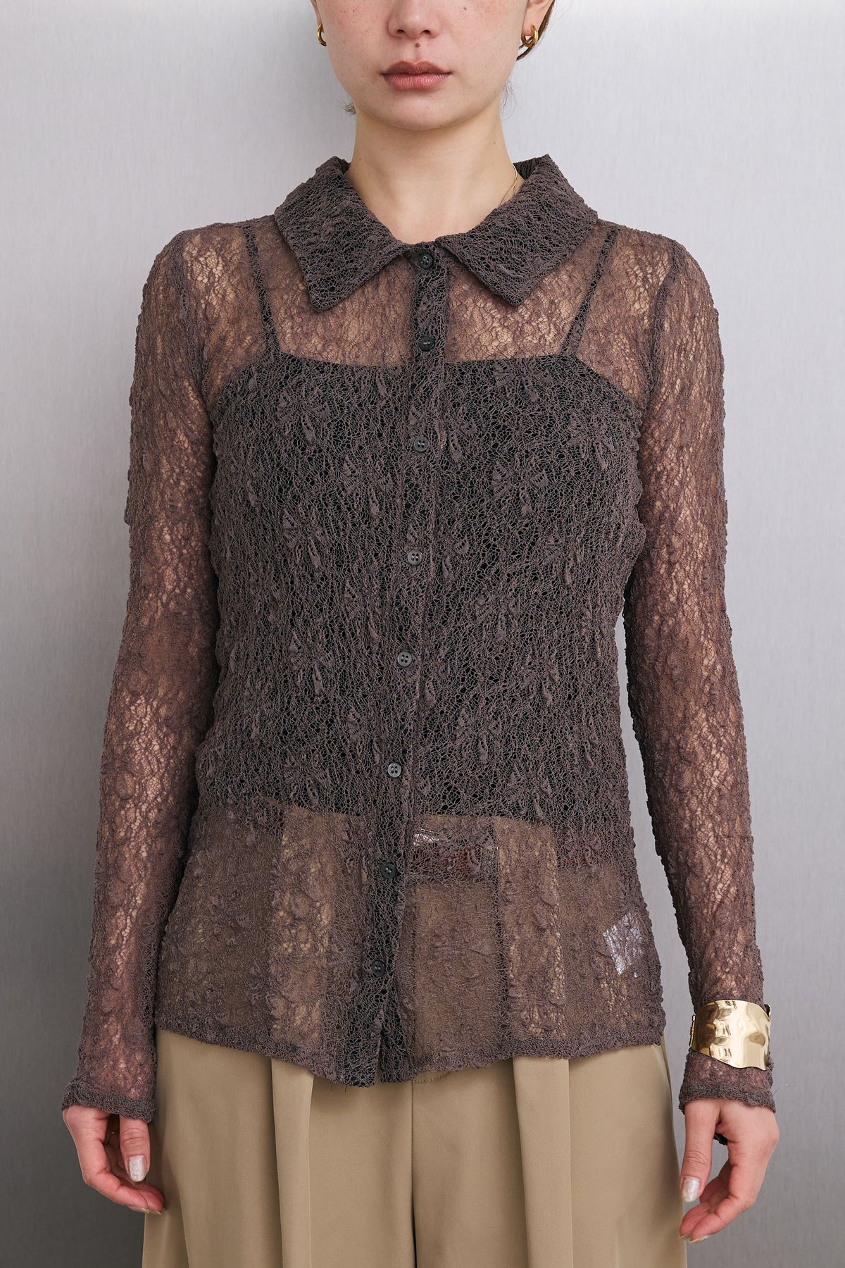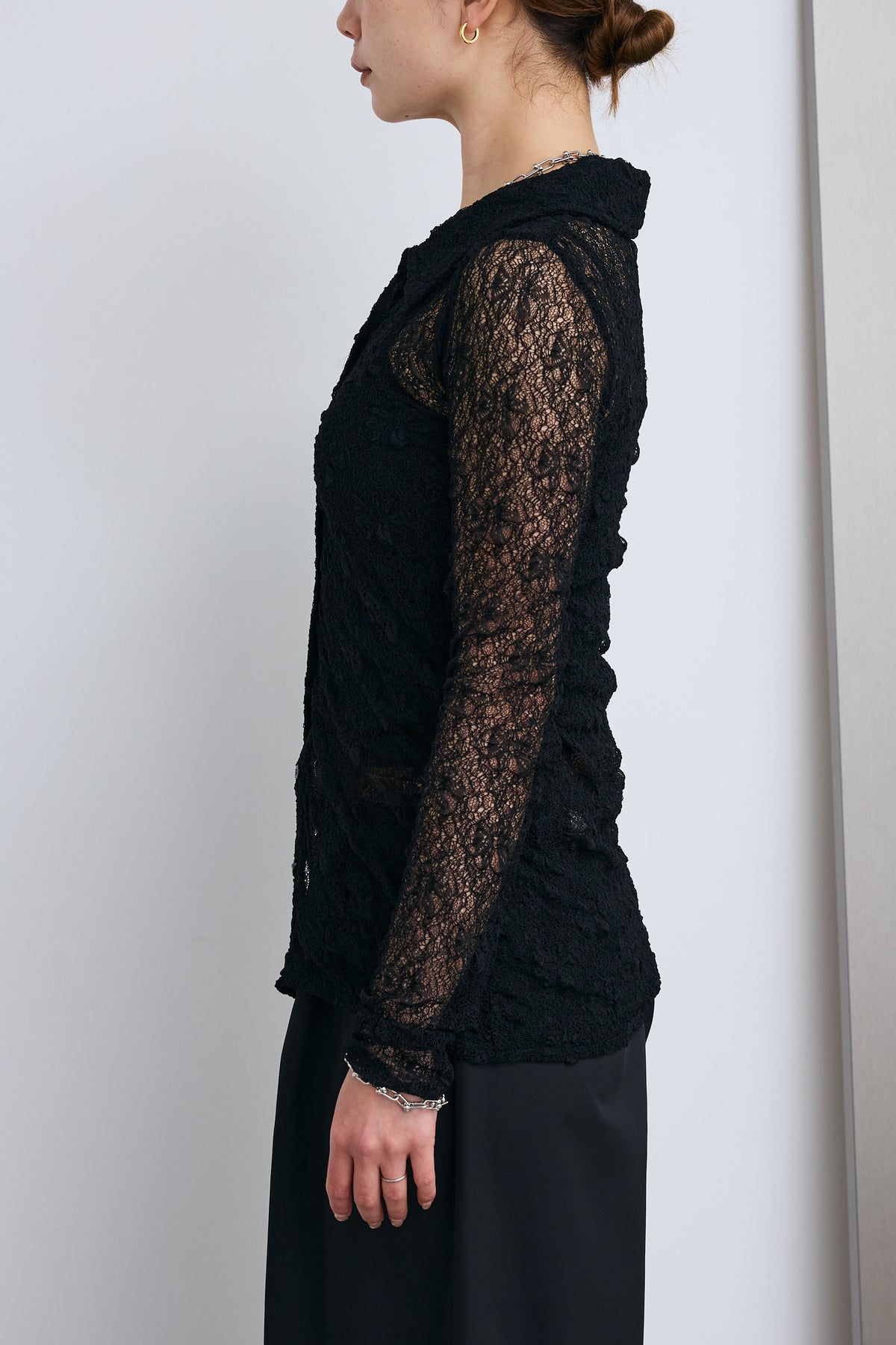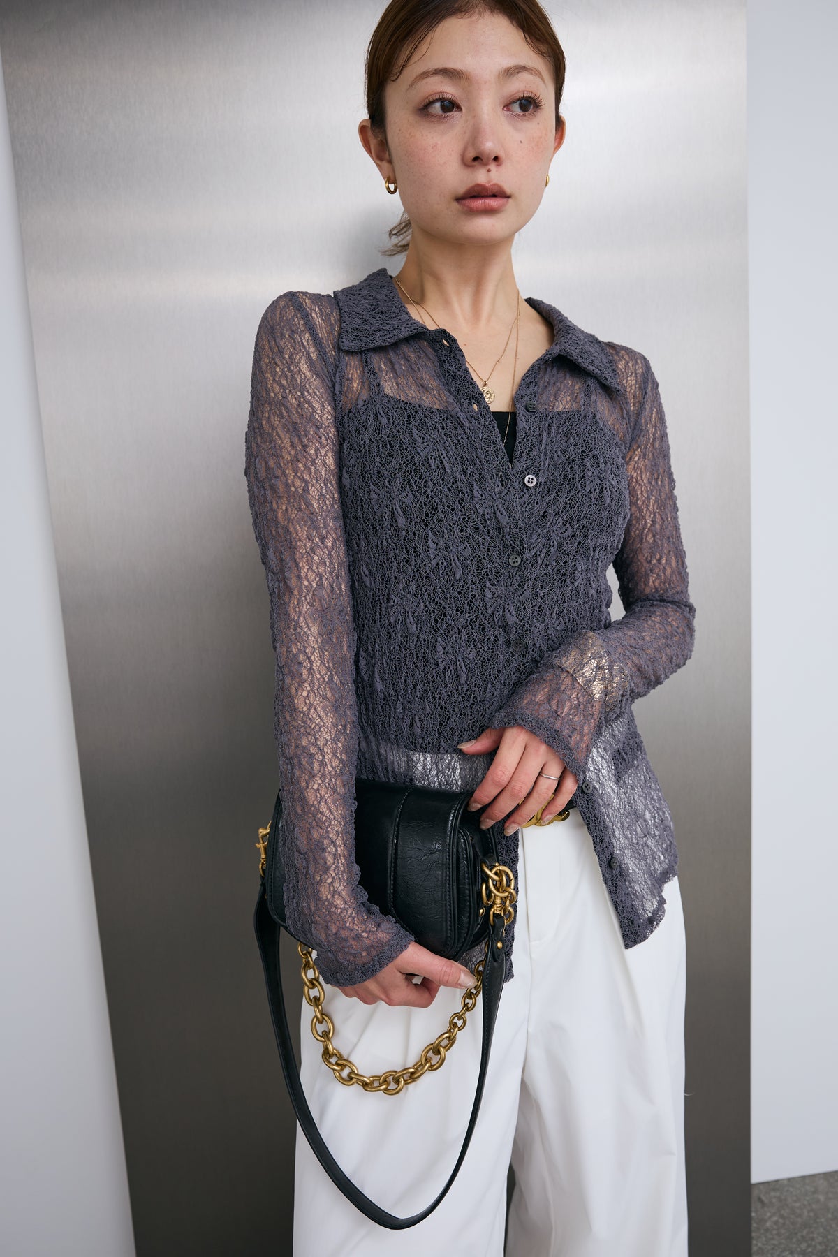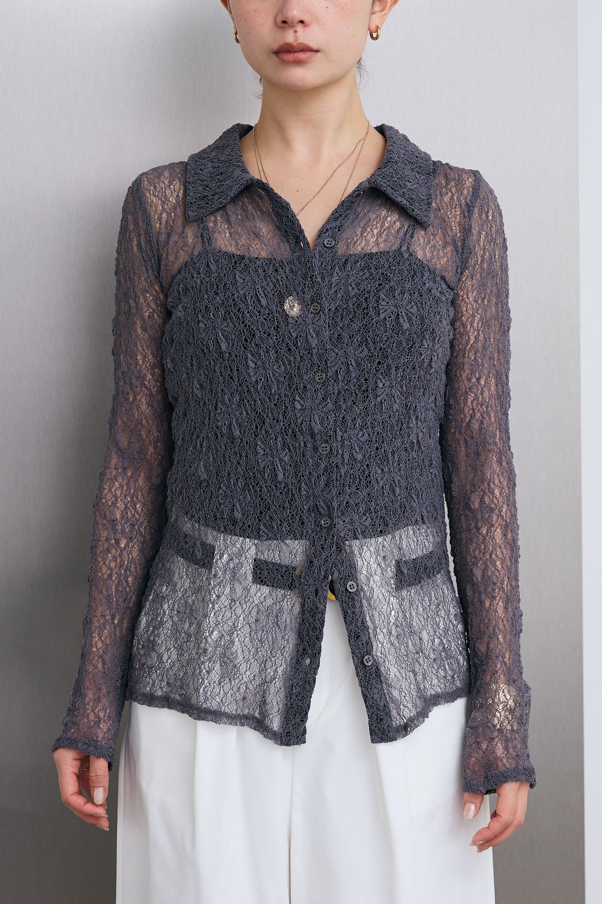繊細なレースが軽やかな印象を引き立てる襟付きカーディガン。程よい透け感が抜けを生み、インナーとのレイヤードを楽しめるデザインです。コンパクトなシルエットと襟付きのディテールで、さりげなくきちんと感もプラス。羽織としてはもちろん、トップス感覚でも取り入れやすく、スタイリングの幅を広げてくれる一枚です。