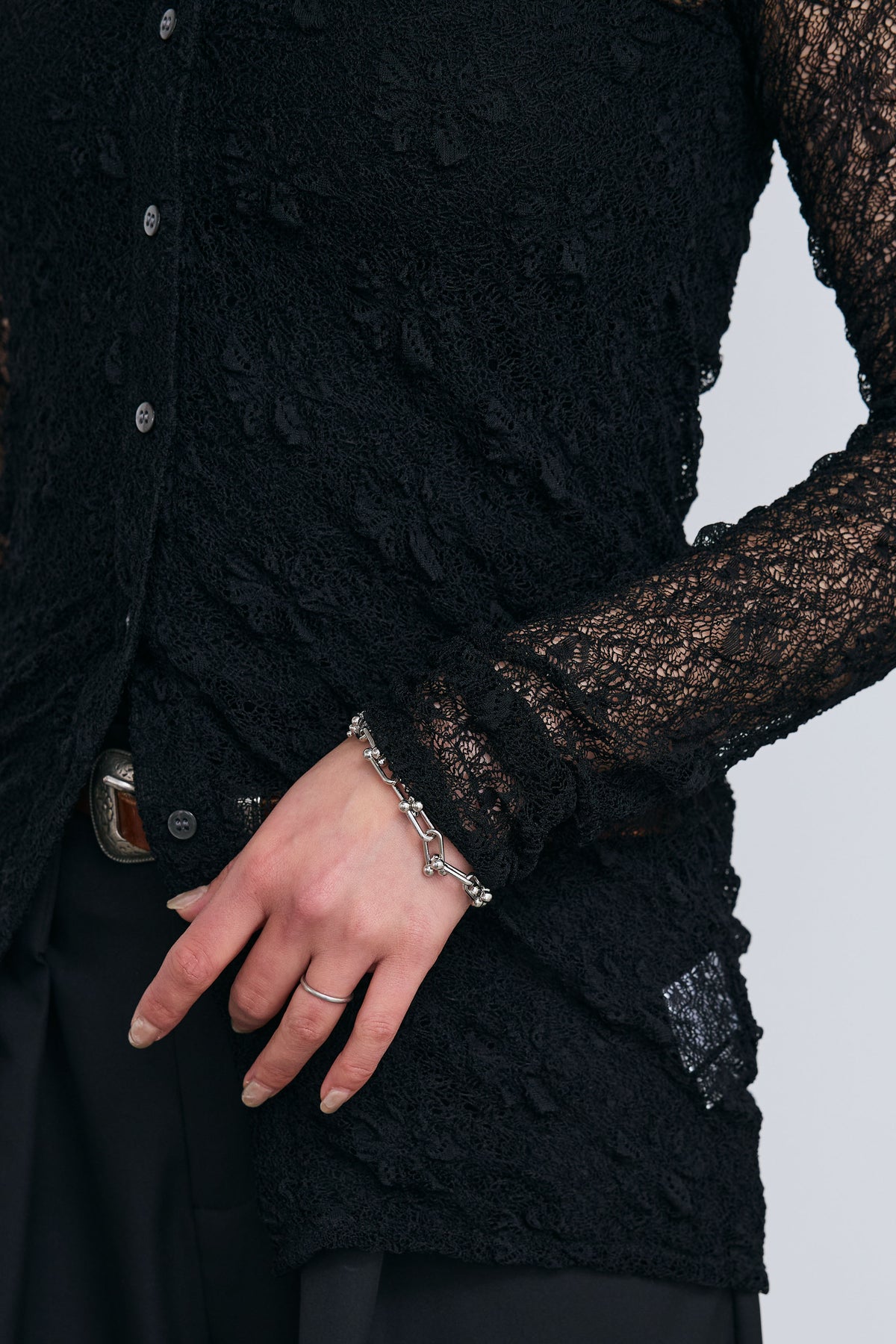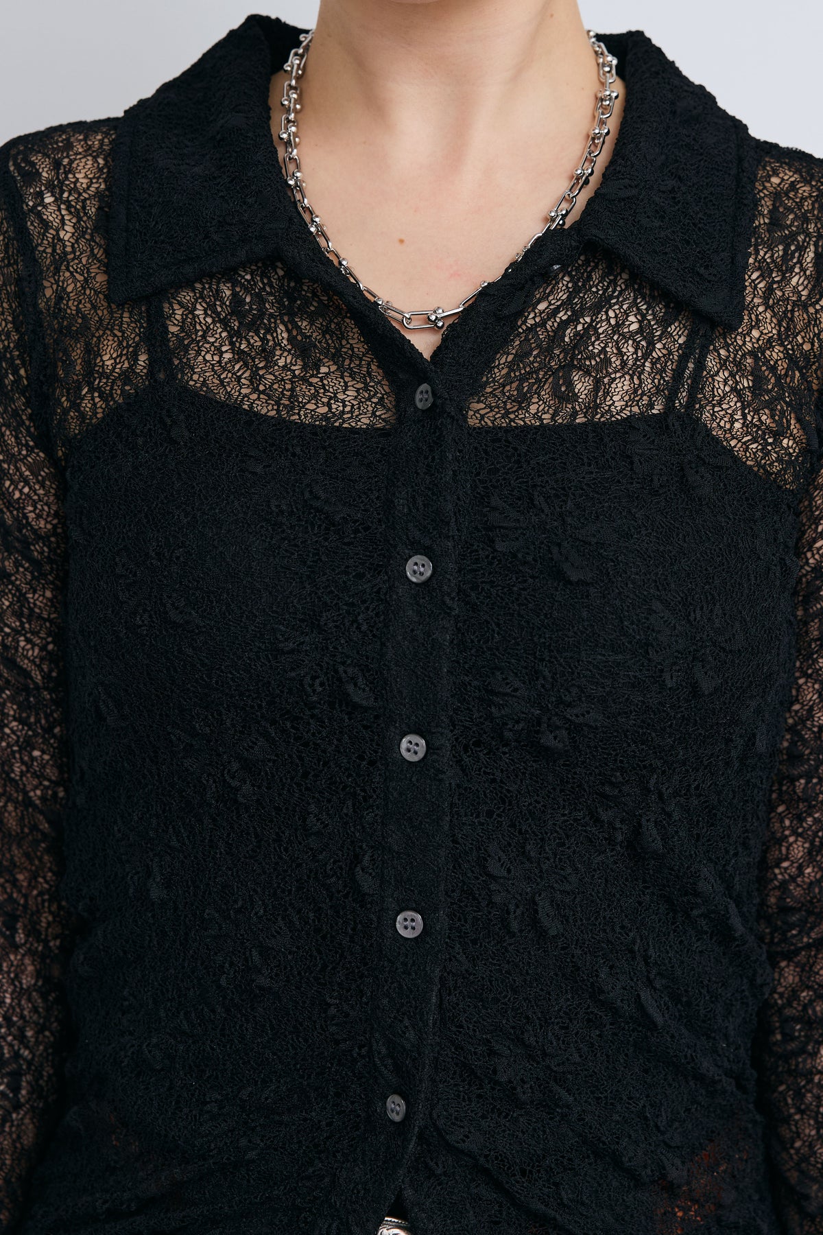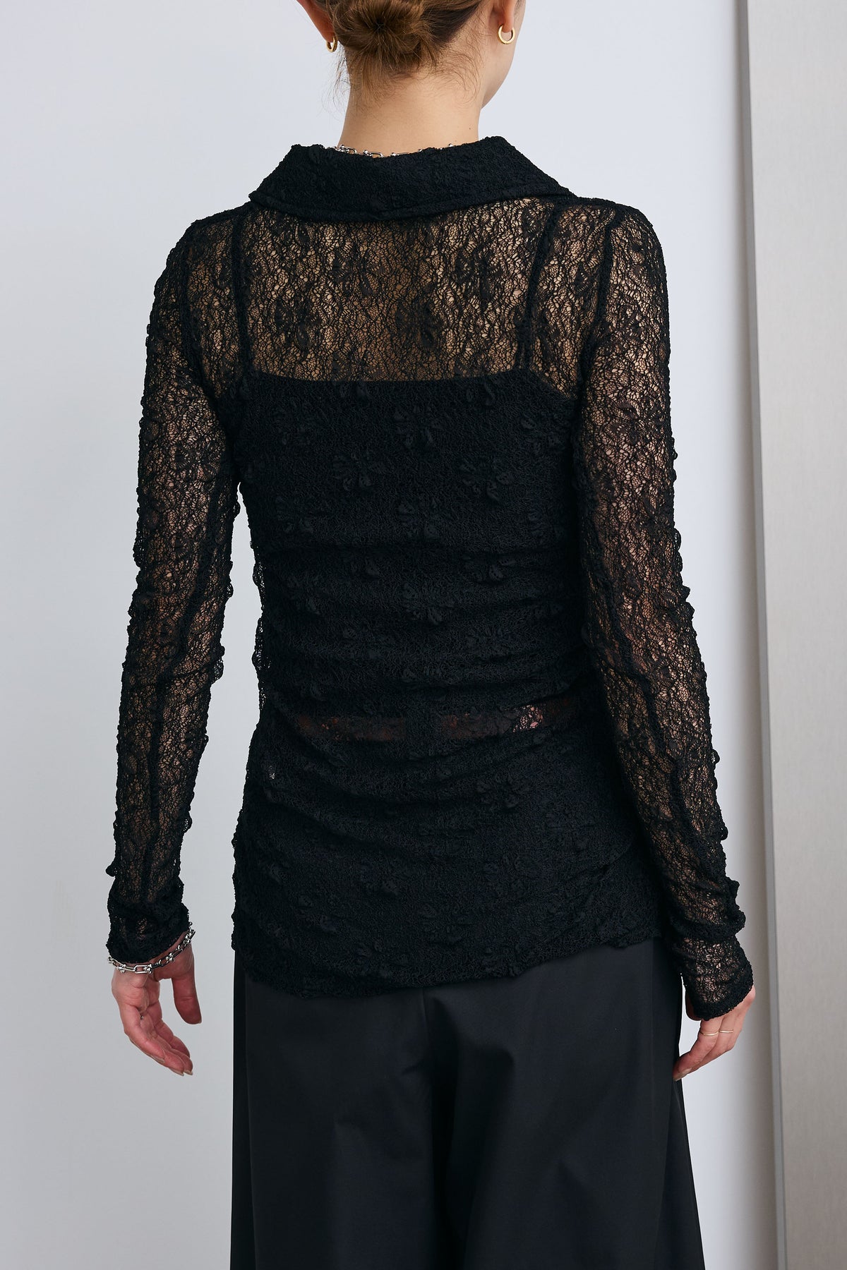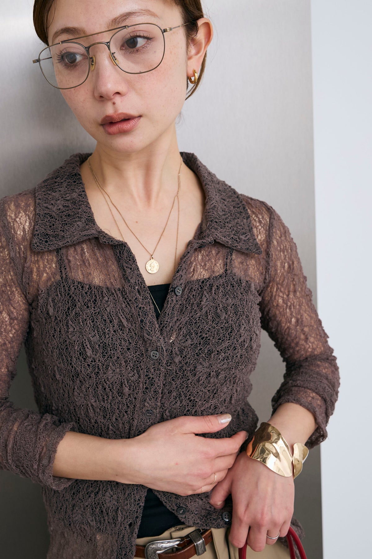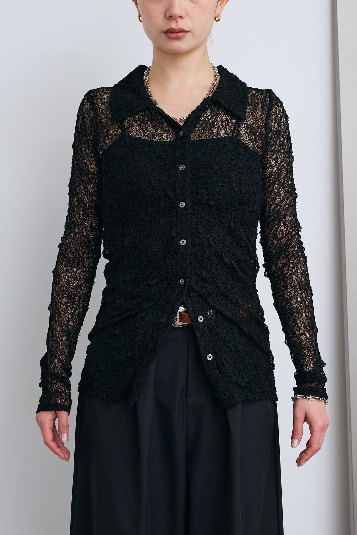 繊細なレースが軽やかな印象を引き立てる襟付きカーディガン。程よい透け感が抜けを生み、インナーとのレイヤードを楽しめるデザインです。コンパクトなシルエットと襟付きのディテールで、さりげなくきちんと感もプラス。羽織としてはもちろん、トップス感覚でも取り入れやすく、スタイリングの幅を広げてくれる一枚です。