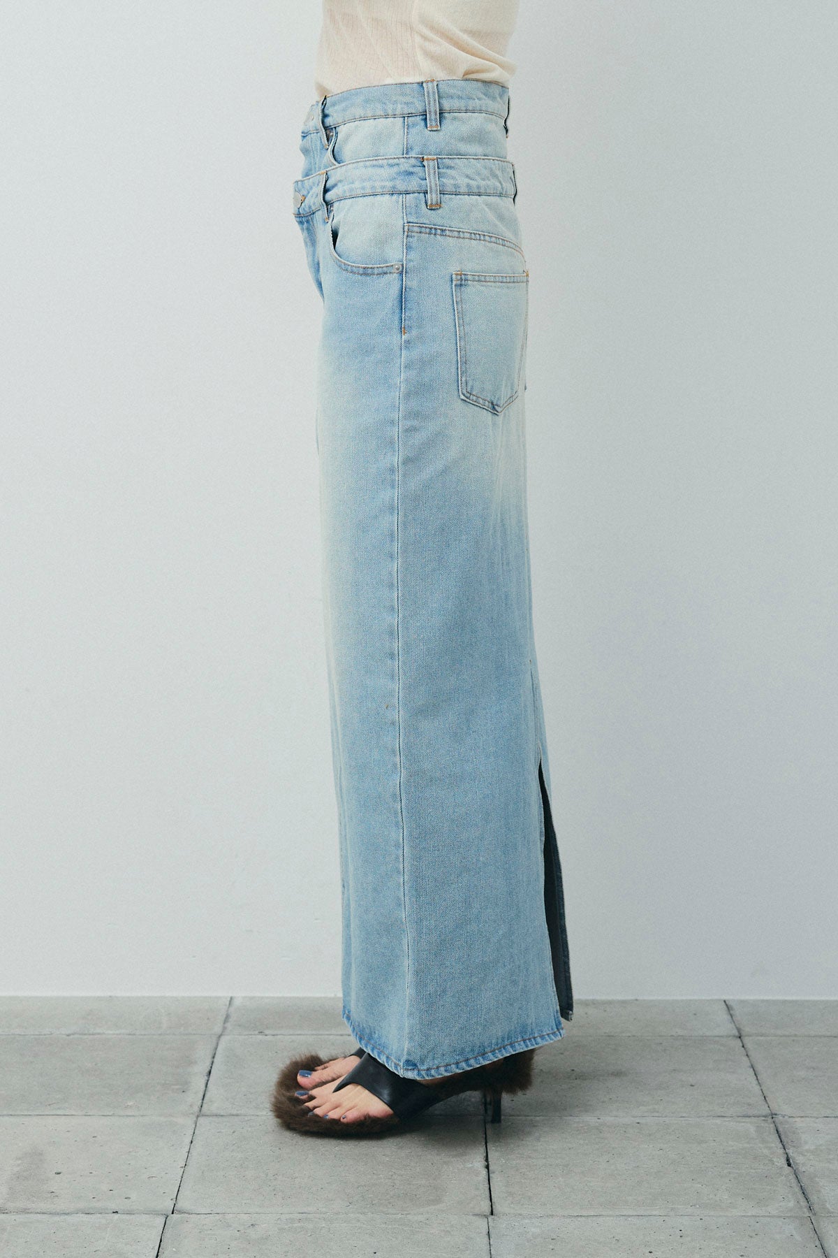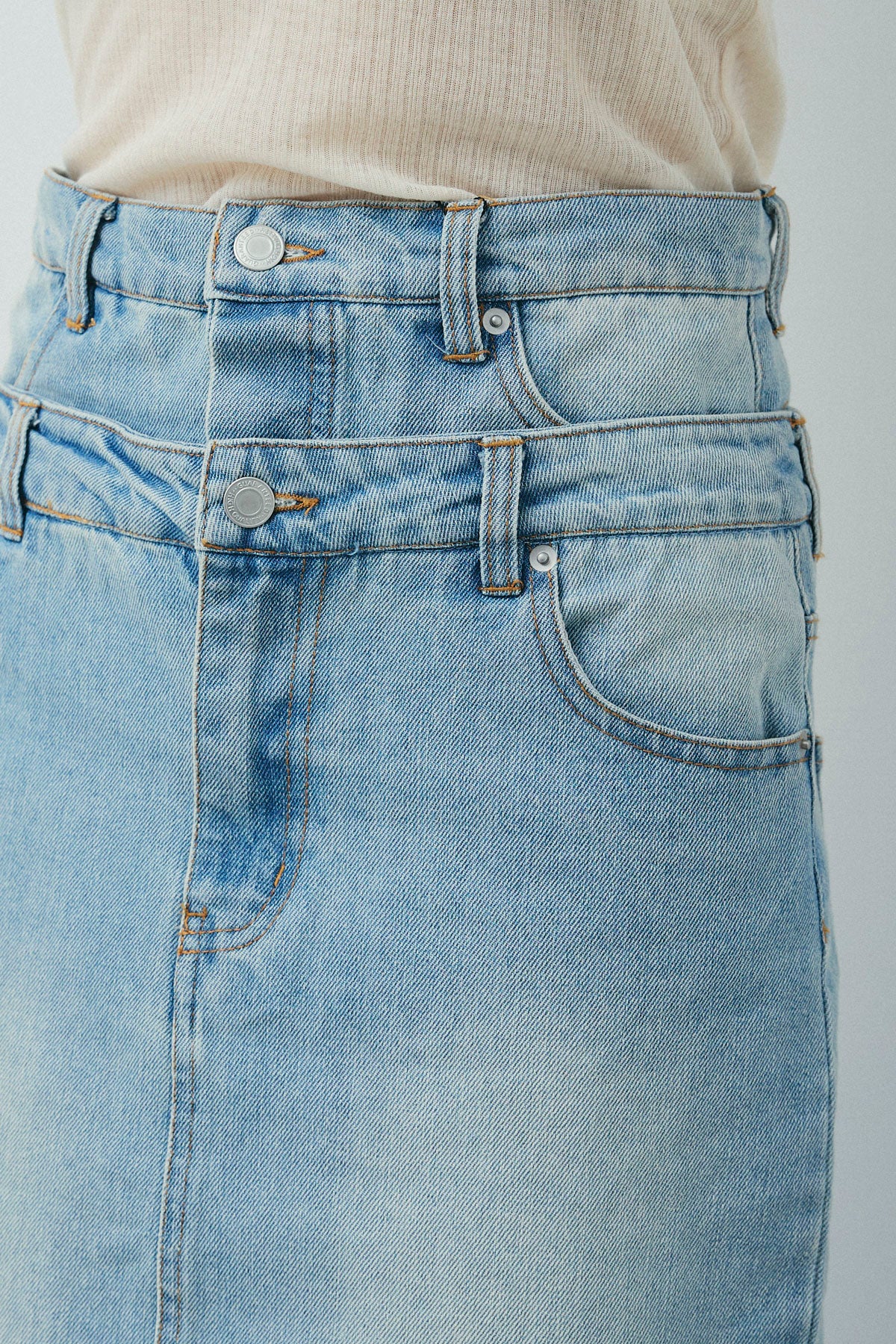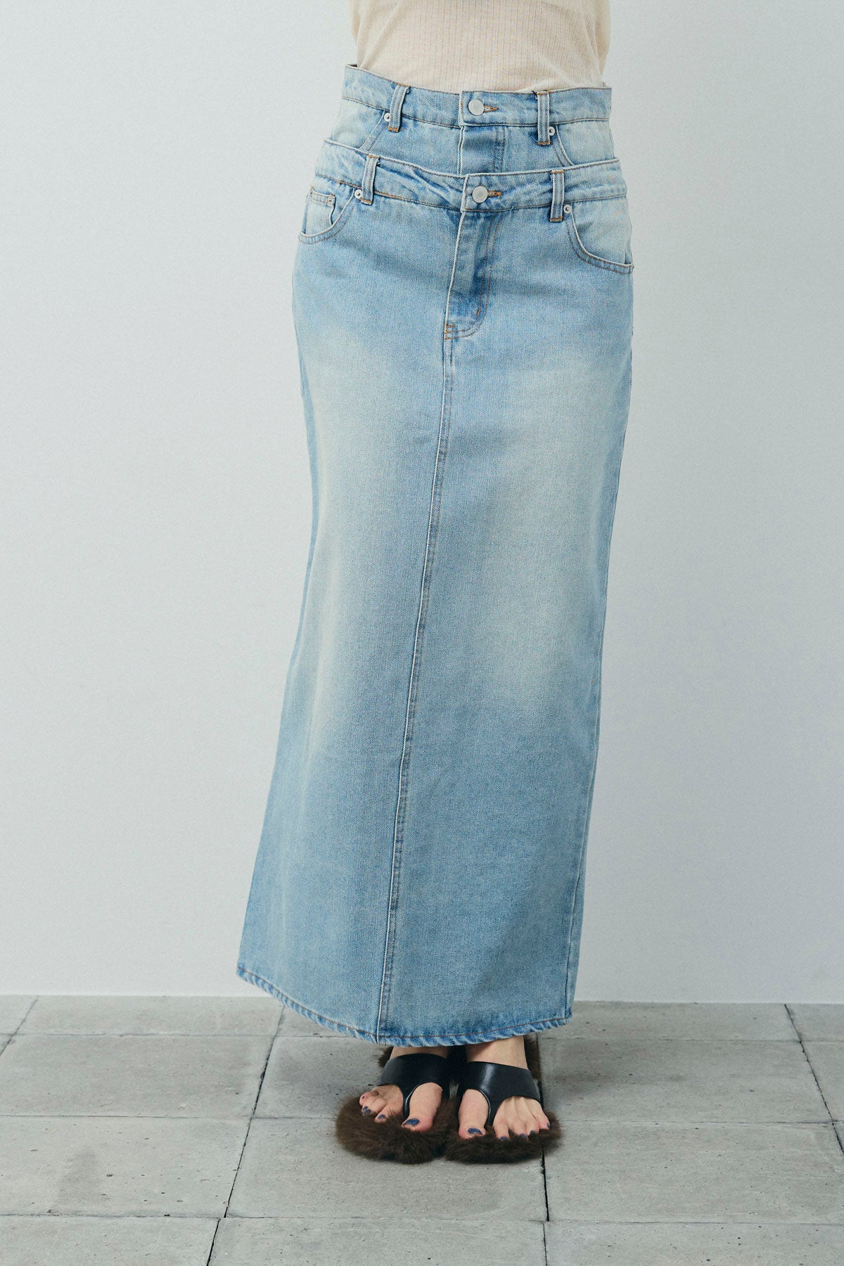 ユニークなダブルウエストデザインが目を引くデニムスカート。トレンド感のあるロングシルエットがスタイルをすっきりと見せ、こなれた雰囲気を演出。カジュアルなTシャツやタンクトップと合わせたラフな着こなしはもちろん、シャツやジャケットをプラスして大人っぽくまとめるのもおすすめ。