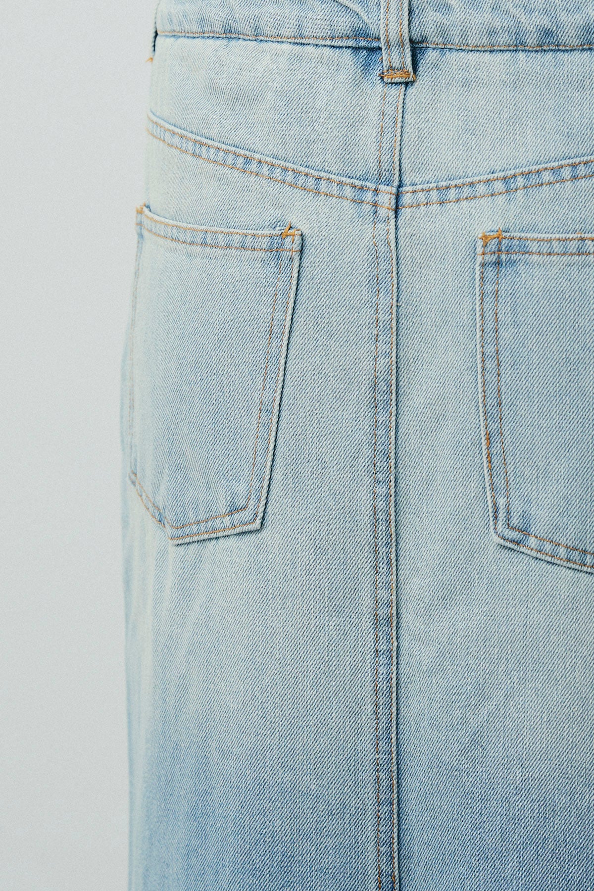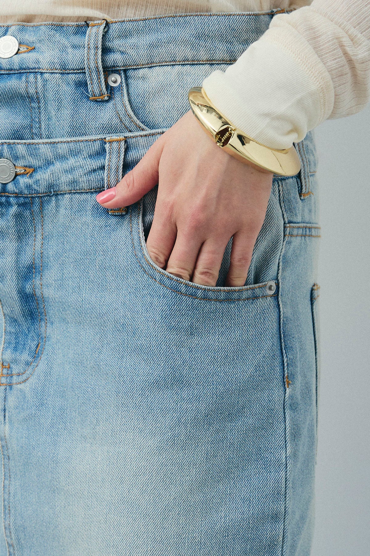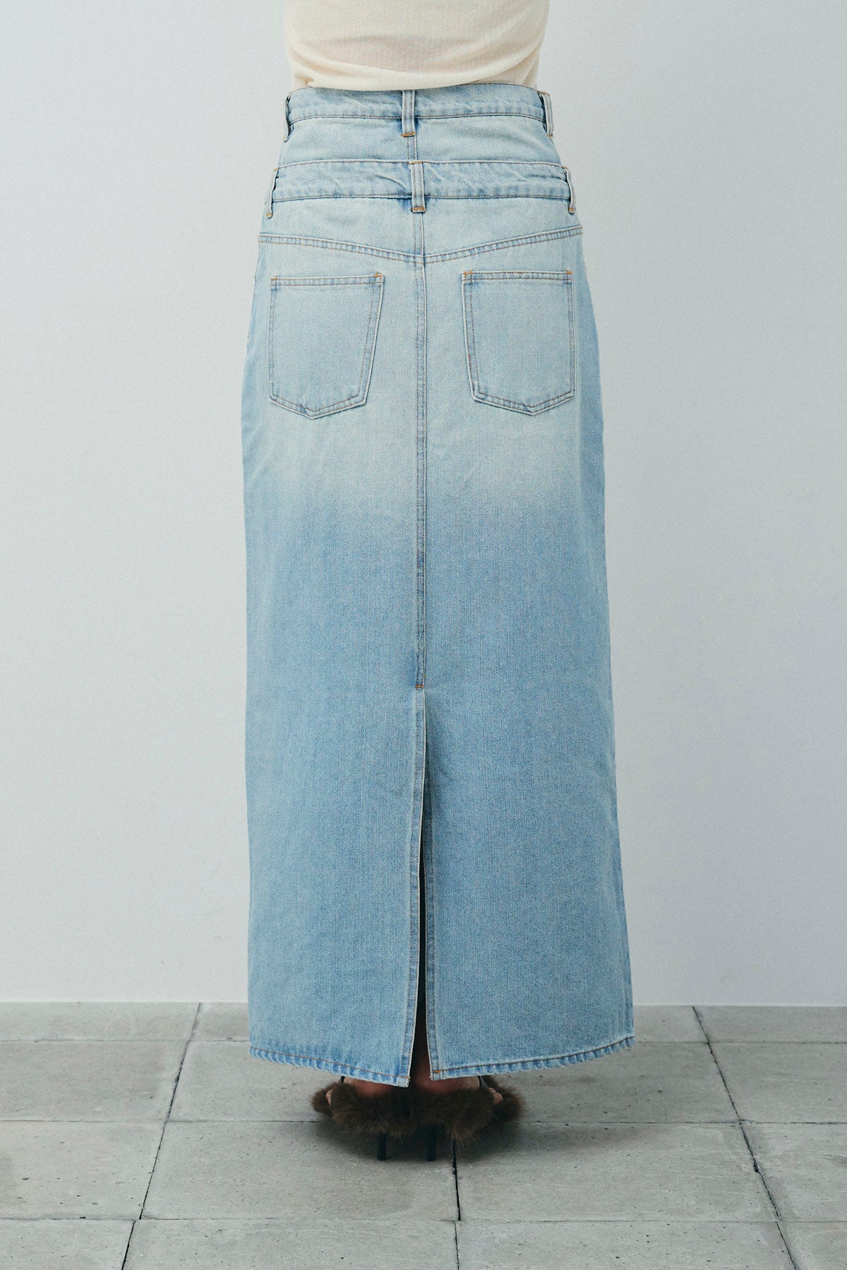 ユニークなダブルウエストデザインが目を引くデニムスカート。トレンド感のあるロングシルエットがスタイルをすっきりと見せ、こなれた雰囲気を演出。カジュアルなTシャツやタンクトップと合わせたラフな着こなしはもちろん、シャツやジャケットをプラスして大人っぽくまとめるのもおすすめ。