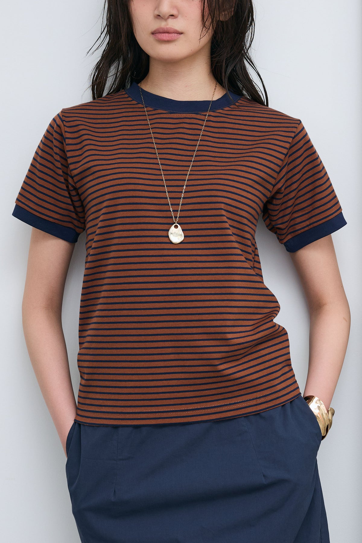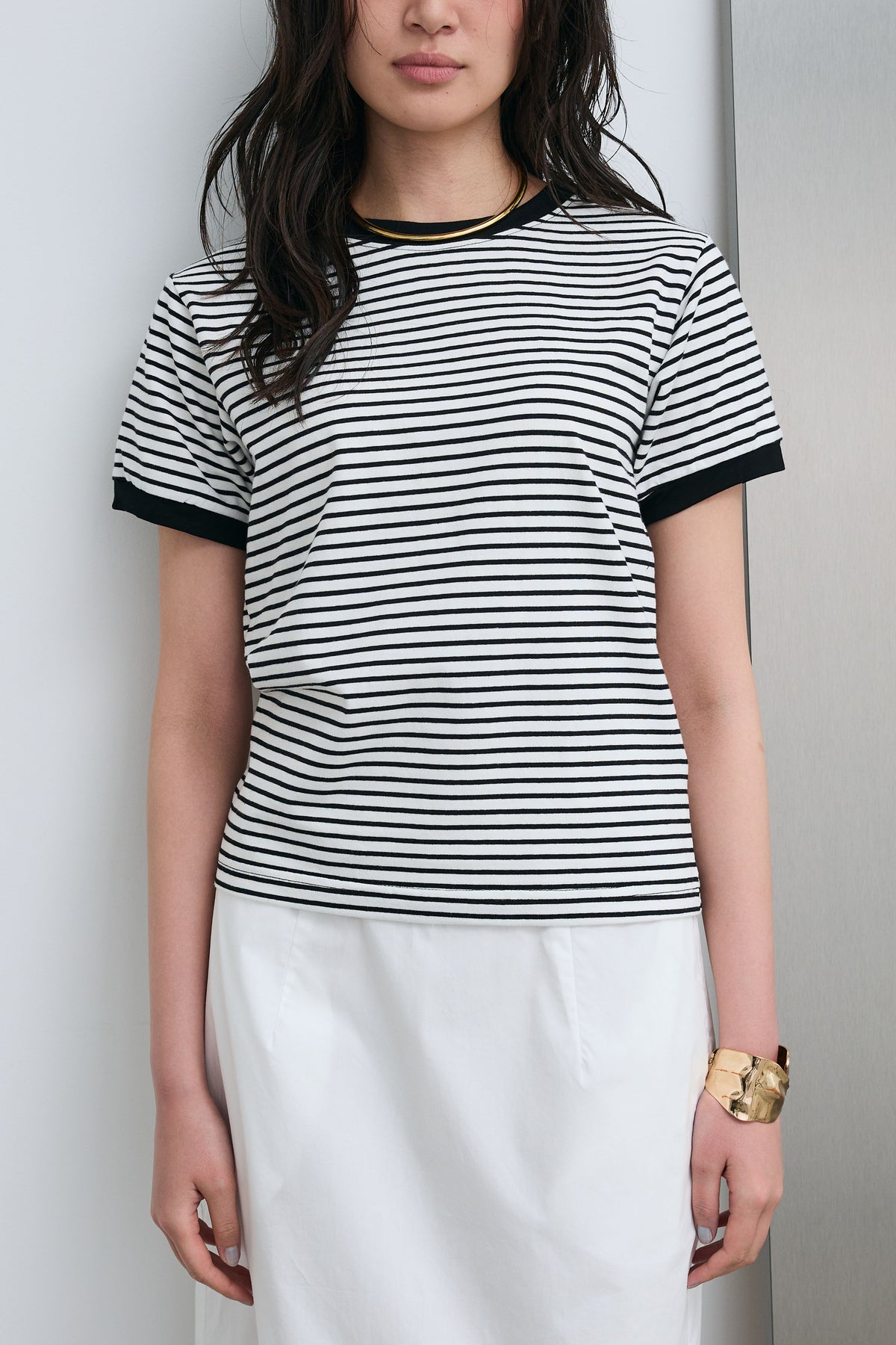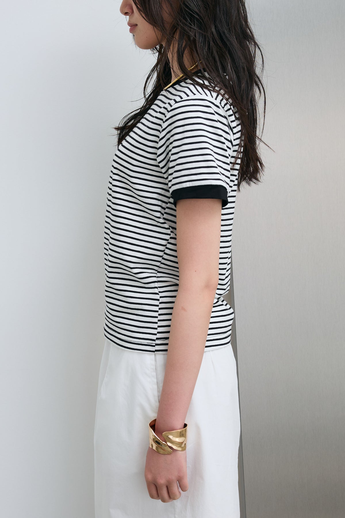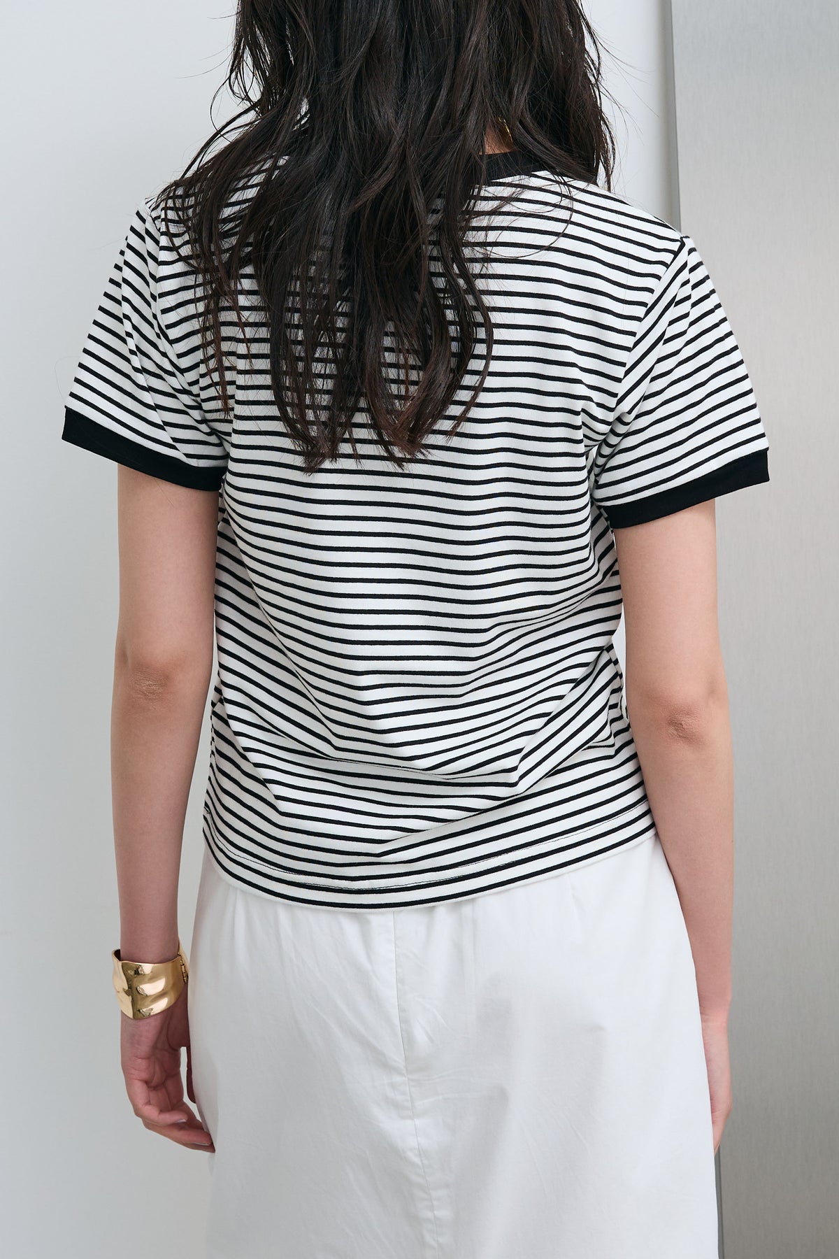 細ピッチのボーダーにリンガーデザインを組み合わせた、程よく抜け感のある一枚。ネックや袖口の配色が全体を引き締め、シンプルながらも印象的に仕上がります。コンパクトすぎないシルエットでバランスが取りやすく、パンツにもスカートにもすっと馴染む着回し力の高いアイテムです。