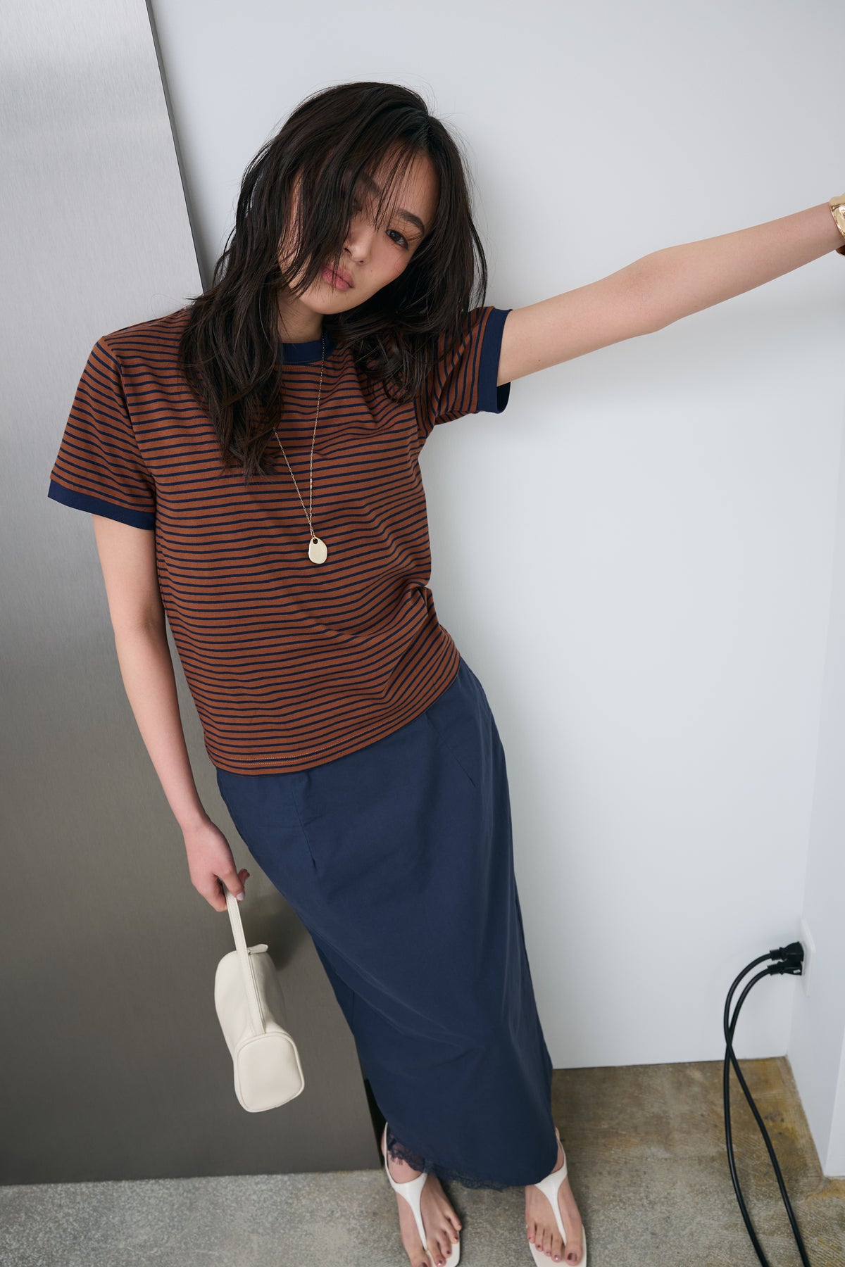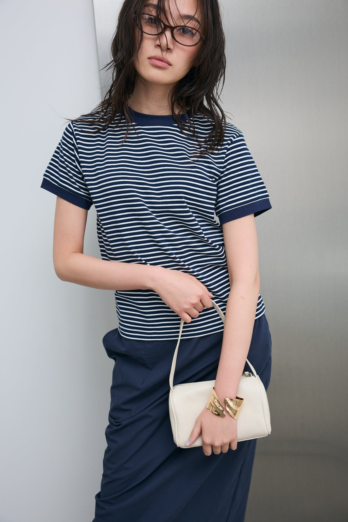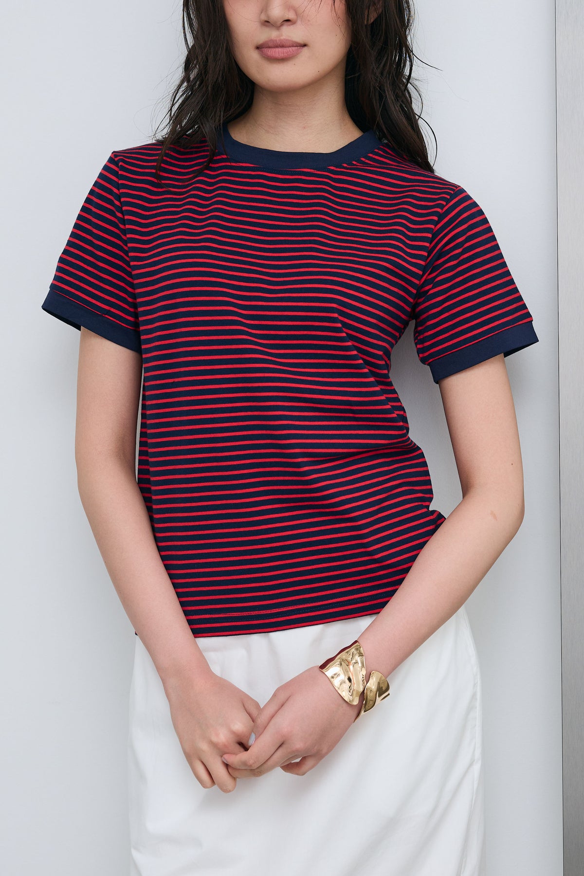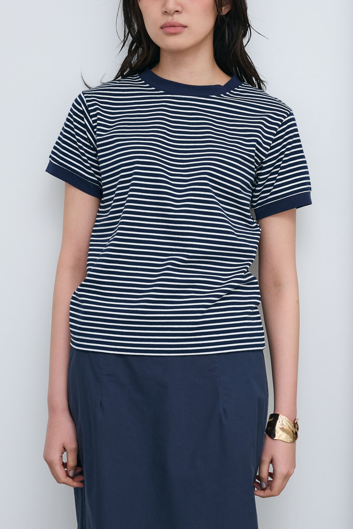 細ピッチのボーダーにリンガーデザインを組み合わせた、程よく抜け感のある一枚。ネックや袖口の配色が全体を引き締め、シンプルながらも印象的に仕上がります。コンパクトすぎないシルエットでバランスが取りやすく、パンツにもスカートにもすっと馴染む着回し力の高いアイテムです。