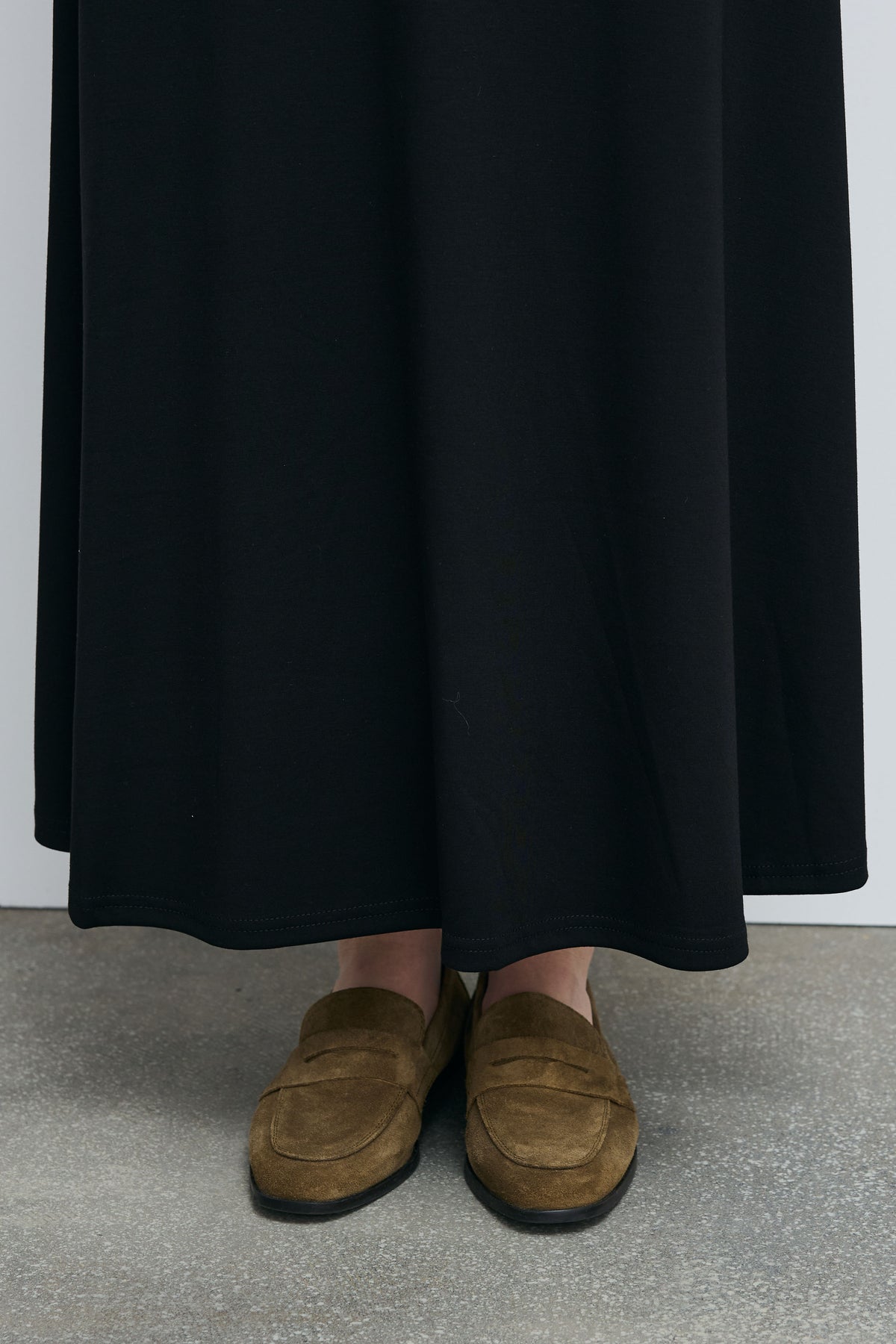 しなやかな落ち感が美しいシルエットを描くジャージースカート。ダブルフェイスならではのほどよい厚みと滑らかな肌触りで、ストレスフリーな穿き心地に仕上げました。無駄を削ぎ落としたミニマルなデザインが、上品で落ち着いた印象を引き立てます。裾に向かって緩やかに広がるラインが動きにニュアンスを生み、シンプルながらも洗練された佇まいに。デイリーからきれいめなシーンまで幅広く活躍する一着です。