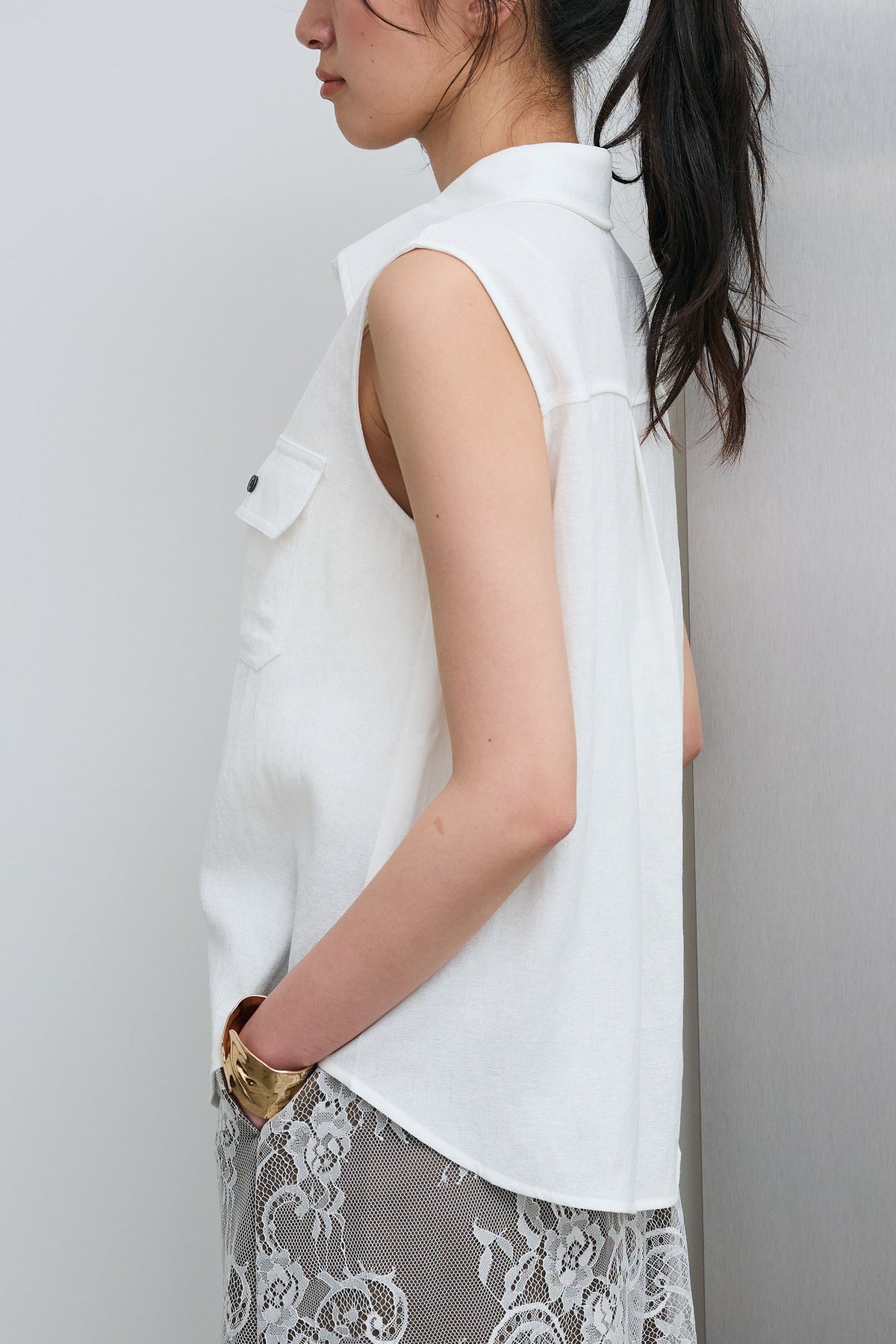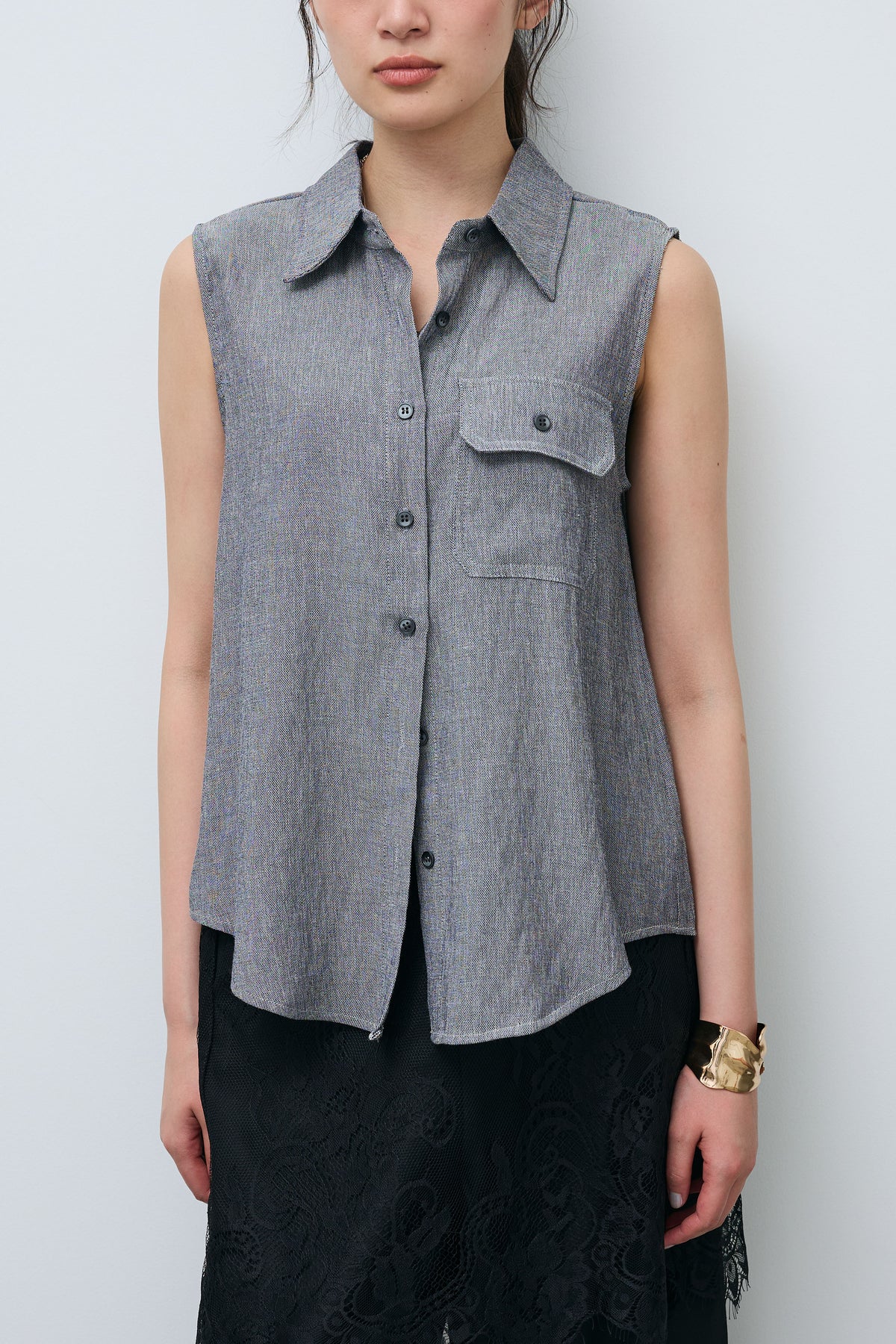 すっきりとしたノースリーブデザインに、胸元のポケットがさりげないアクセントを添えるシャツ。軽やかな素材感で、さらりとした着心地が魅力の一着です。程よくゆとりのあるシルエットが抜け感を生み、シンプルながらもこなれた印象に。ボタンを開けて羽織りとしても使いやすく、幅広いスタイリングに取り入れやすいアイテムです。
