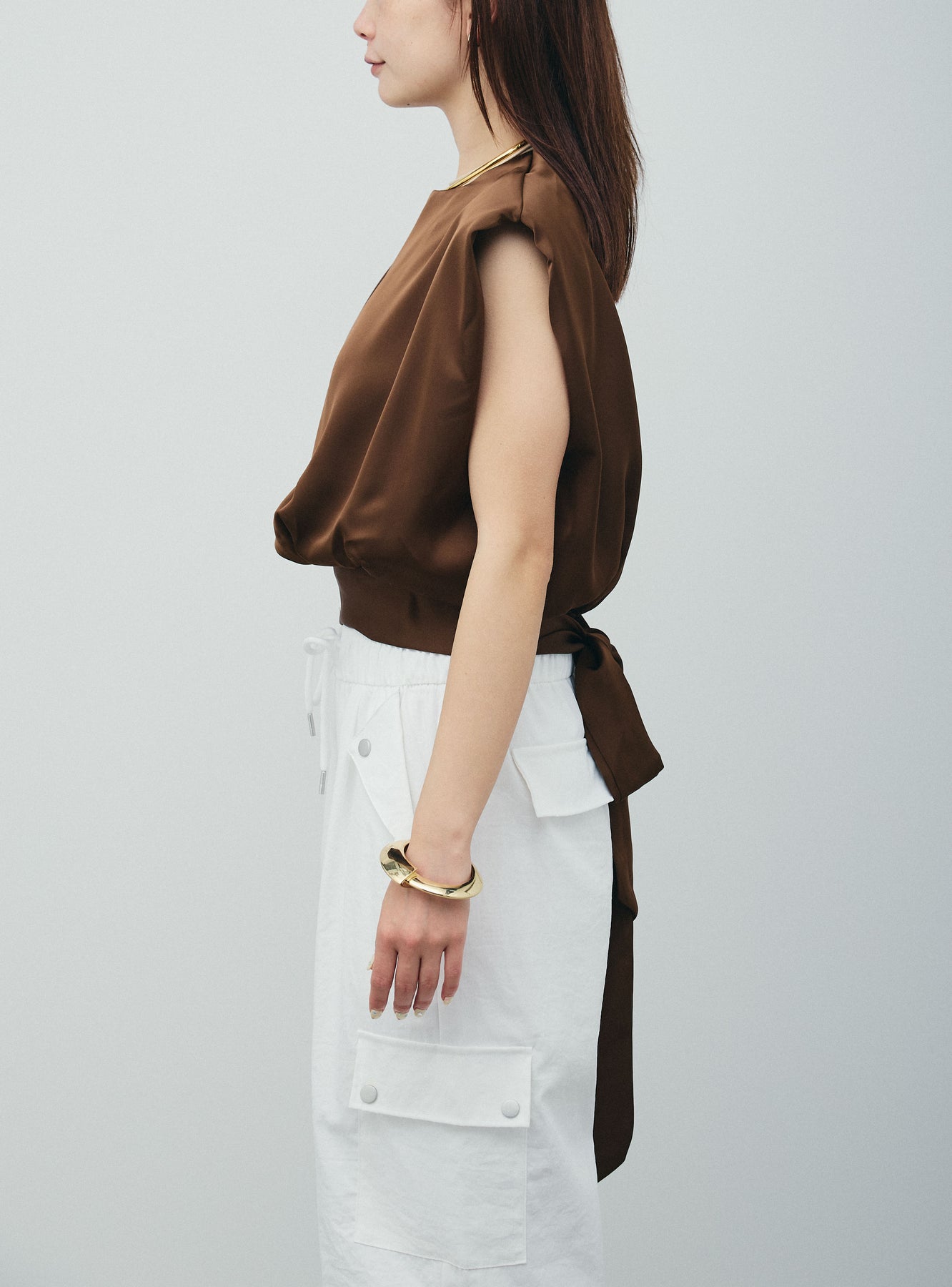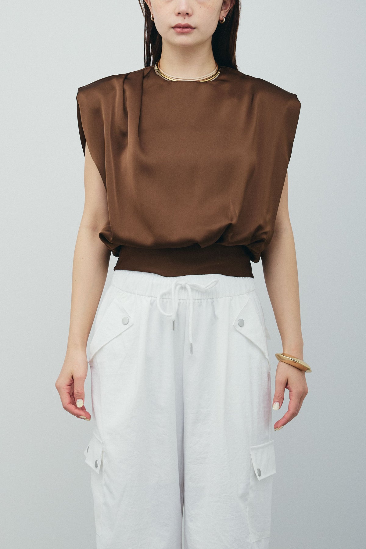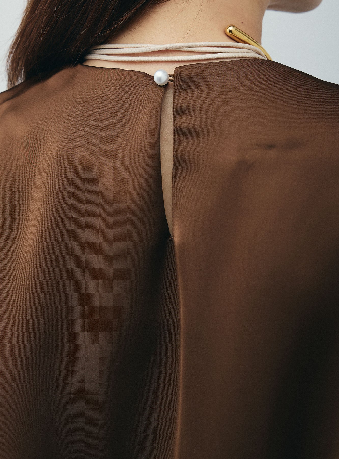 サテン素材のブラウスで、アシンメトリーなデザインが特徴的です。ドレープが美しく、シンプルながらも動きのあるスタイルが楽しめます。ブラウンカラーは落ち着いた印象を与え、シックなコーディネートにぴったりです。