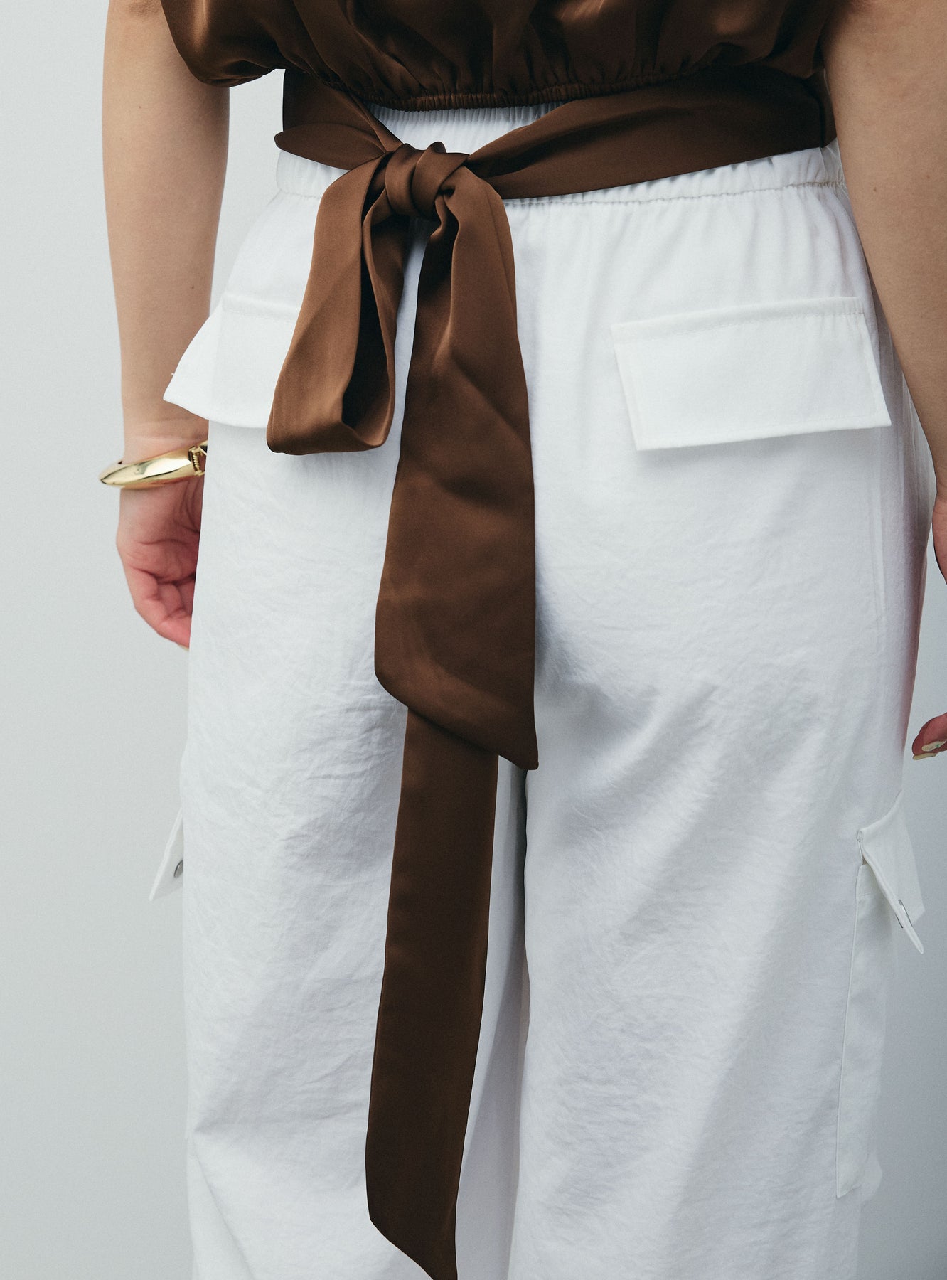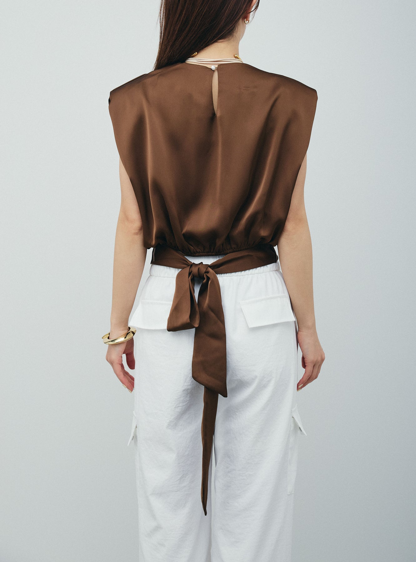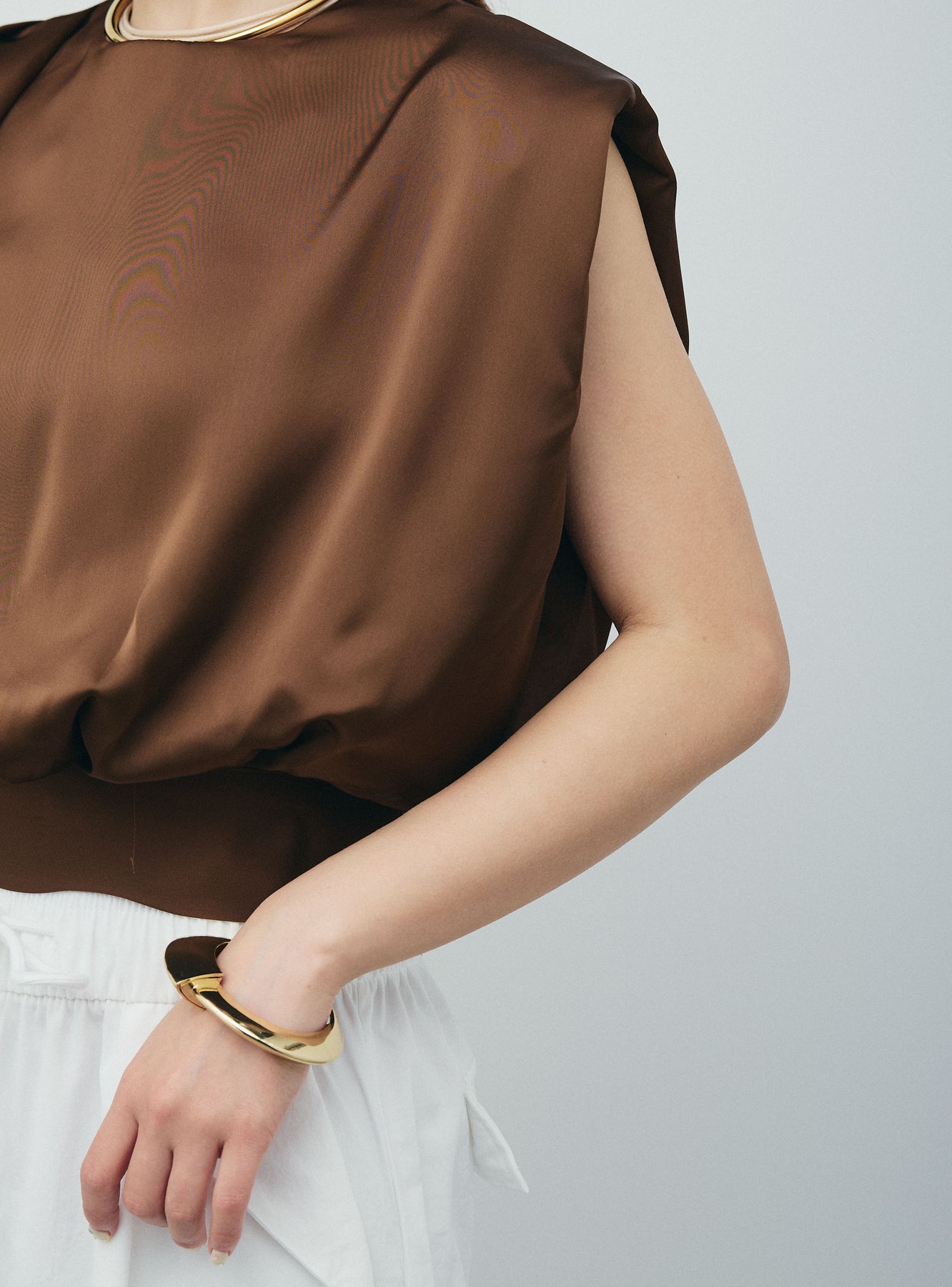 サテン素材のブラウスで、アシンメトリーなデザインが特徴的です。ドレープが美しく、シンプルながらも動きのあるスタイルが楽しめます。ブラウンカラーは落ち着いた印象を与え、シックなコーディネートにぴったりです。