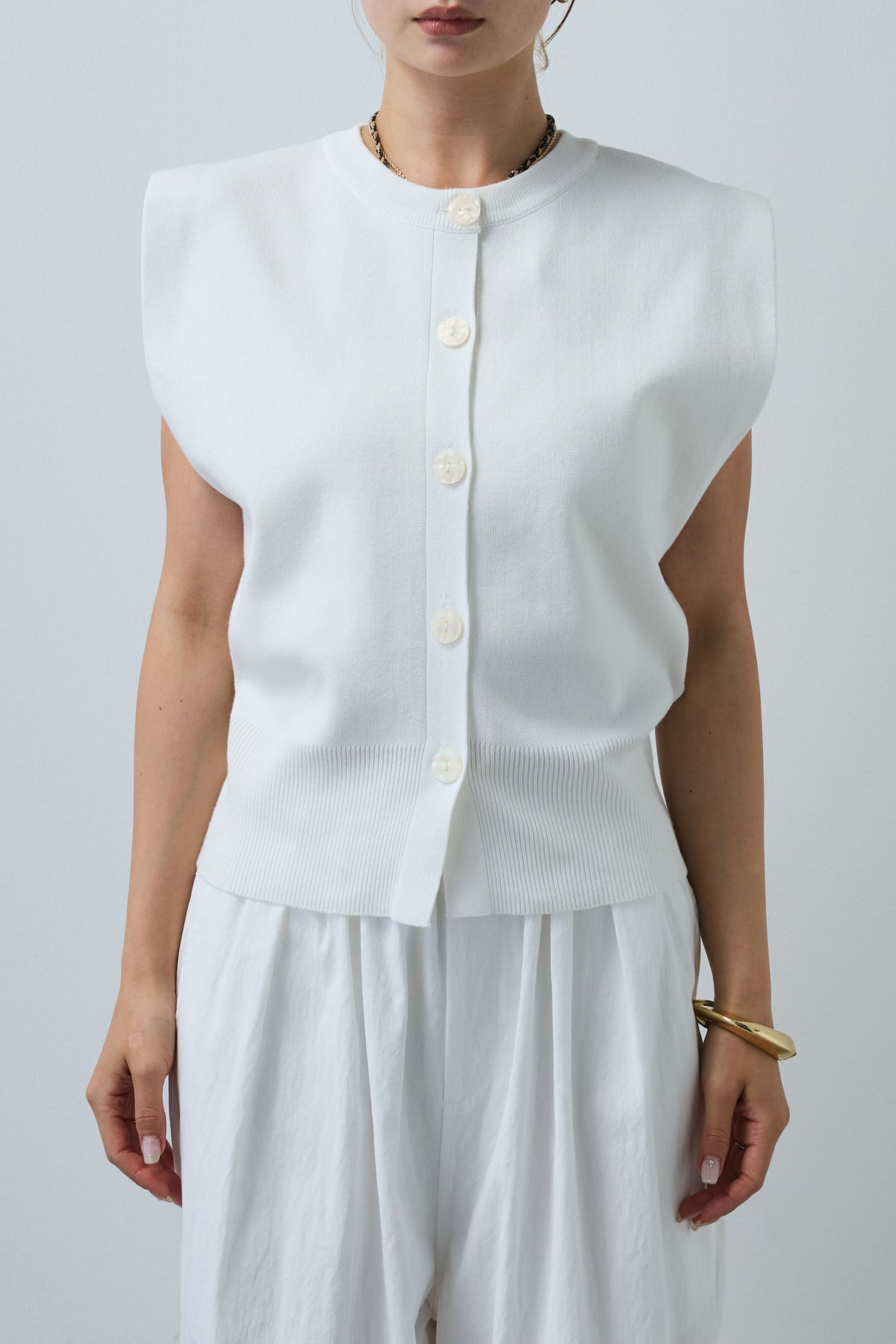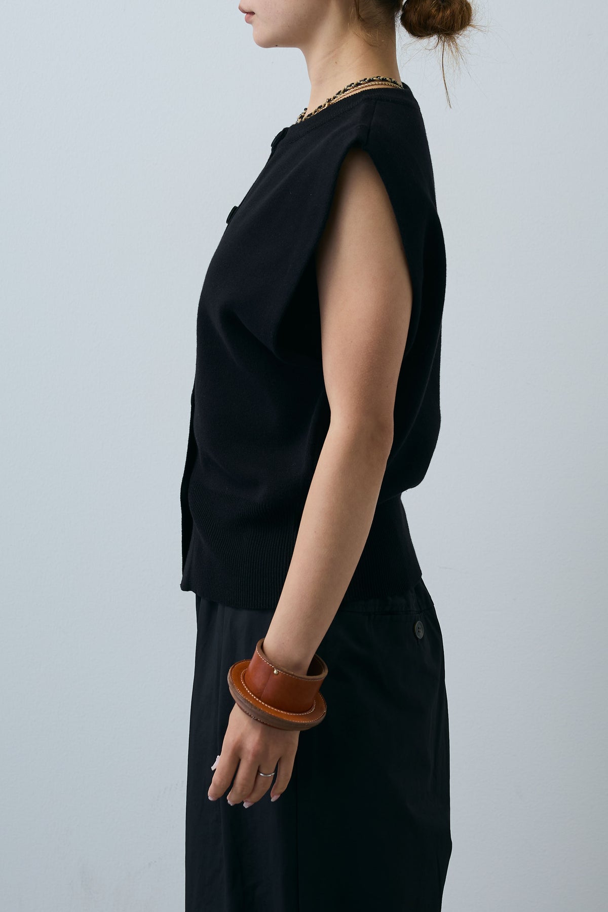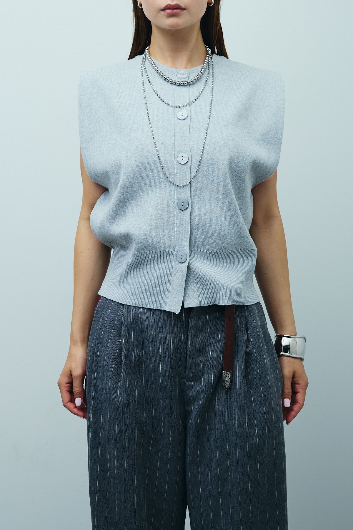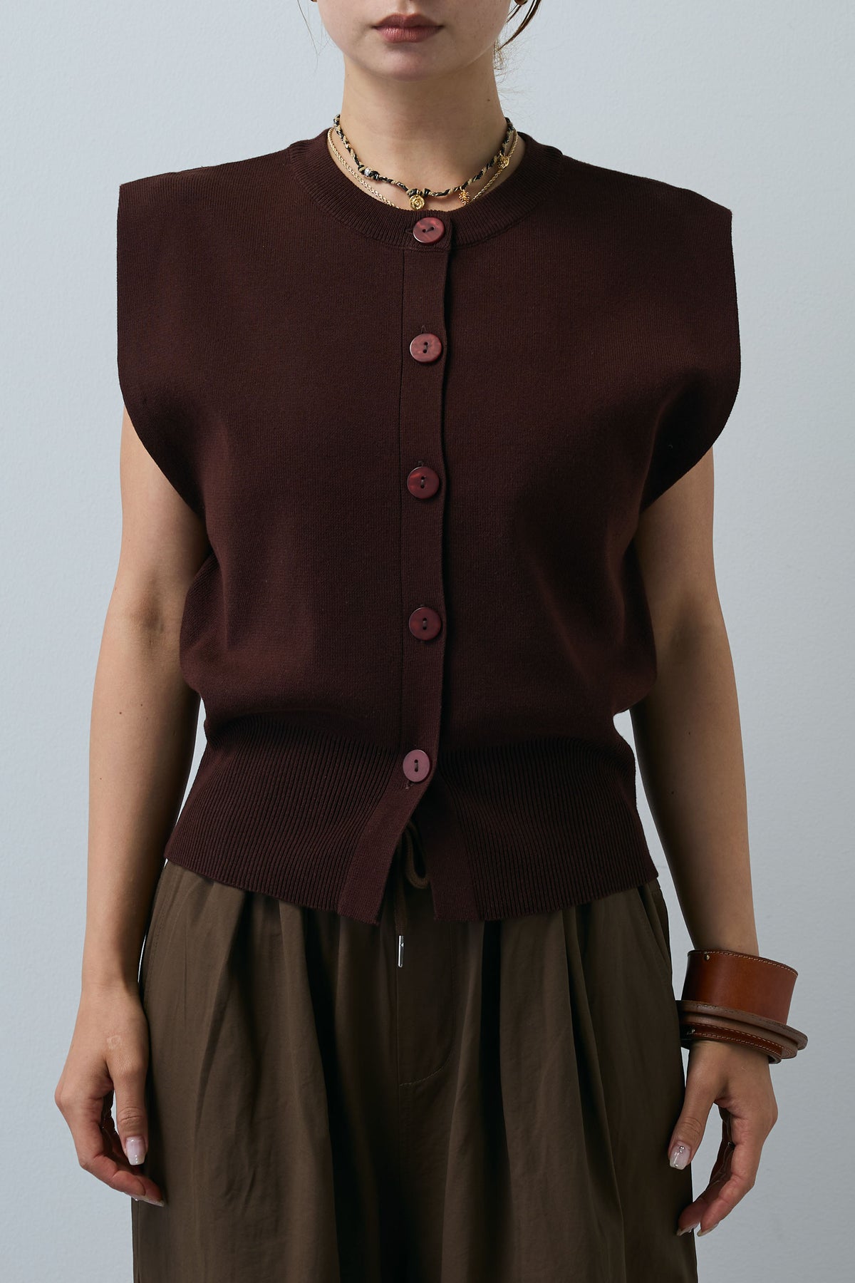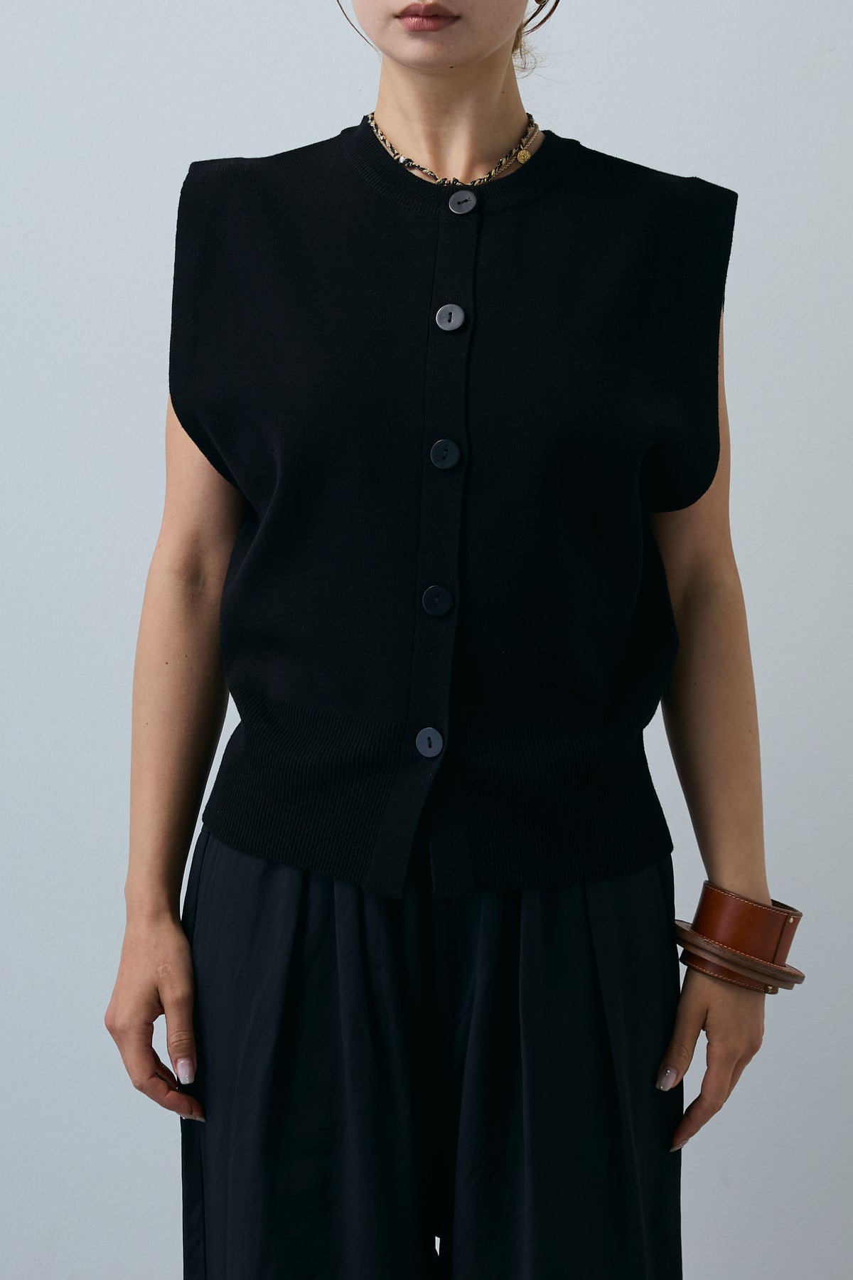 ゆったりとしたボクシーシルエットが魅力のニットベスト。厚みのあるリブ編みが立体感を生み出し、シンプルながらも存在感のある一枚です。フロントのボタンを留めても開けても様になり、シャツやワンピースとのレイヤードにも最適。ロングシーズン活躍する万能アイテムです。