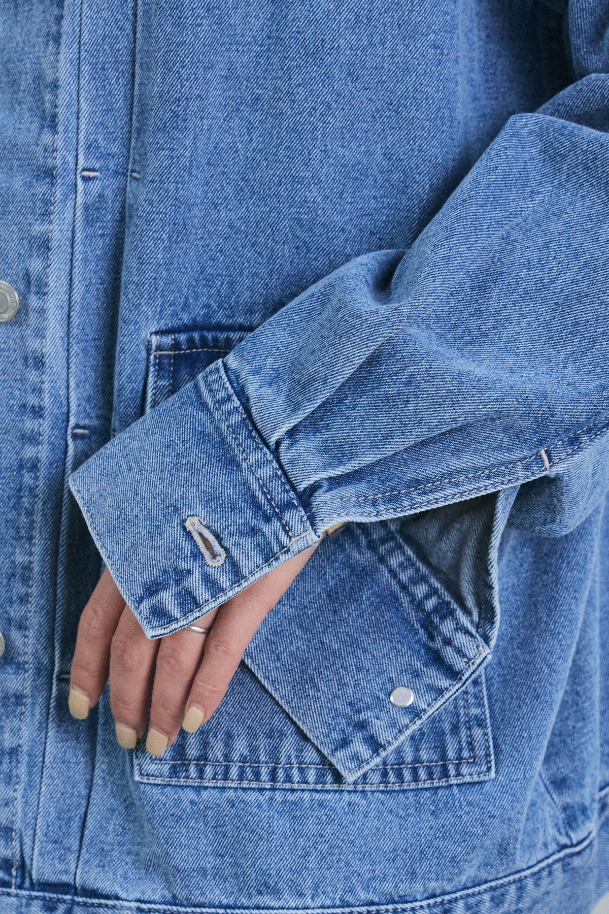 すっきりとしたノーカラーデザインが特徴のデニムジャケット。程よいオーバーサイズシルエットで抜け感を演出しつつ、軽やかな着心地が魅力です。どんなインナーにも合わせやすく、シャツやハイネックとのレイヤードにもおすすめ。カジュアルながらもこなれた雰囲気を楽しめる一着です。