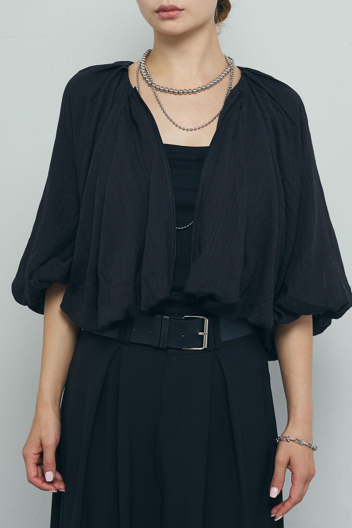 ガーゼバルーンショートブルゾンは、軽やかなガーゼ素材で作られたショート丈のブルゾンです。ふわっとしたバルーンシルエットが特徴で、体型を気にせずリラックスして着られます。ジッパーで前開きができるデザインで、シンプルながらもアクセントの効いた仕上がり。カジュアルにもきれいめにも合わせやすいアイテムで、春や秋の軽い羽織りとして活躍します。どんなコーディネートにもさっと羽織るだけで、スタイルアップを叶える一枚です。