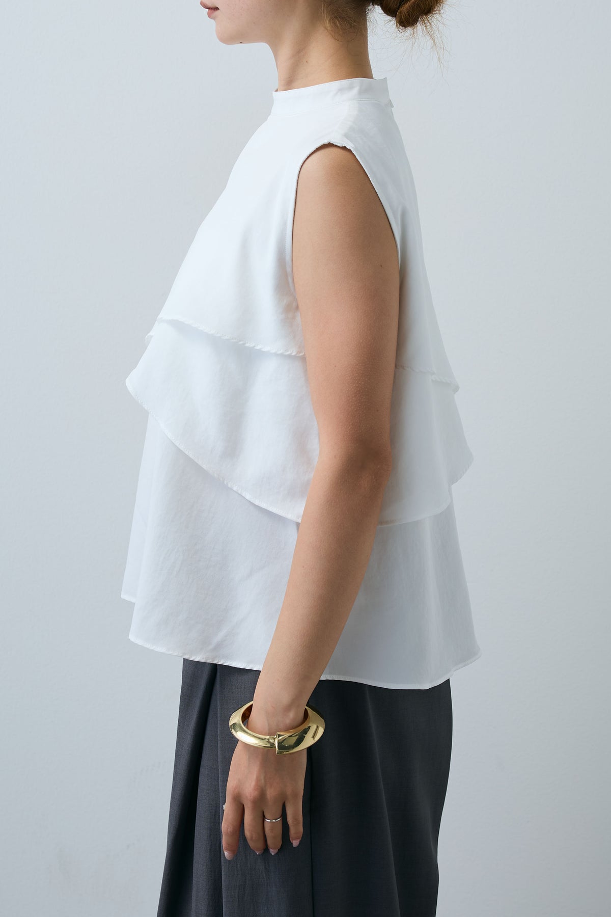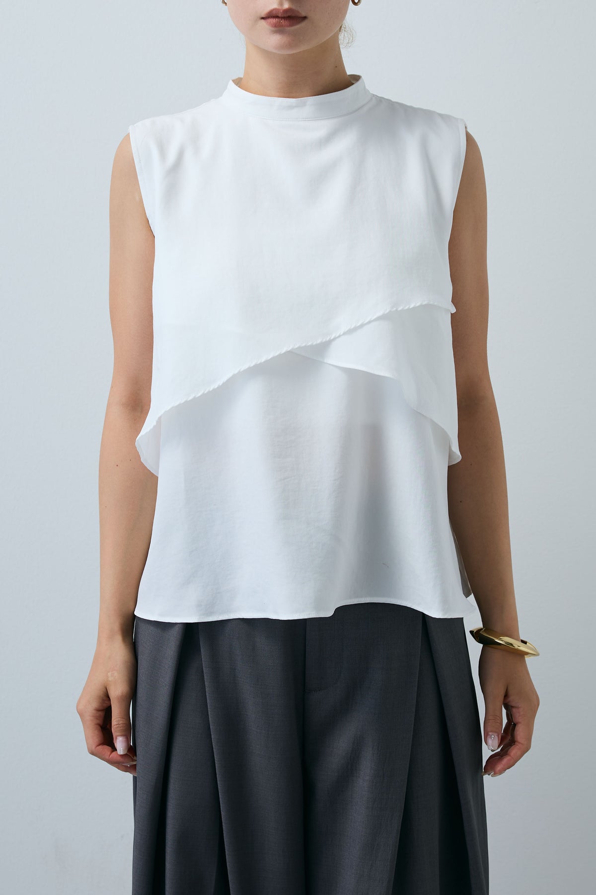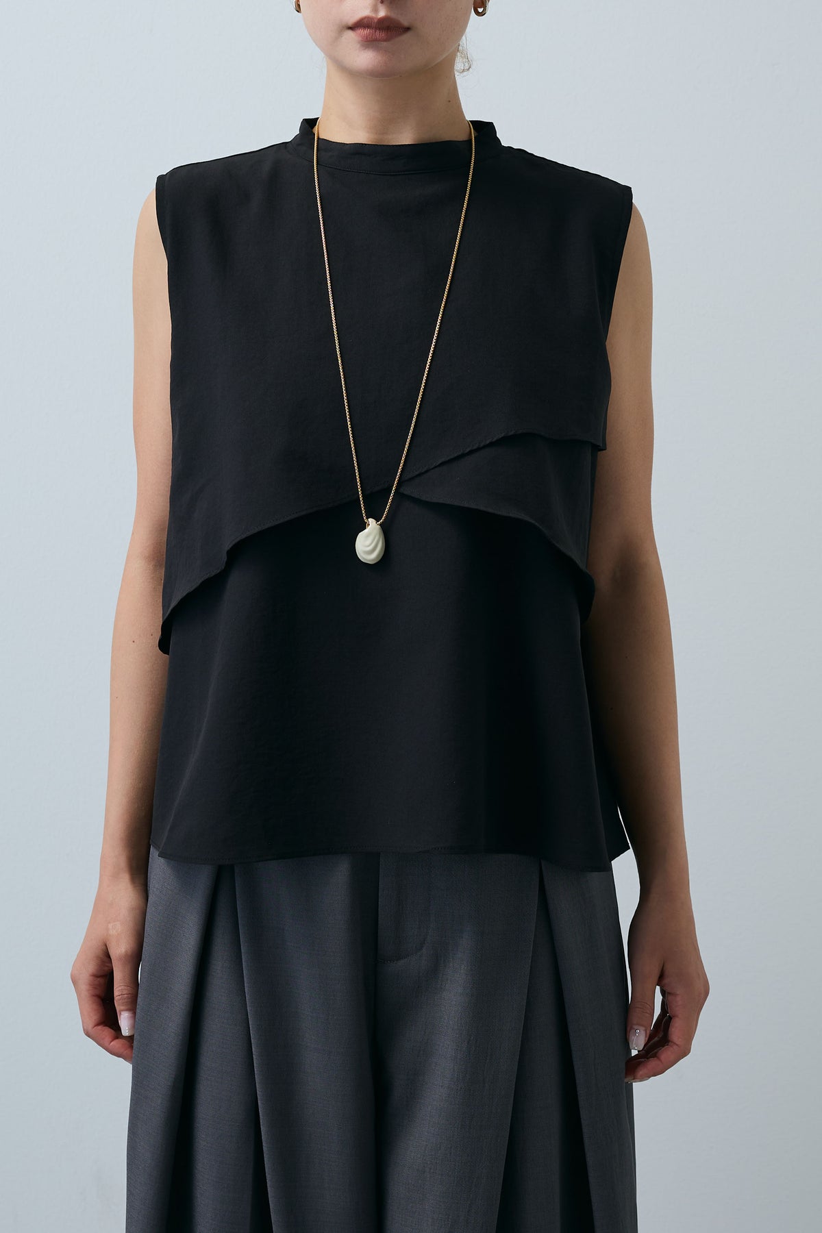 動きのあるアシンメトリーフレアが目を惹くノースリーブブラウス。シンプルながらも計算された立体感が、着るだけで印象的なスタイルに。さらりと軽やかな素材感で、一枚で着映えが叶う万能アイテムです。
